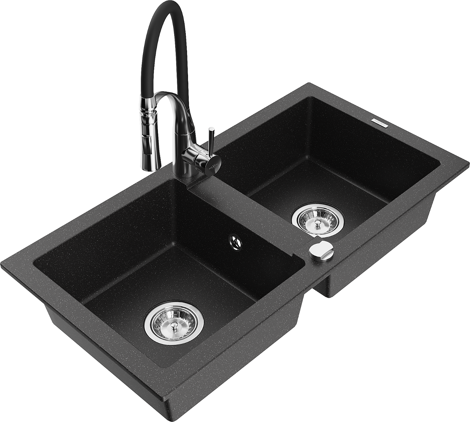 Mexen Mario granitový drez 2-komorový s kuchynskou batériou Aster, čierny/strieborný metalik - 6504-73-73450-07