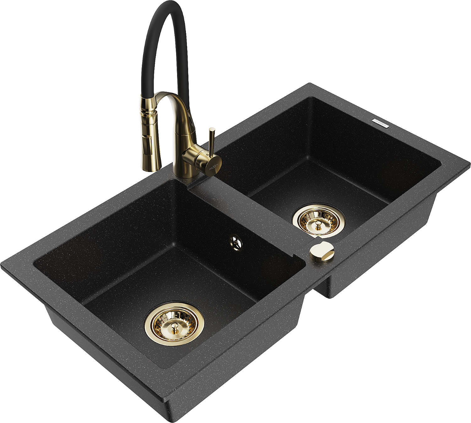 Mexen Mario dvojkomorový granitový drez s kuchynskou batériou Aster, čierny/strieborný metalik - 6504-73-73450-57-G
