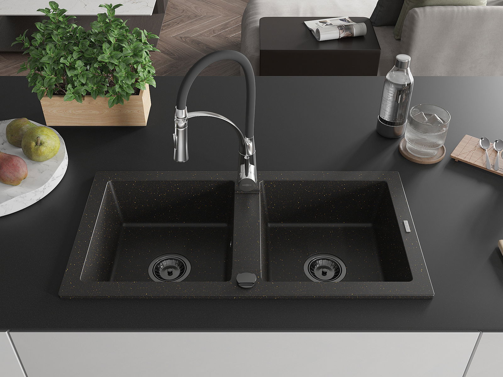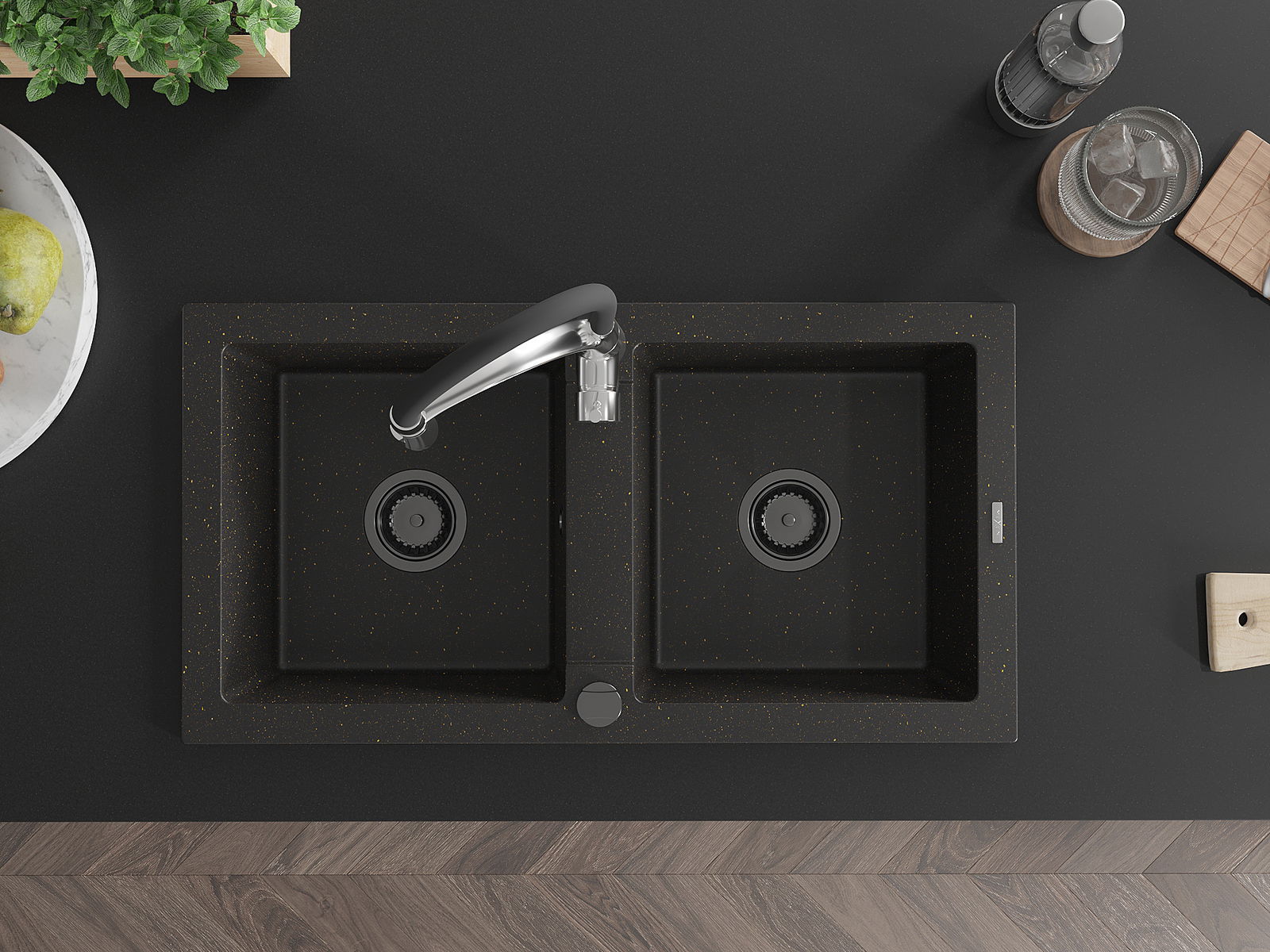 Mexen Mario žulový drez 2-komorový s kuchynskou batériou Aster, čierny/zlatý metalik - 6504-75-73450-07-B
