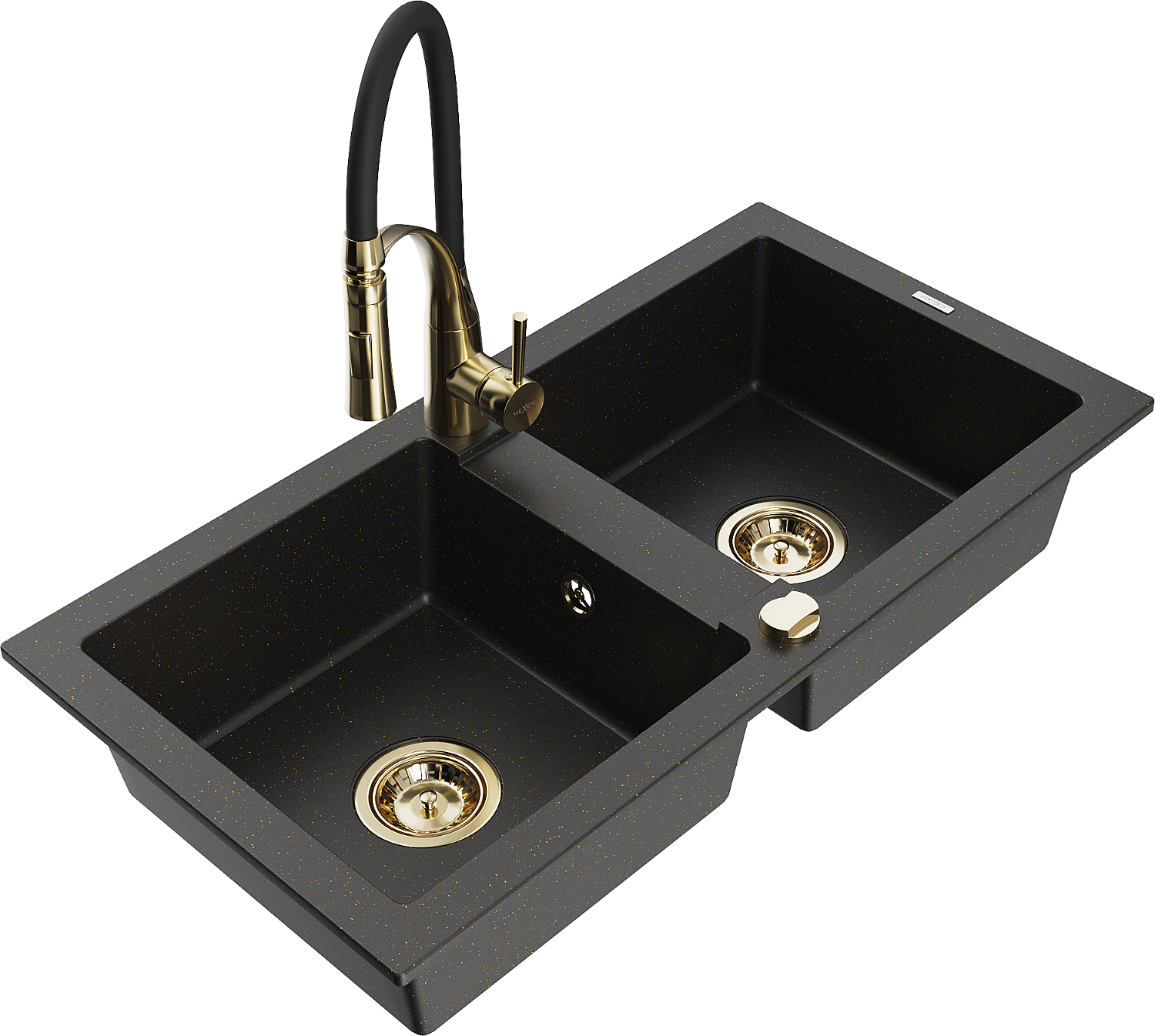 Mexen Mario granitový drez 2-komorový s kuchynskou batériou Aster, čierny/zlatý metalik - 6504-75-73450-57-G