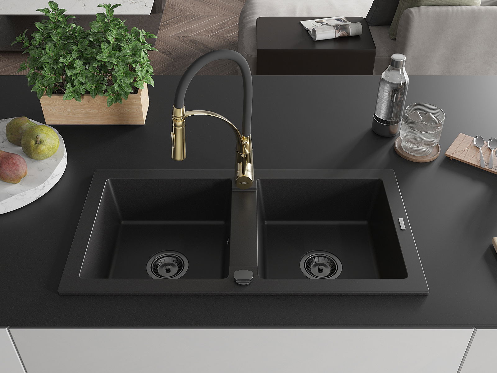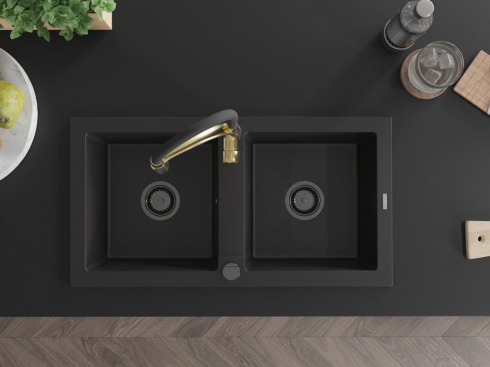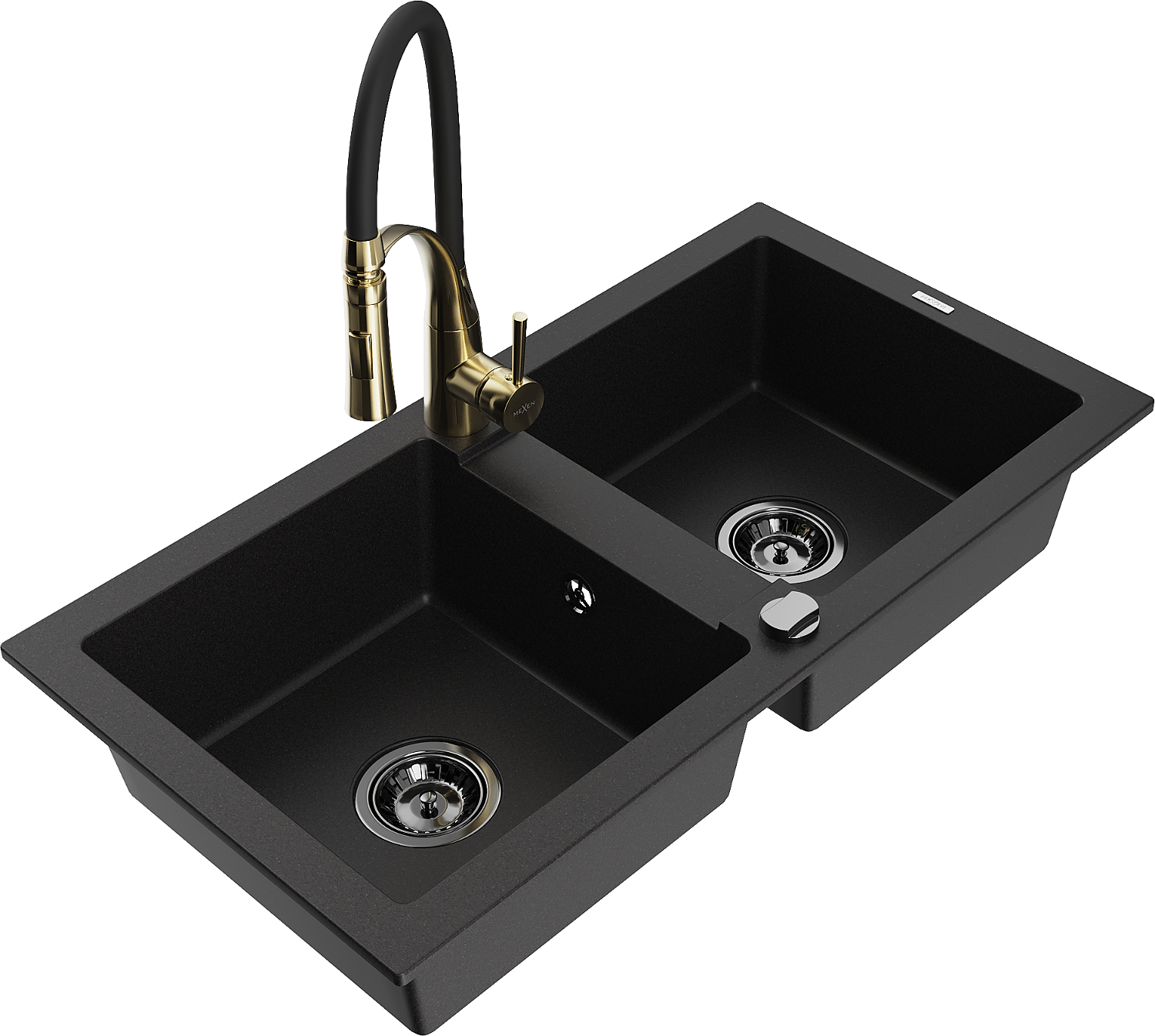 Mexen Mario žulový dvojkomorový drez s kuchynskou batériou Aster, čierny - 6504-77-73450-57-B