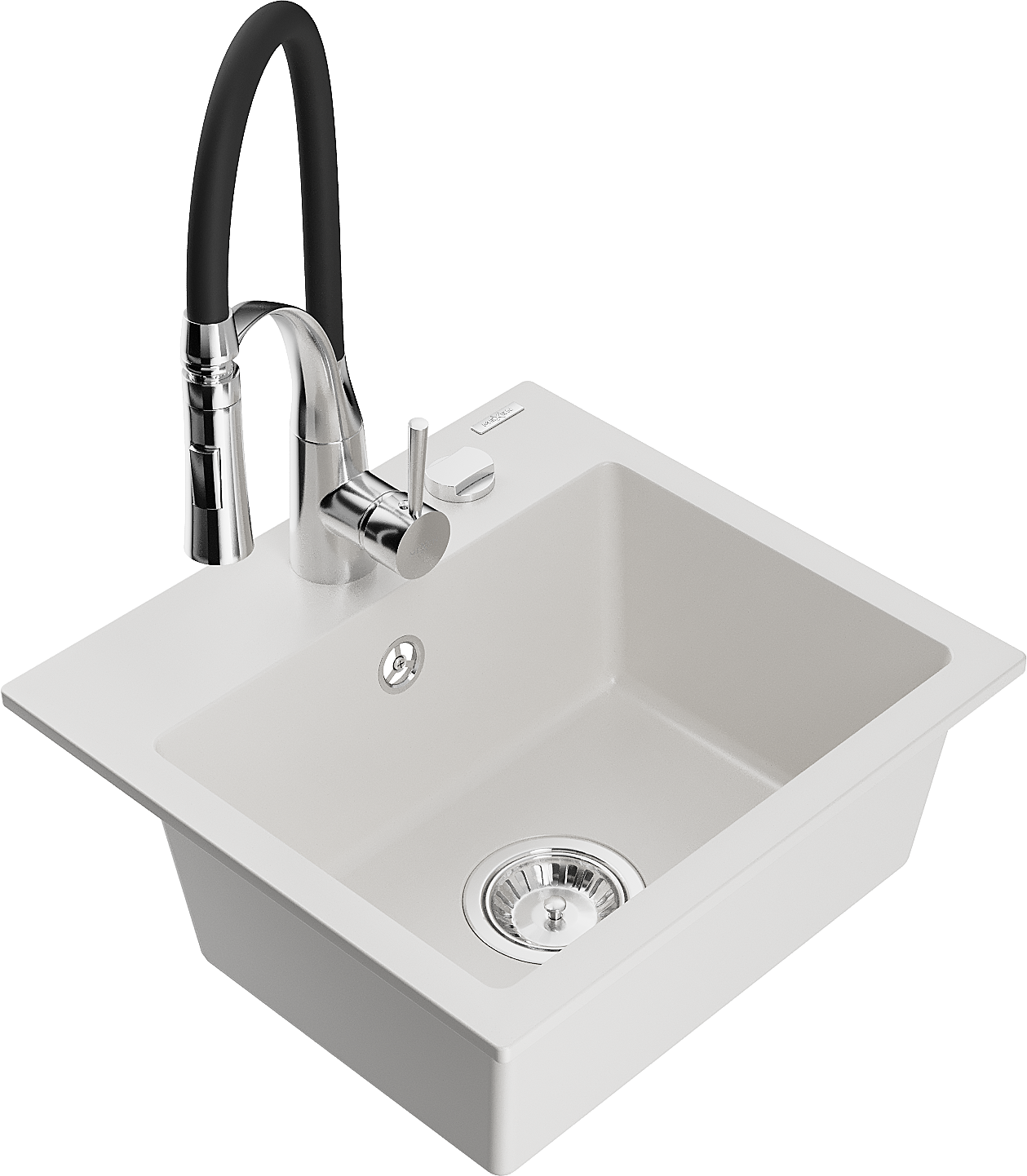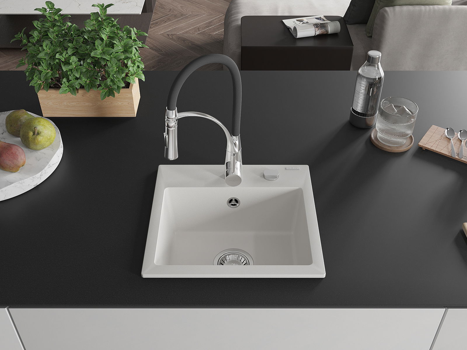 Mexen Milo granitový drez s 1-komorou a kuchynskou batériou Aster, biely - 6505-20-73450-07