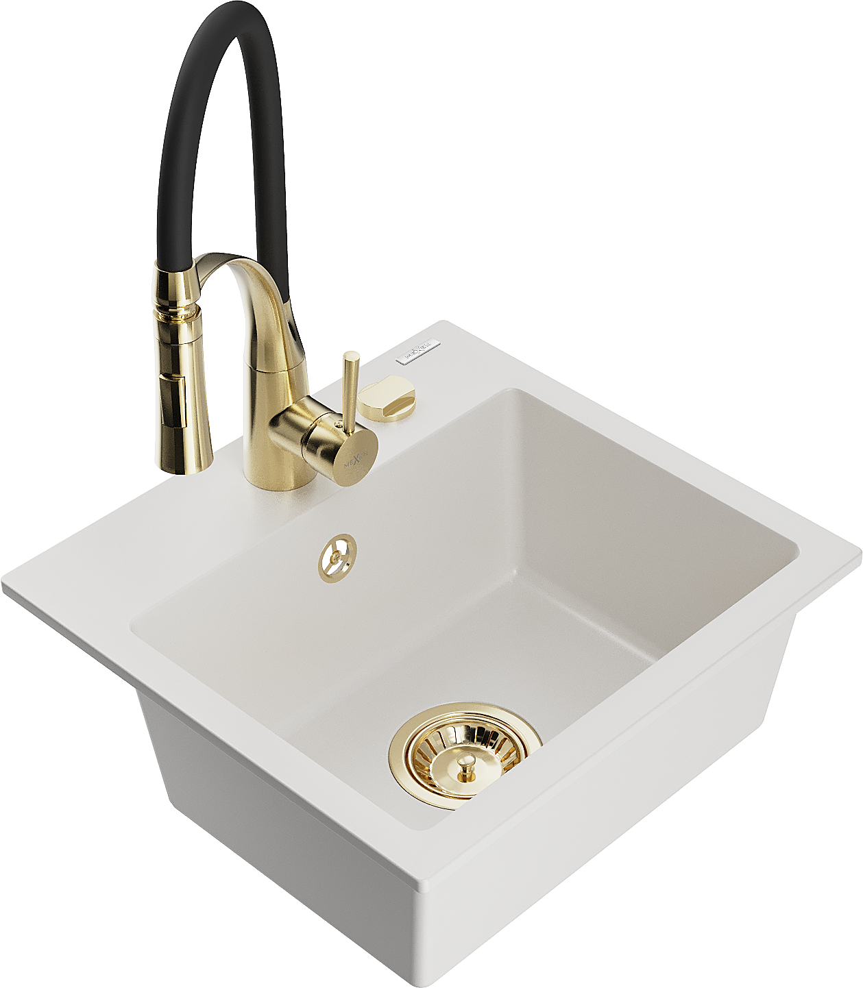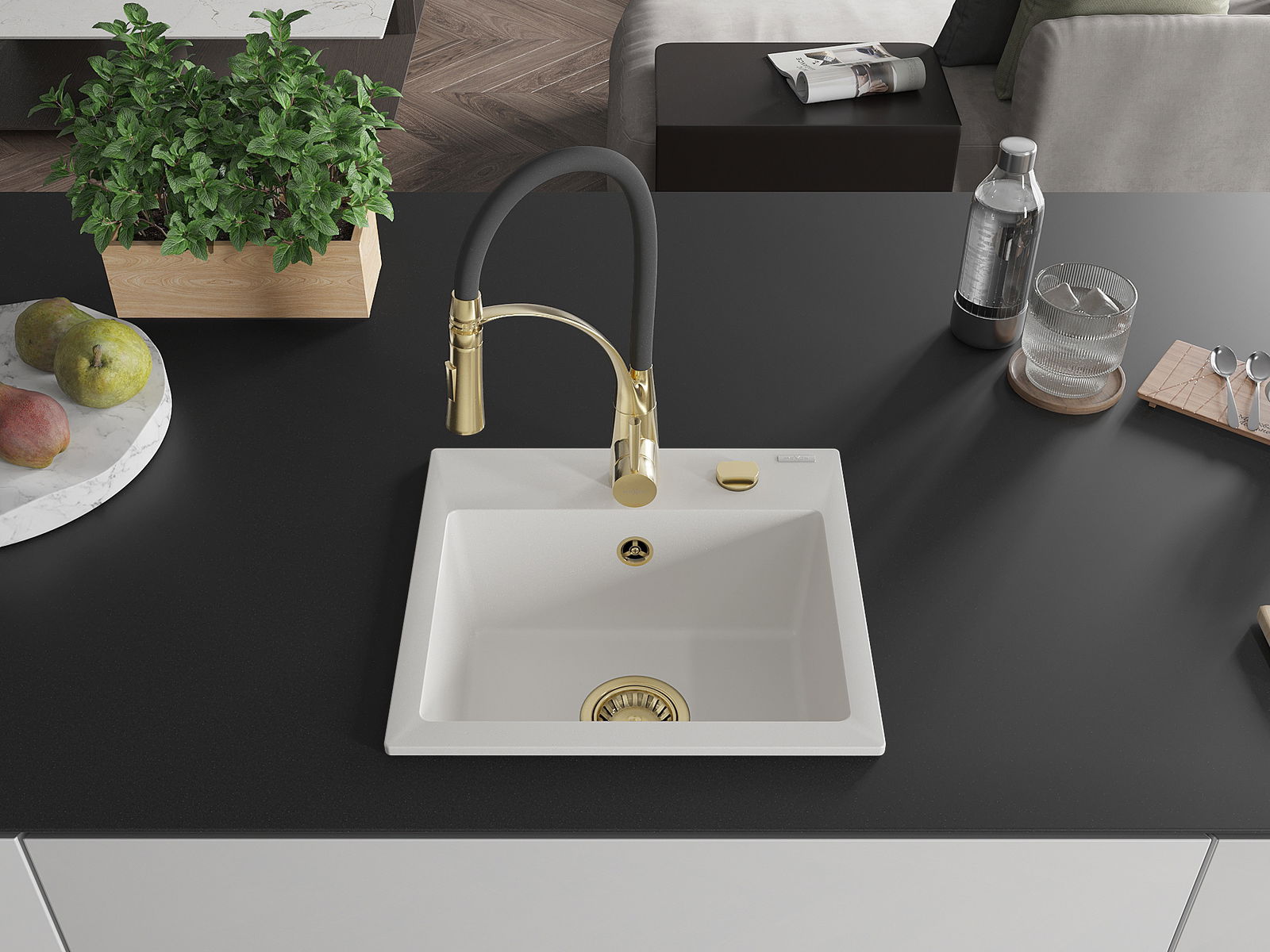 Mexen Milo granitový drez 1-komorový s kuchynskou batériou Aster, biely - 6505-20-73450-57-G