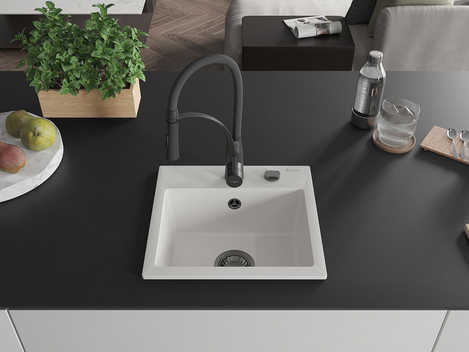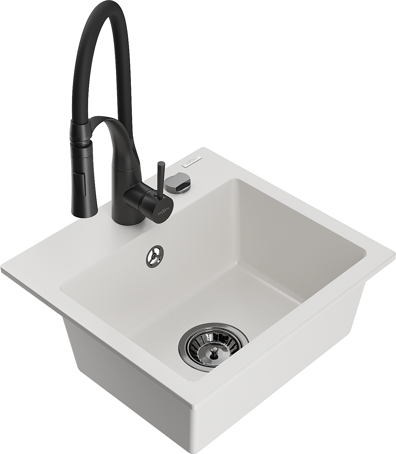 Mexen Milo granitový kuchynský drez s 1 komorou a kuchynskou batériou Aster, biely - 6505-20-73450-70-B