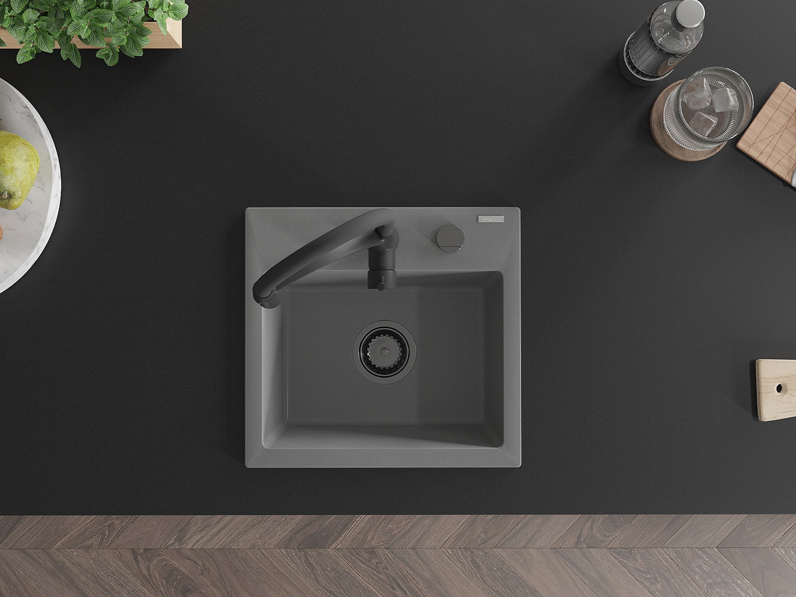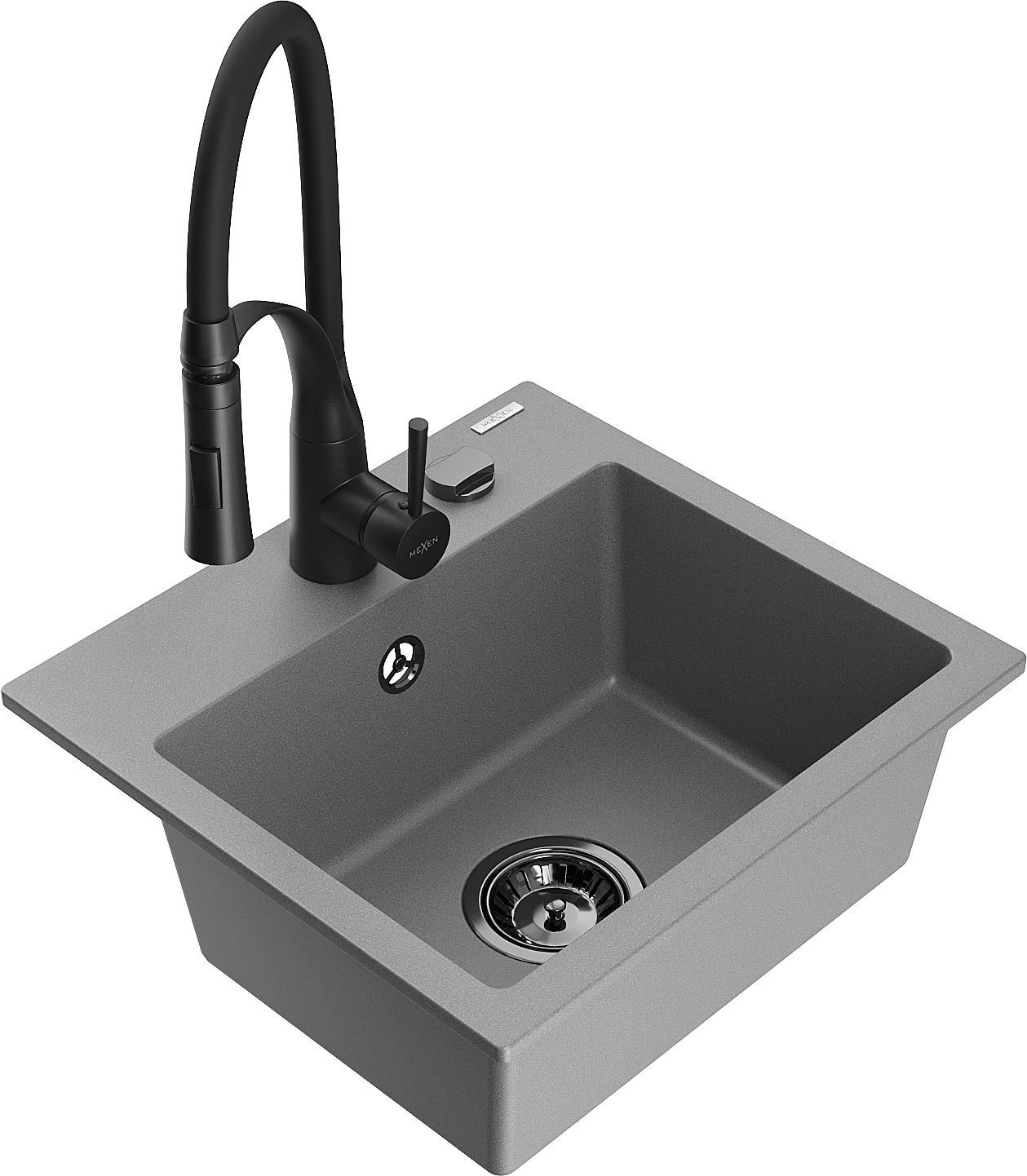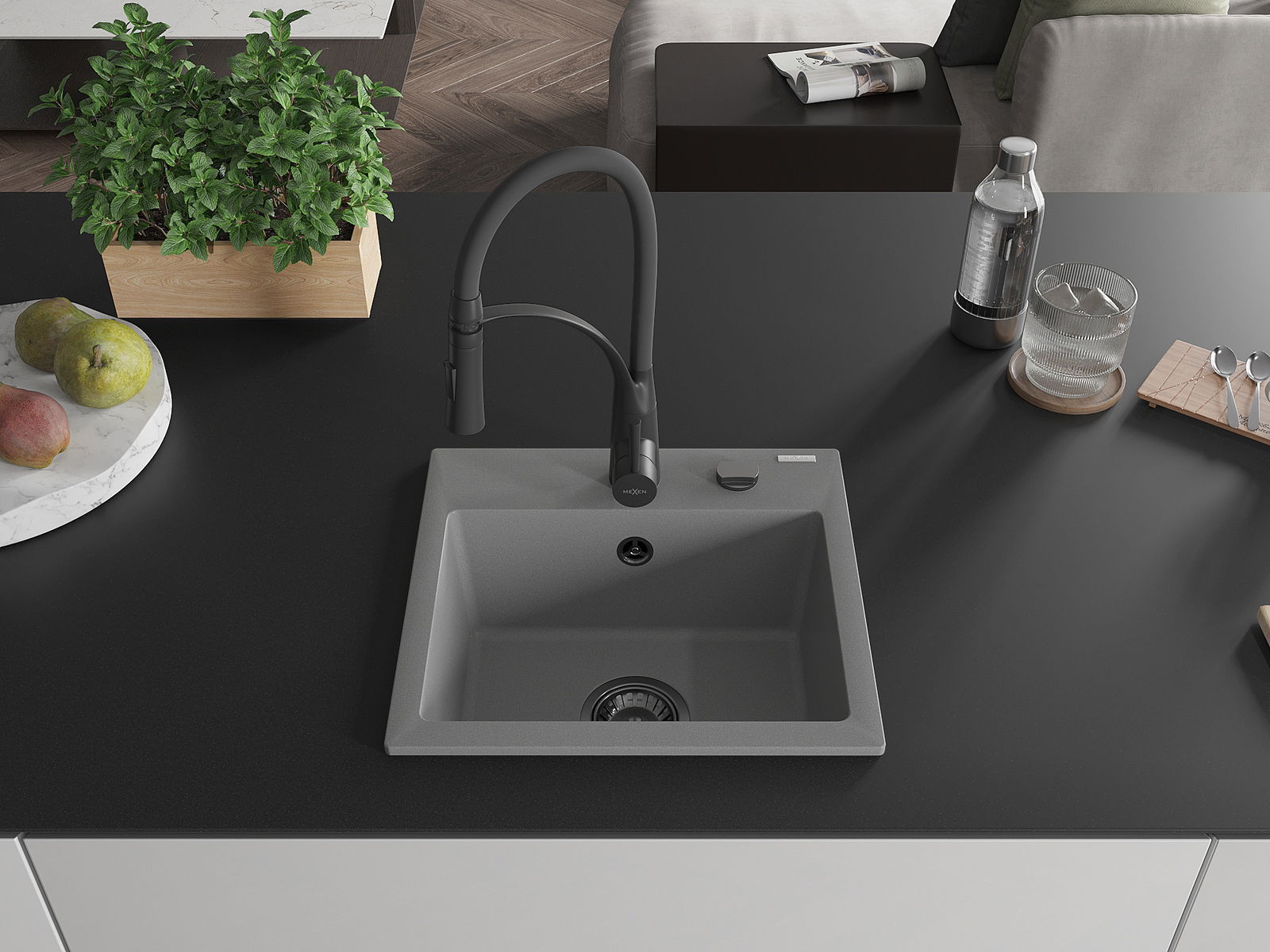 Mexen Milo žulový kuchynský drez s 1-komorou a kuchynskou batériou Aster, sivý - 6505-71-73450-70-B