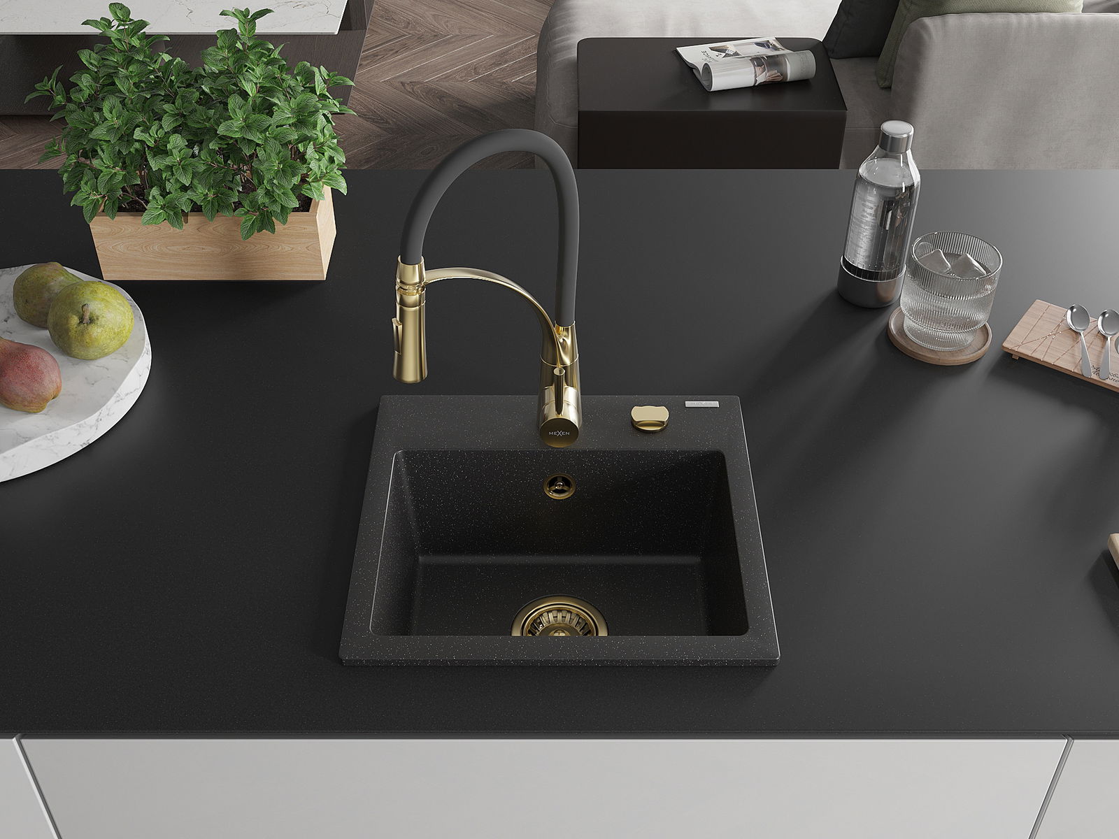 Mexen Milo granitový kuchynský drez 1-komorový s kuchynskou batériou Aster, čierny/strieborný metalický - 6505-73-73450-57-G