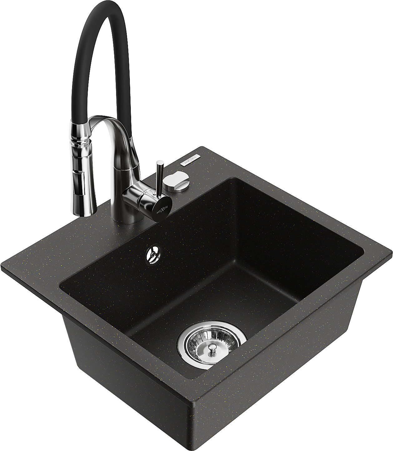 Mexen Milo žulový kuchynský drez s 1 komorou a kuchynskou batériou Aster, čierny/zlatý metalik - 6505-75-73450-07