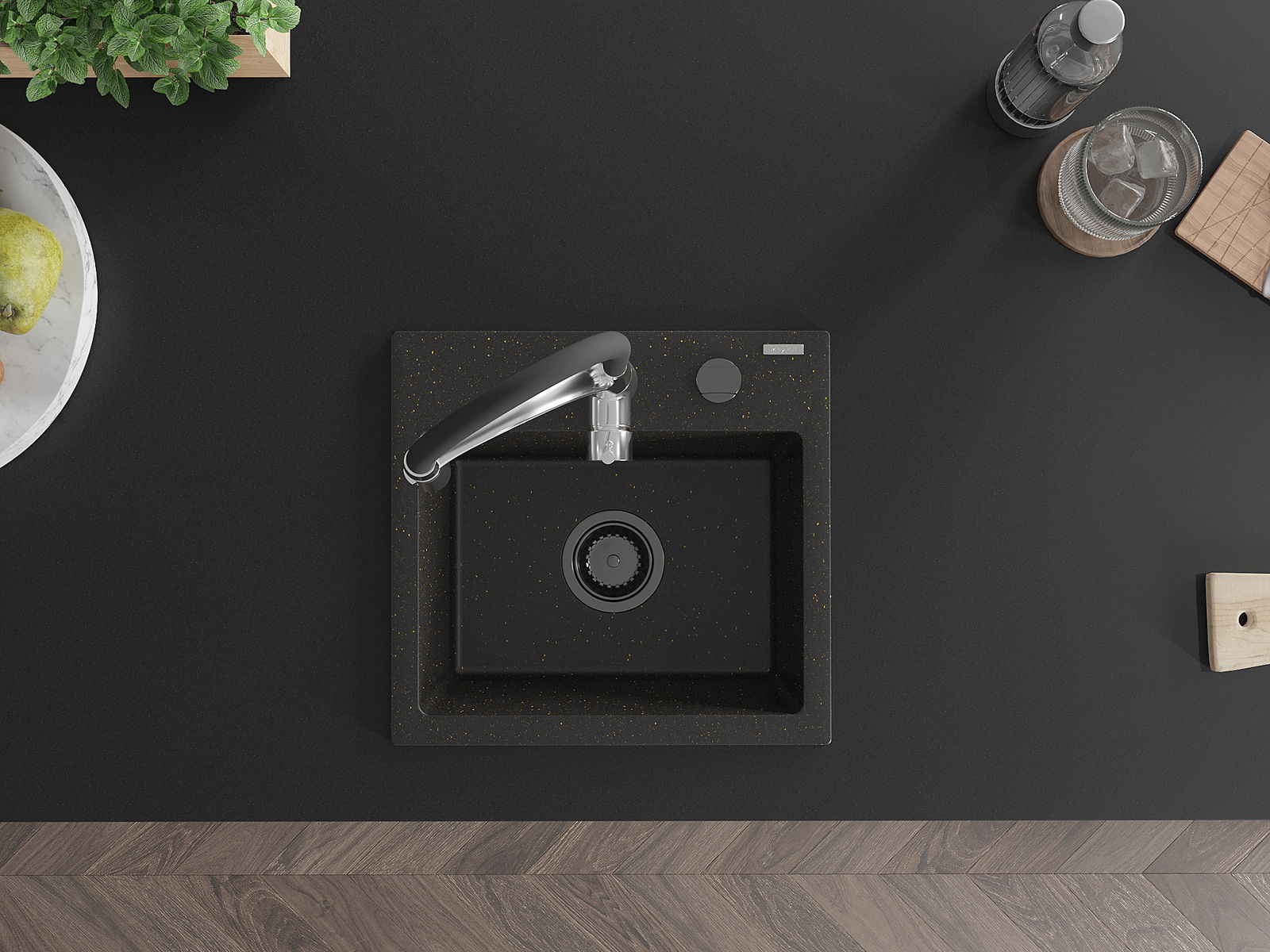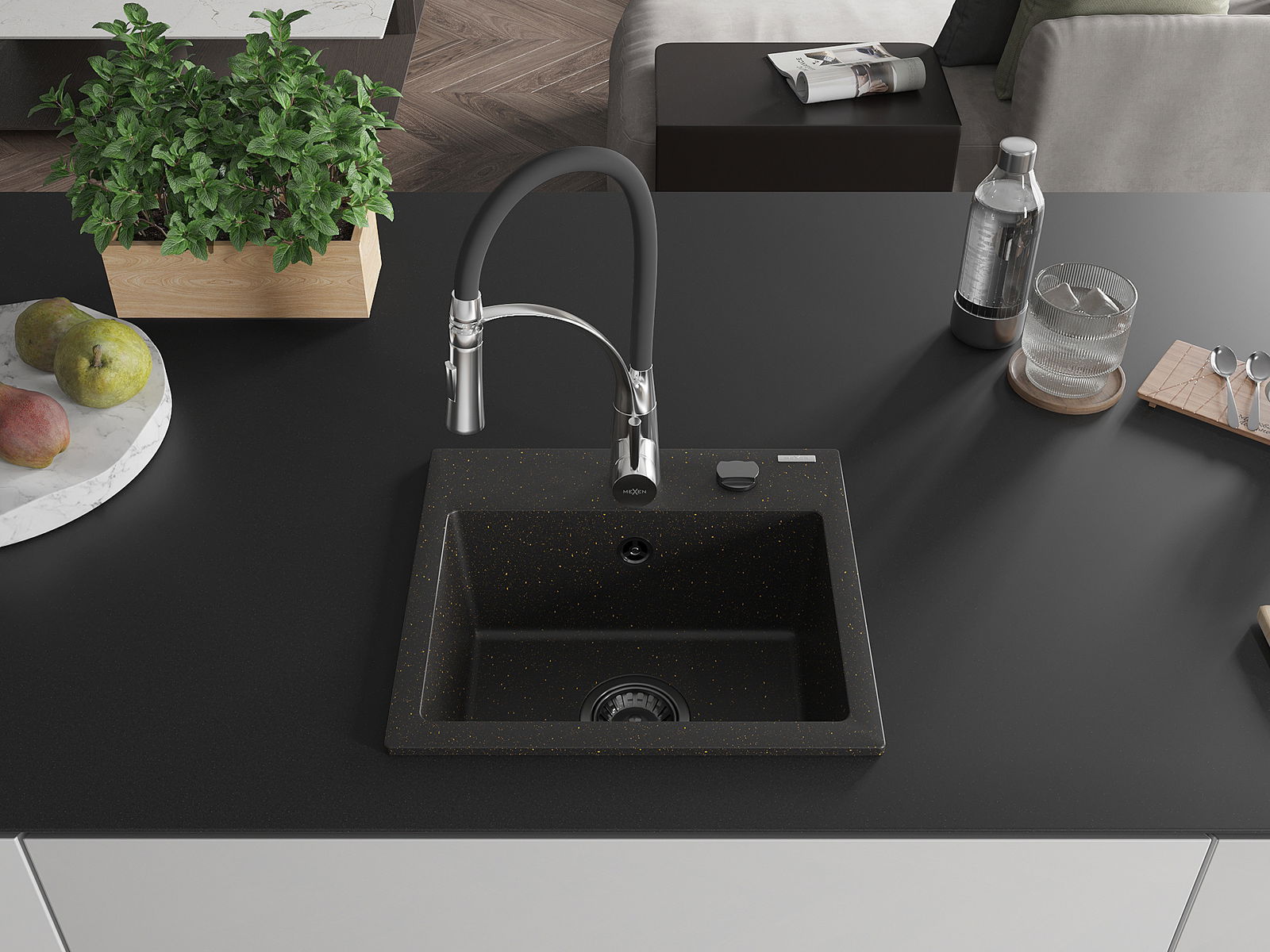 Mexen Milo granitový drez 1-komorový s kuchynskou batériou Aster, čierna/zlatý metalík - 6505-75-73450-07-B