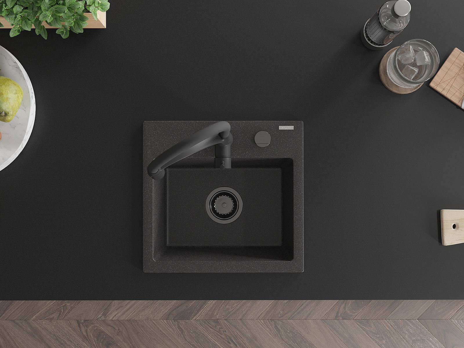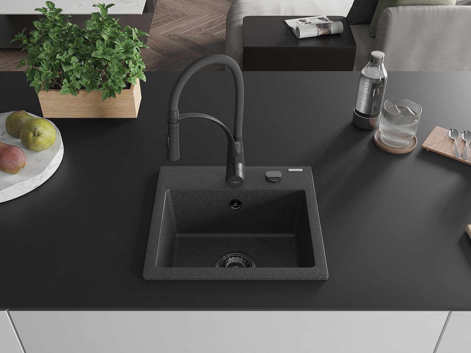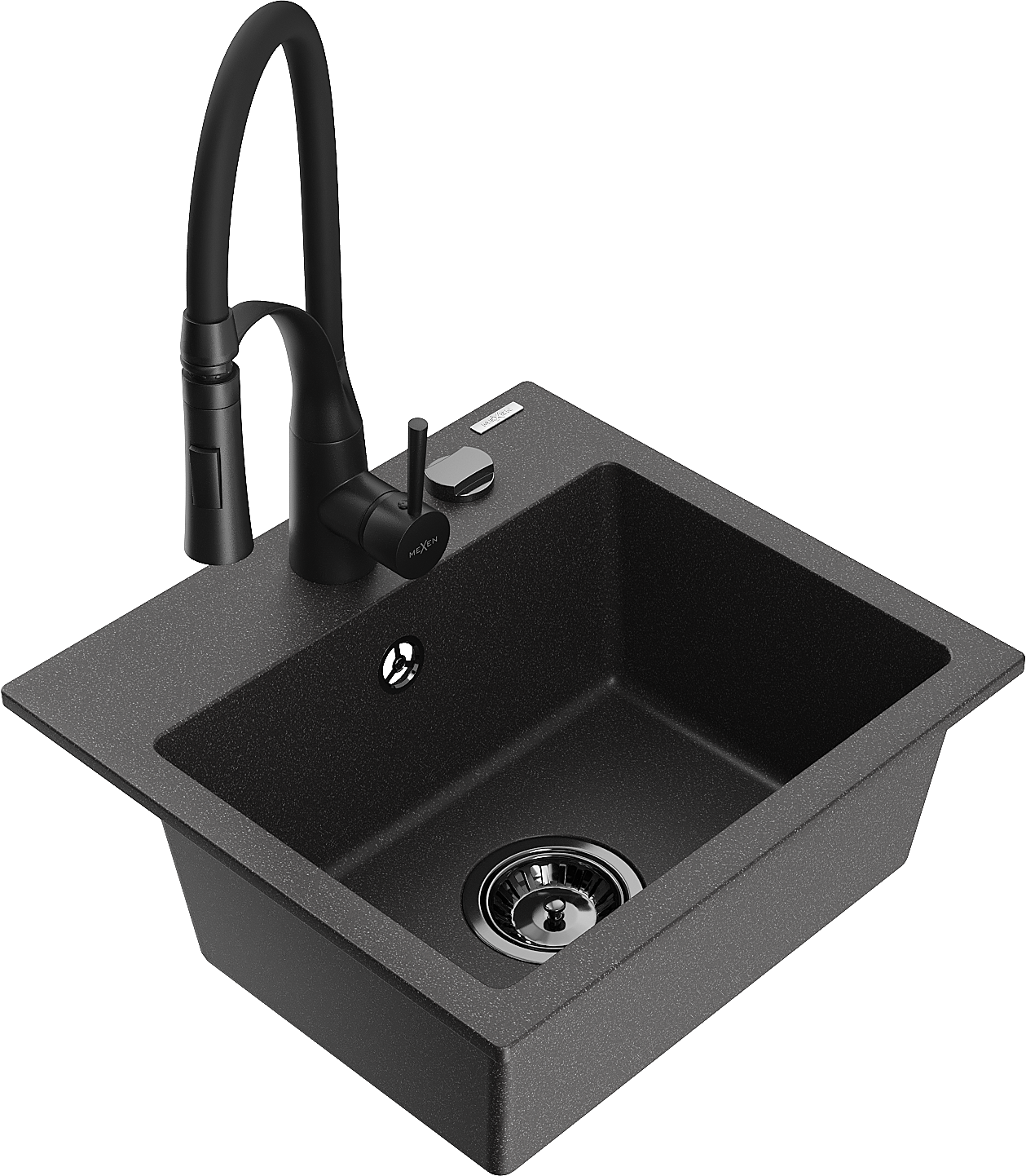 Mexen Milo jednokomorový granitový drez s kuchynskou batériou Aster, čierny nakvapkaný - 6505-76-73450-70-B
