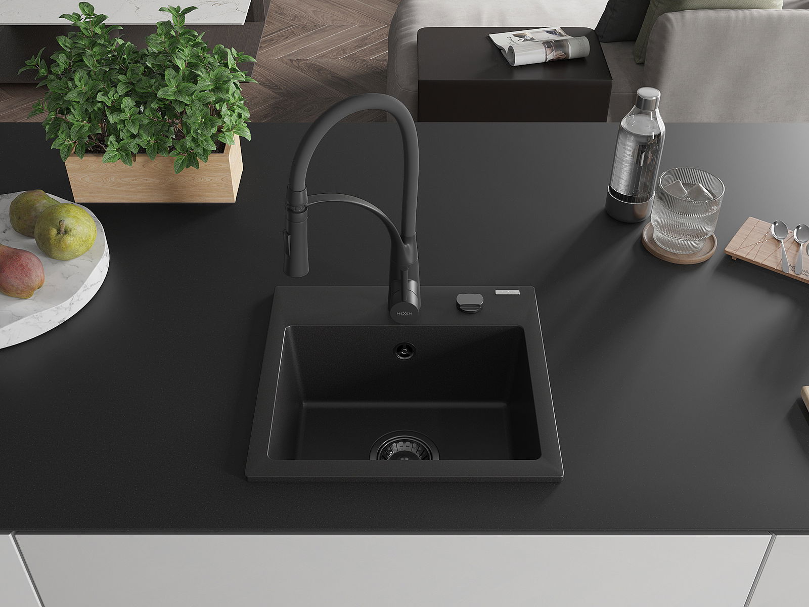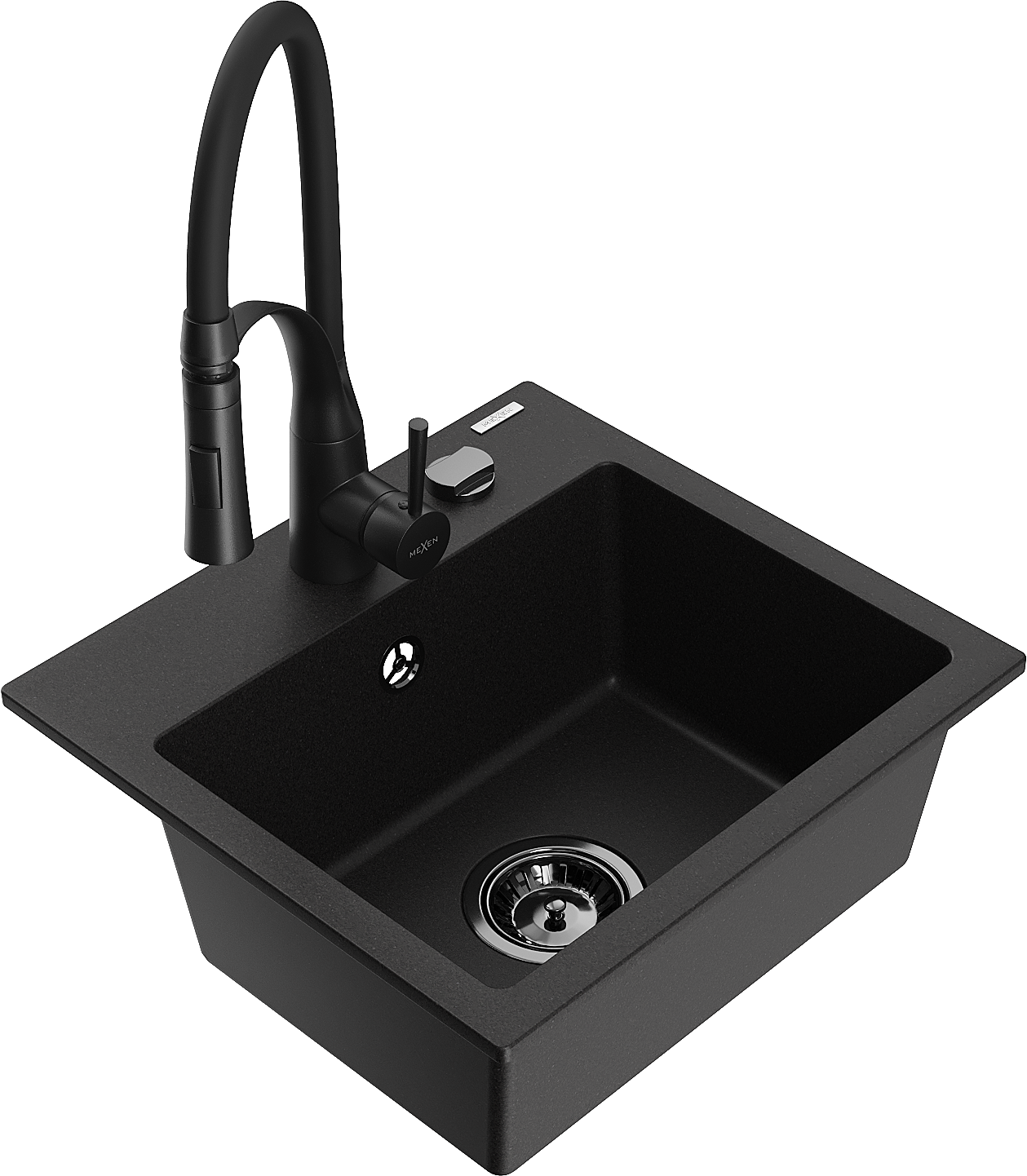 Mexen Milo granitový drez 1-komorový s kuchynskou batériou Aster, čierny - 6505-77-73450-70-B