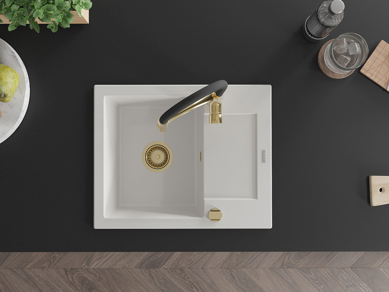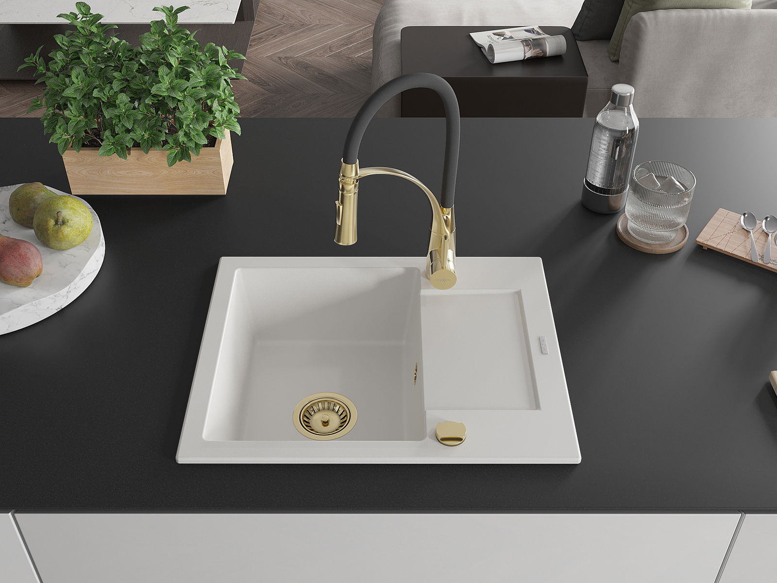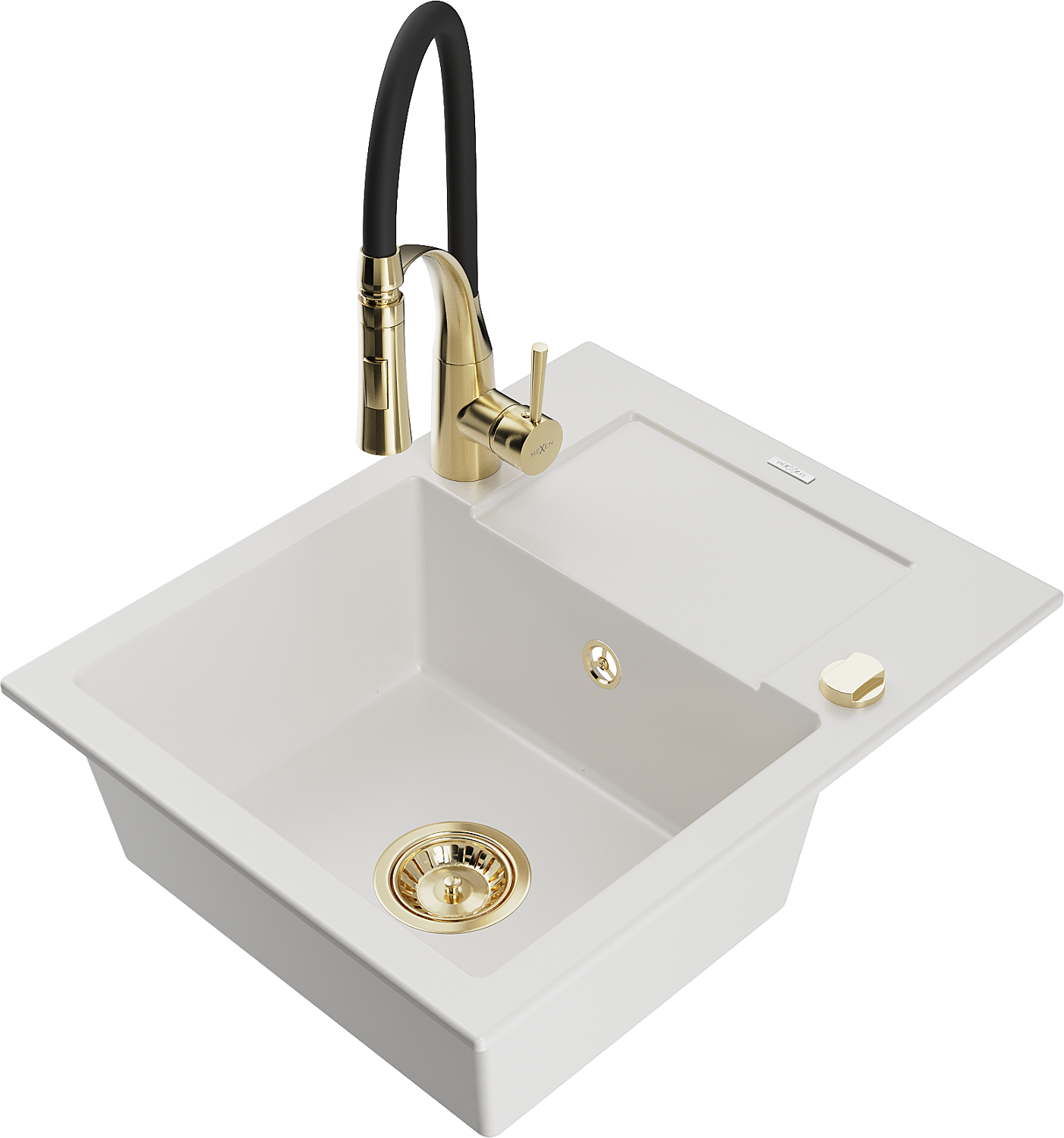 Mexen Enzo granitový kuchynský drez s odkvapkávacou plochou a kuchynskou batériou Aster, biely - 6506-20-73450-57-G