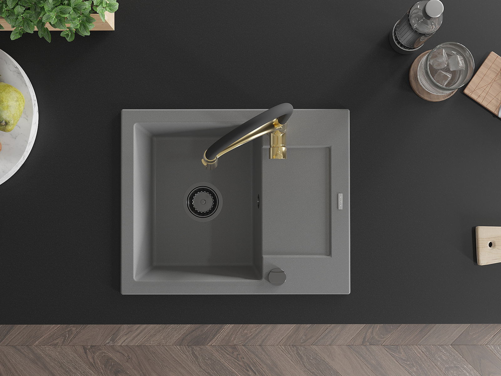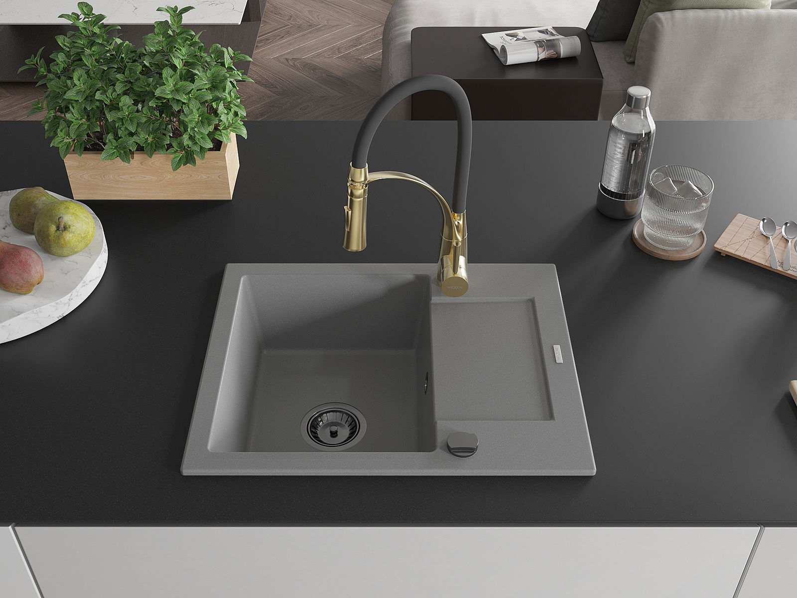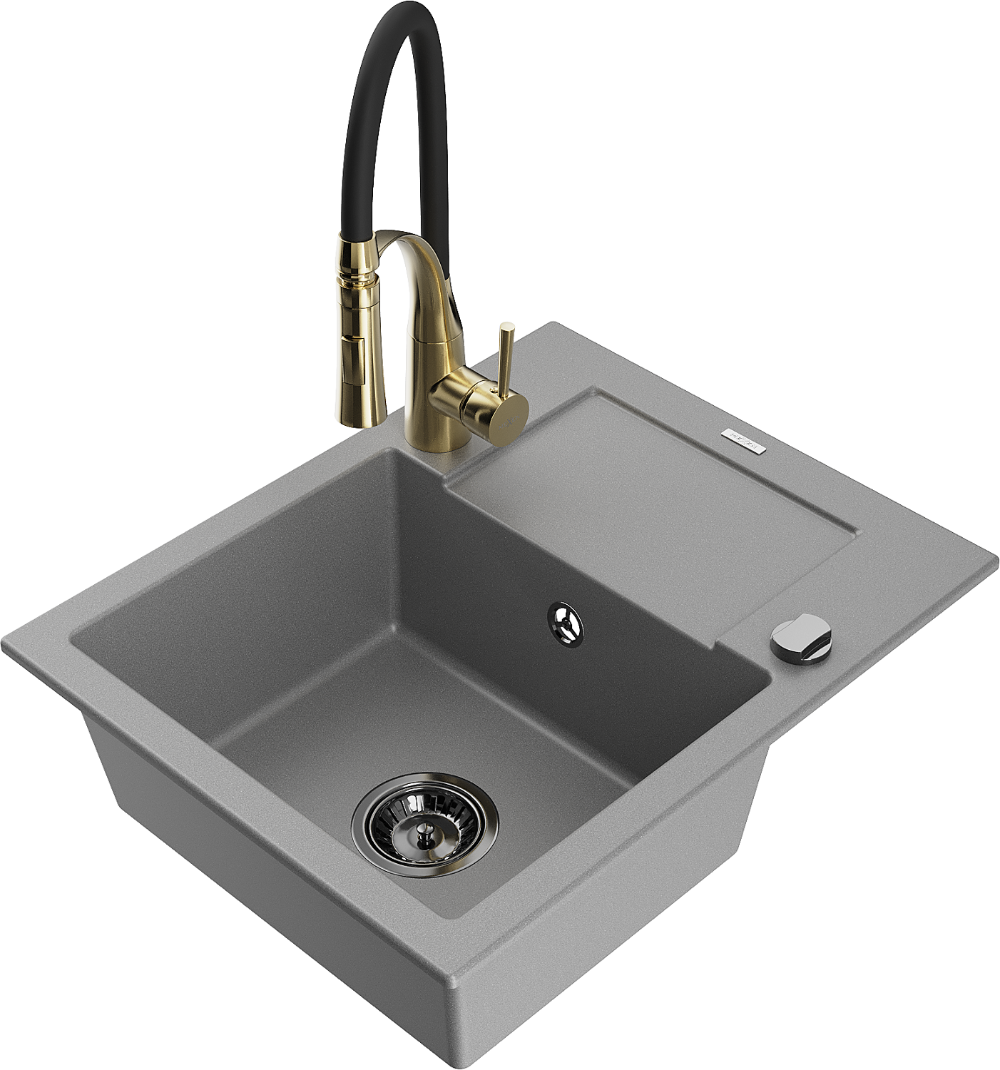 Mexen Enzo Granitový drez s 1-komorou s odkvapkávacou plochou a kuchynskou batériou Aster, sivý - 6506-71-73450-57-B