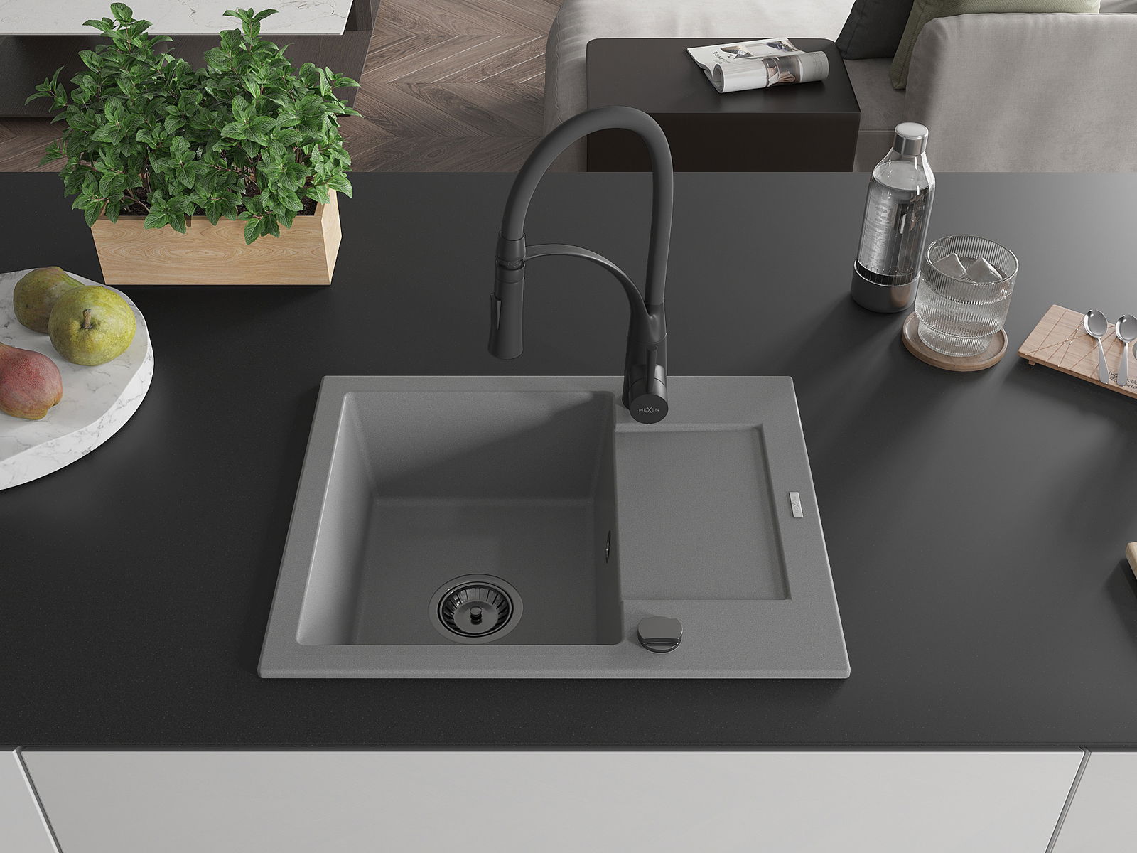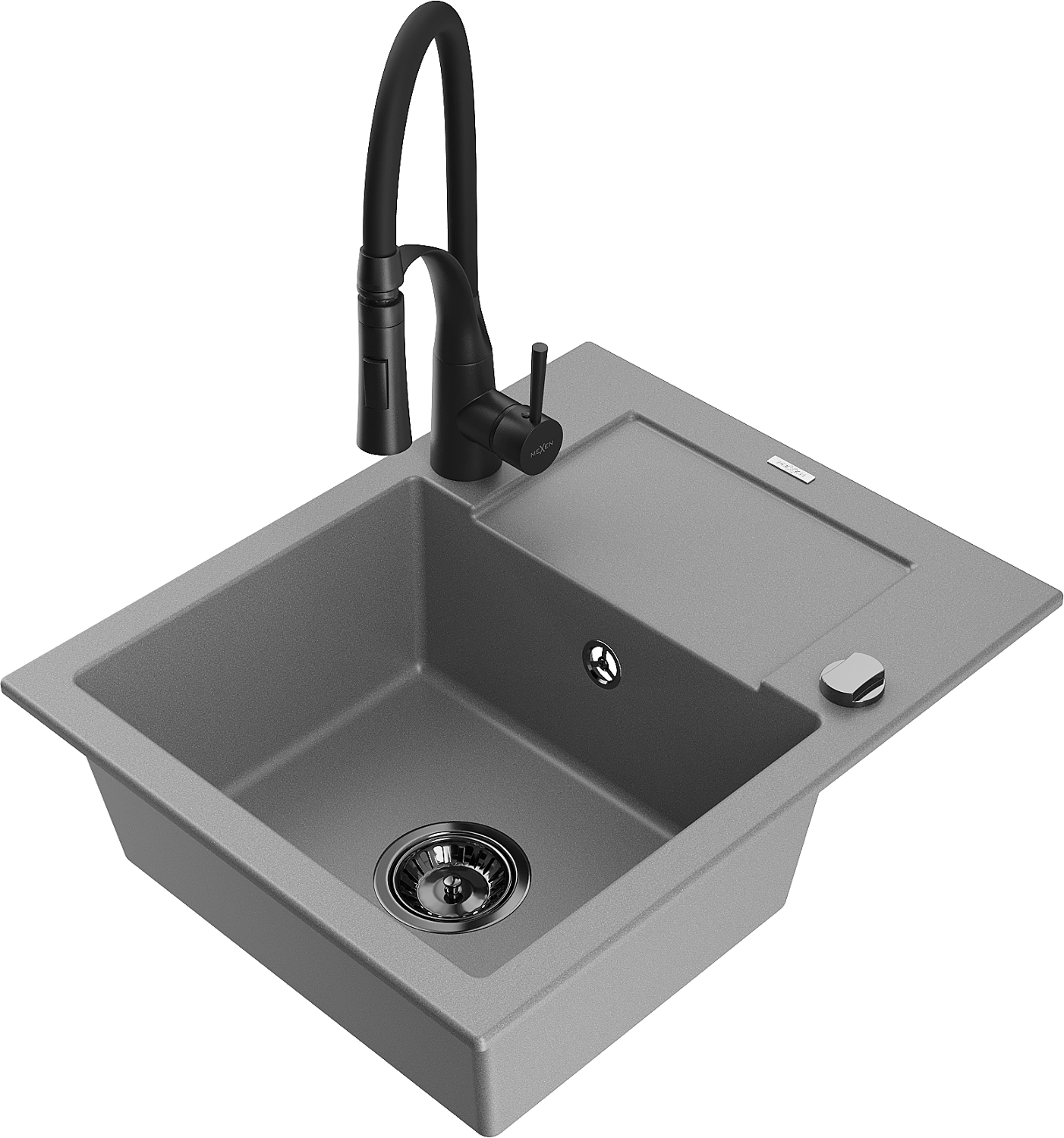 Mexen Enzo žulový kuchynský drez 1-komorový s odkvapkávačom a kuchynskou batériou Aster, sivý - 6506-71-73450-70-B