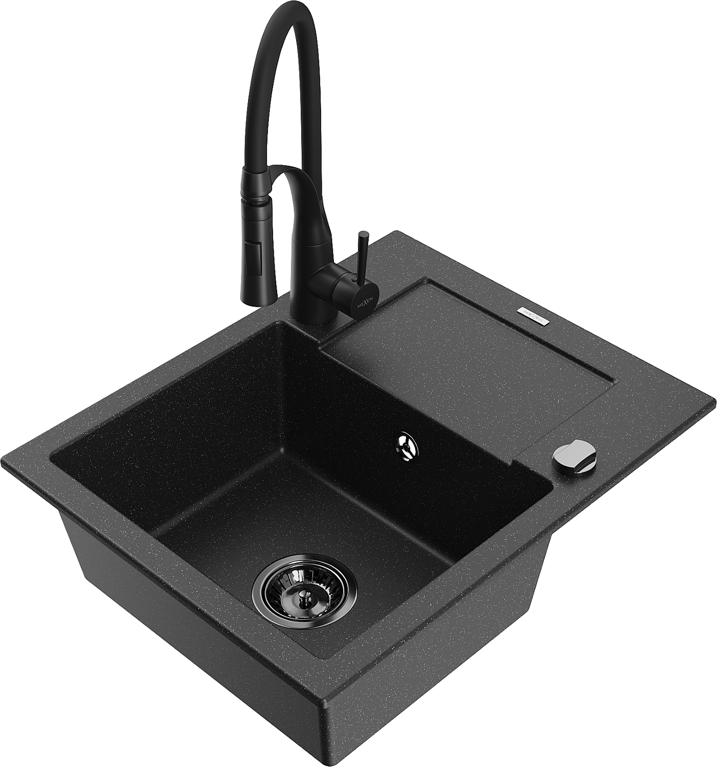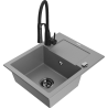Mexen Enzo granitový jednokomorový drez s odkvapkávačom a kuchynskou batériou Aster, čierna/strieborná metalíza