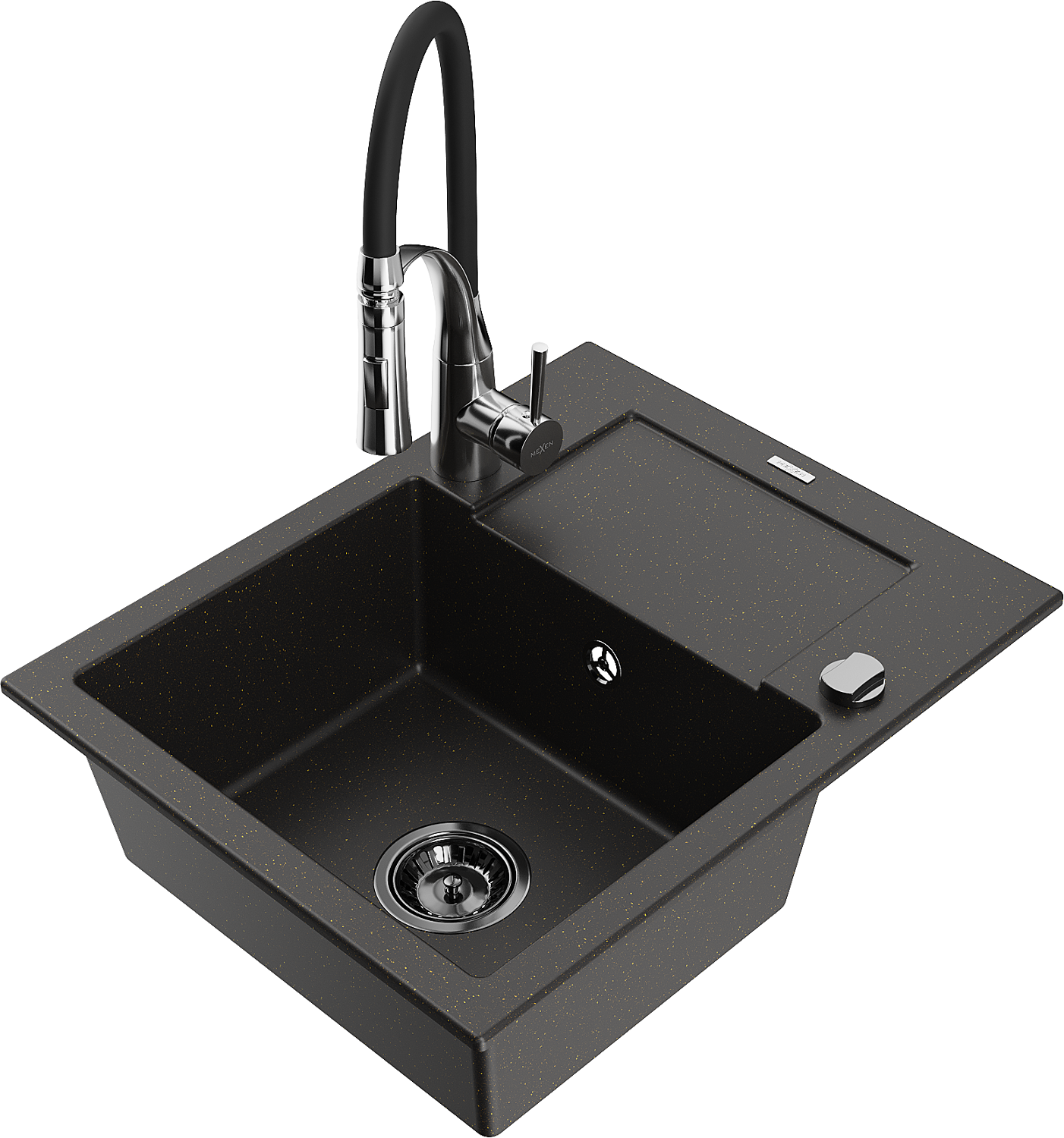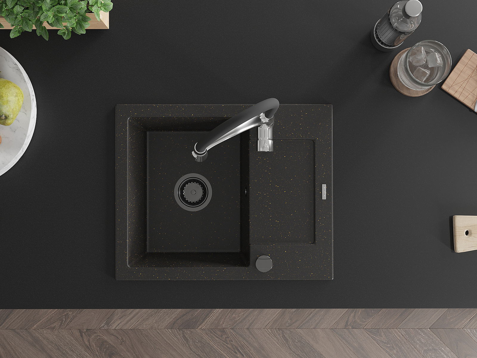 Mexen Enzo granitový drez s 1 komorou, s odkvapkávačom a kuchynskou batériou Aster, čierny/zlatý metalik - 6506-75-73450-07-B