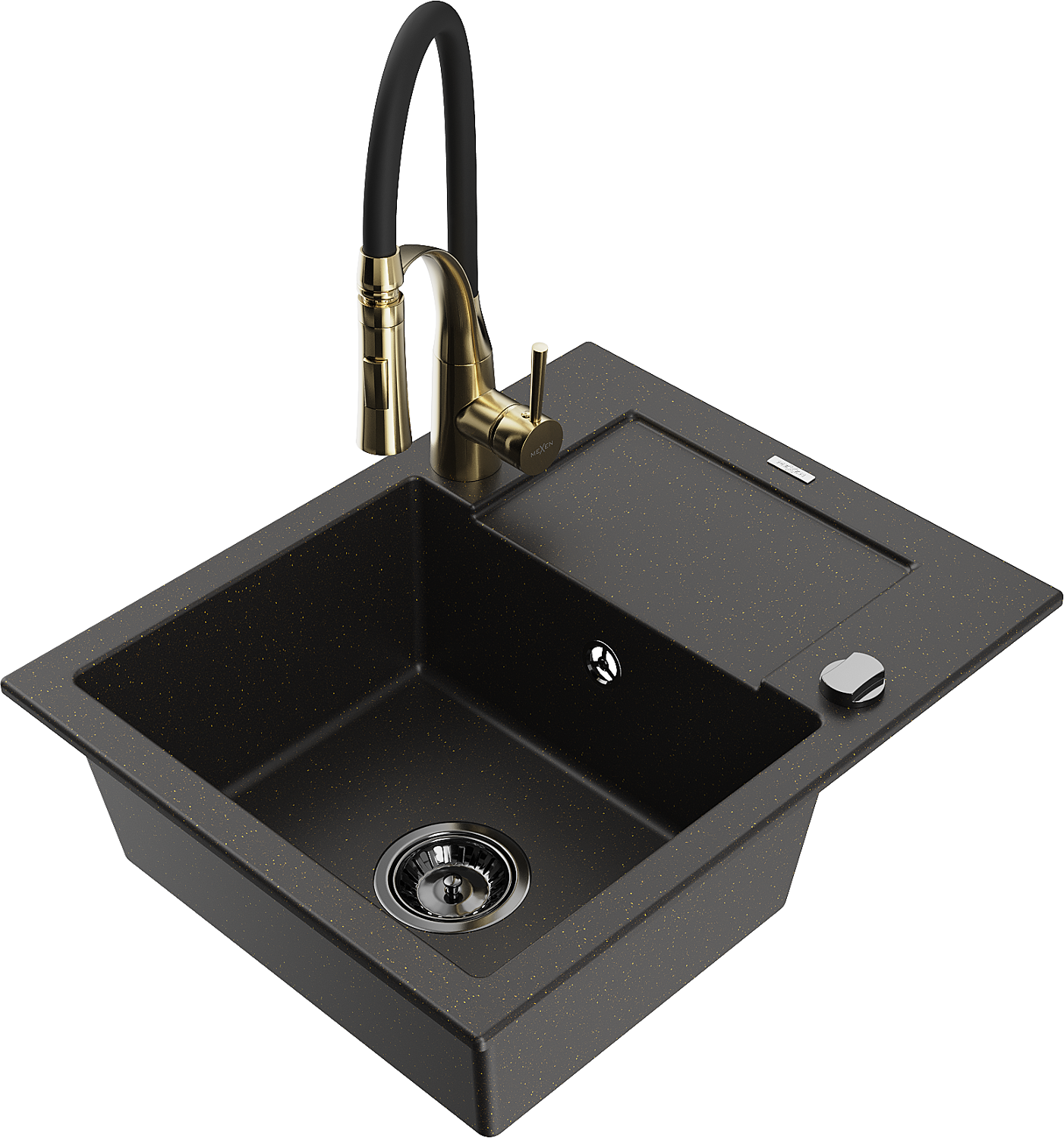 Mexen Enzo granitový drez 1-komorový s odkvapávačom a kuchynskou batériou Aster, čierny/zlatý metalik - 6506-75-73450-57-B