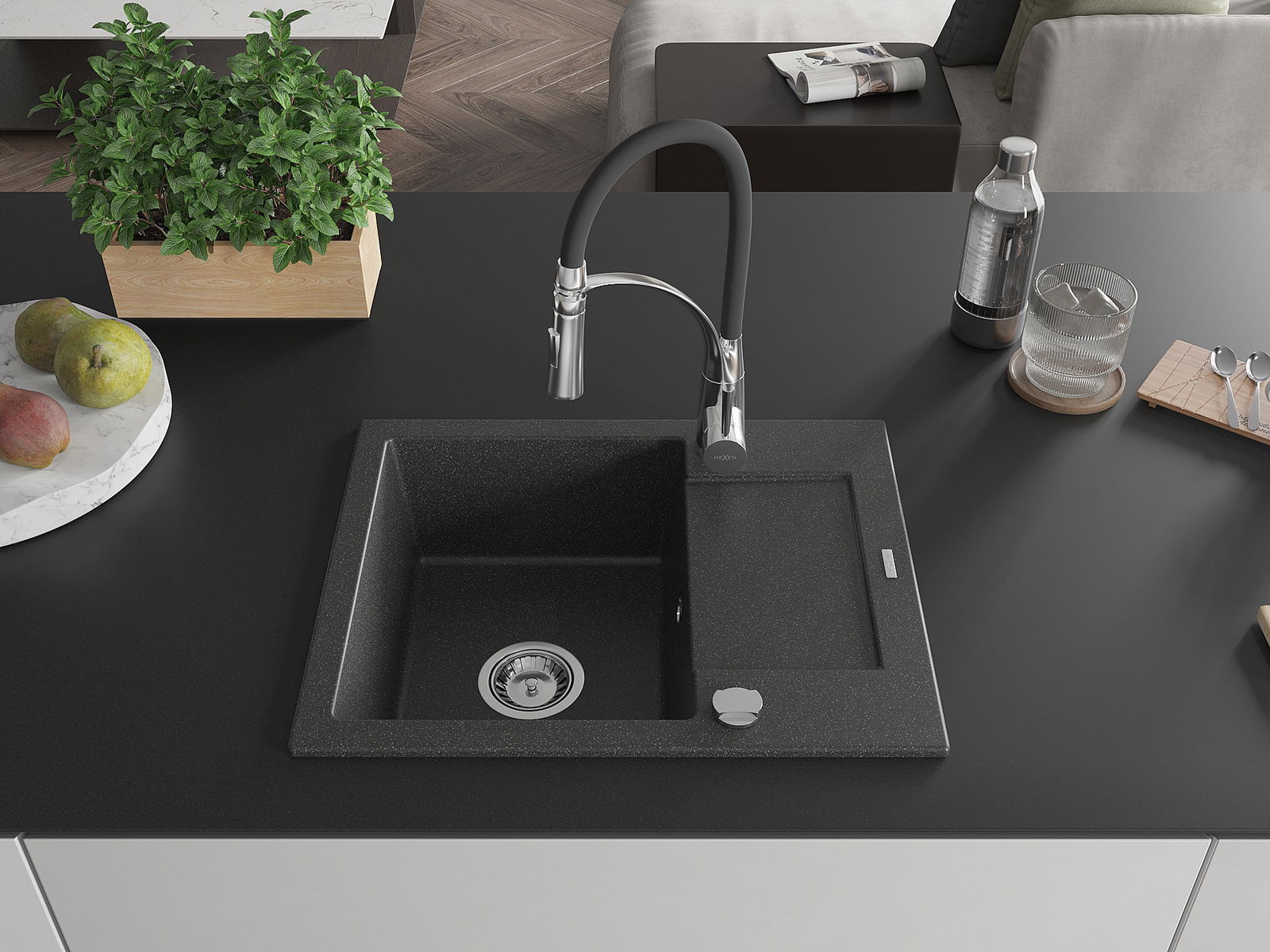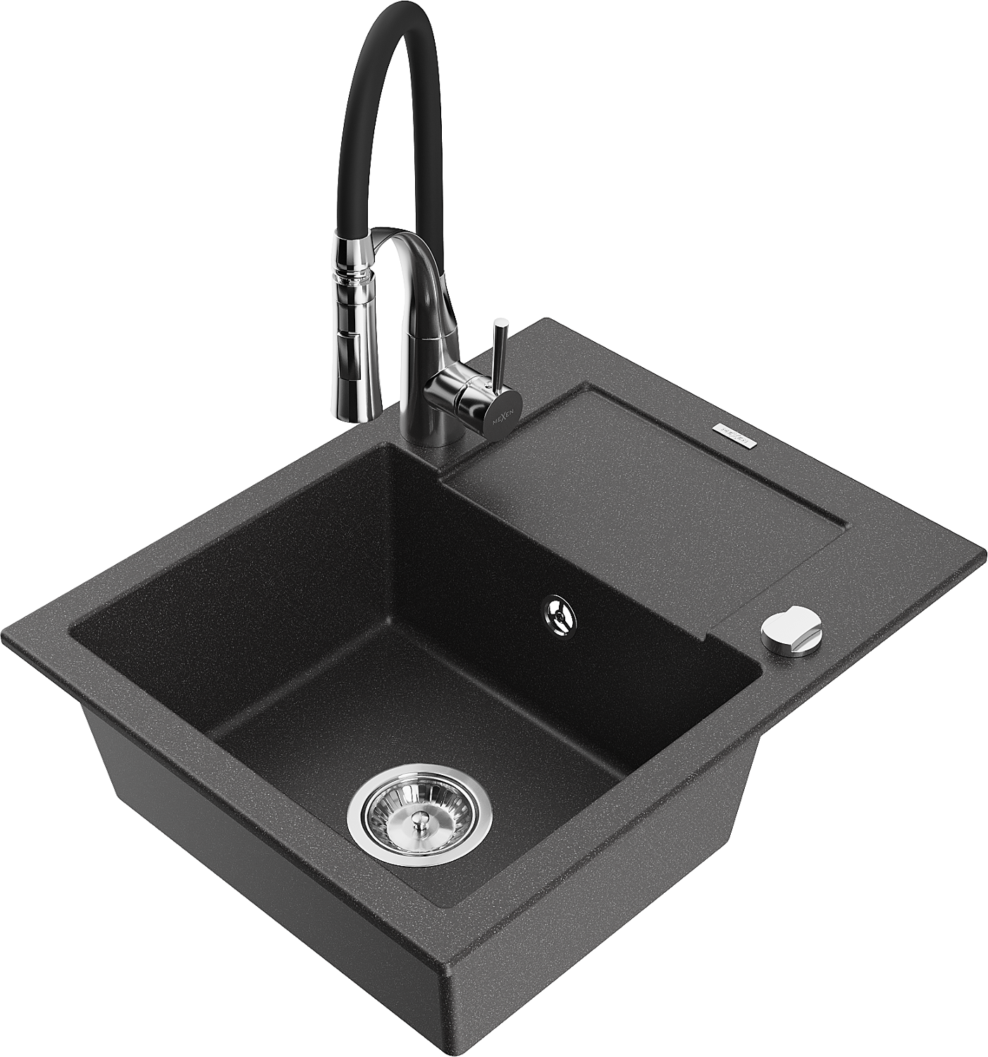 Mexen Enzo granitový drez, 1-komorový s odkvapkávačom a kuchynskou batériou Aster, čierny škvrnitý - 6506-76-73450-07