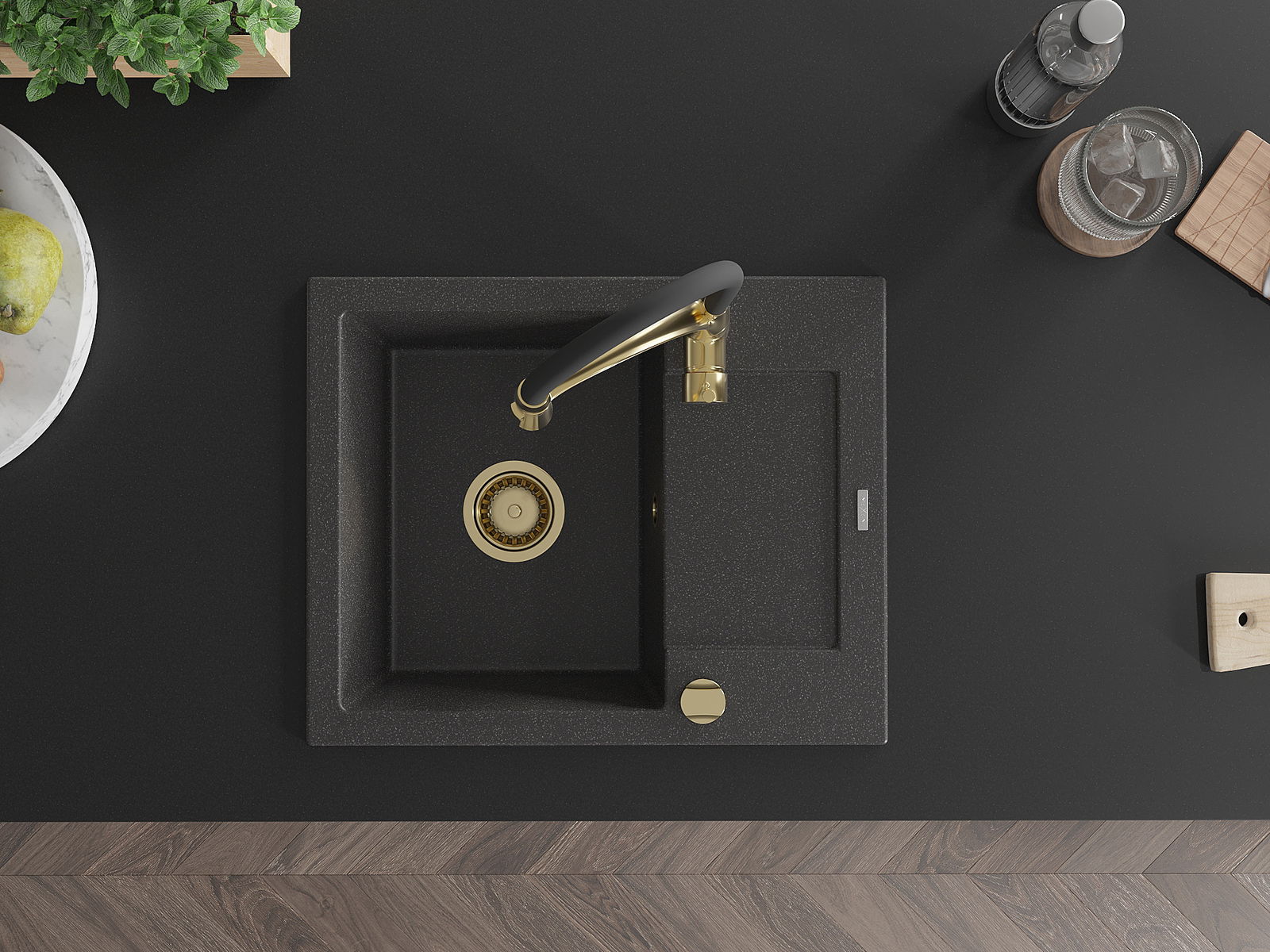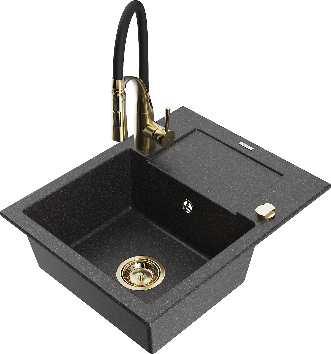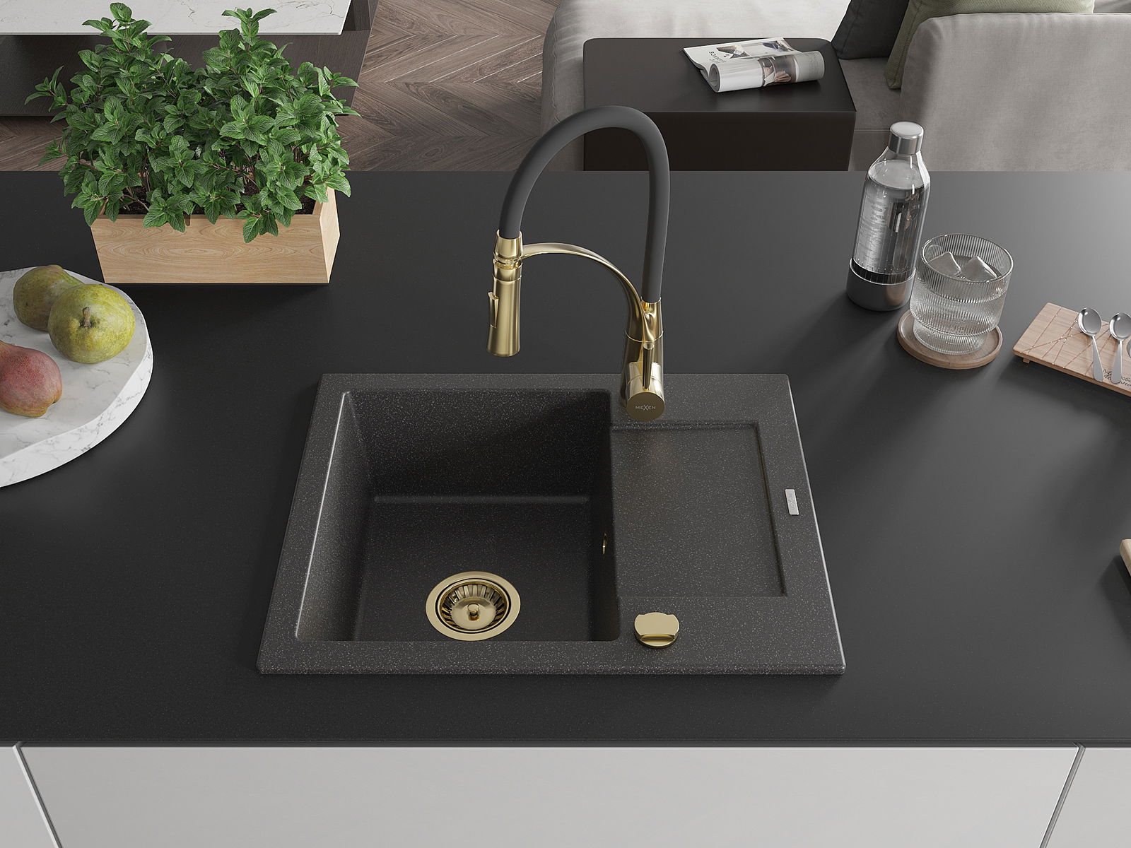 Mexen Enzo žulový kuchynský drez s 1 komorou, odkvapkávačom a kuchynskou batériou Aster, čierny škvrnitý - 6506-76-73450-57-G