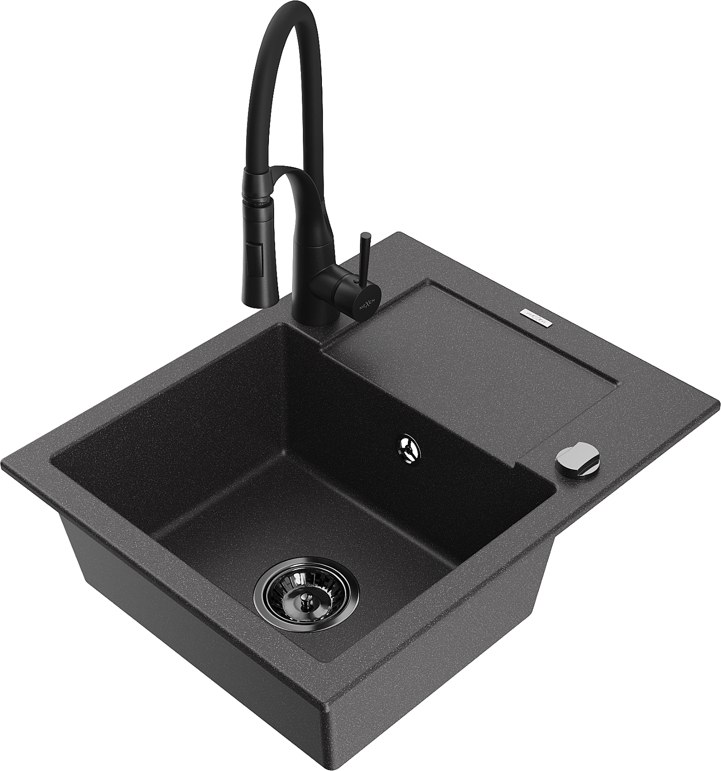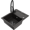 Mexen Enzo granitový kuchynský drez s 1 komorou, odkvapkávačom a kuchynskou batériou Aster, čierna s fľakmi