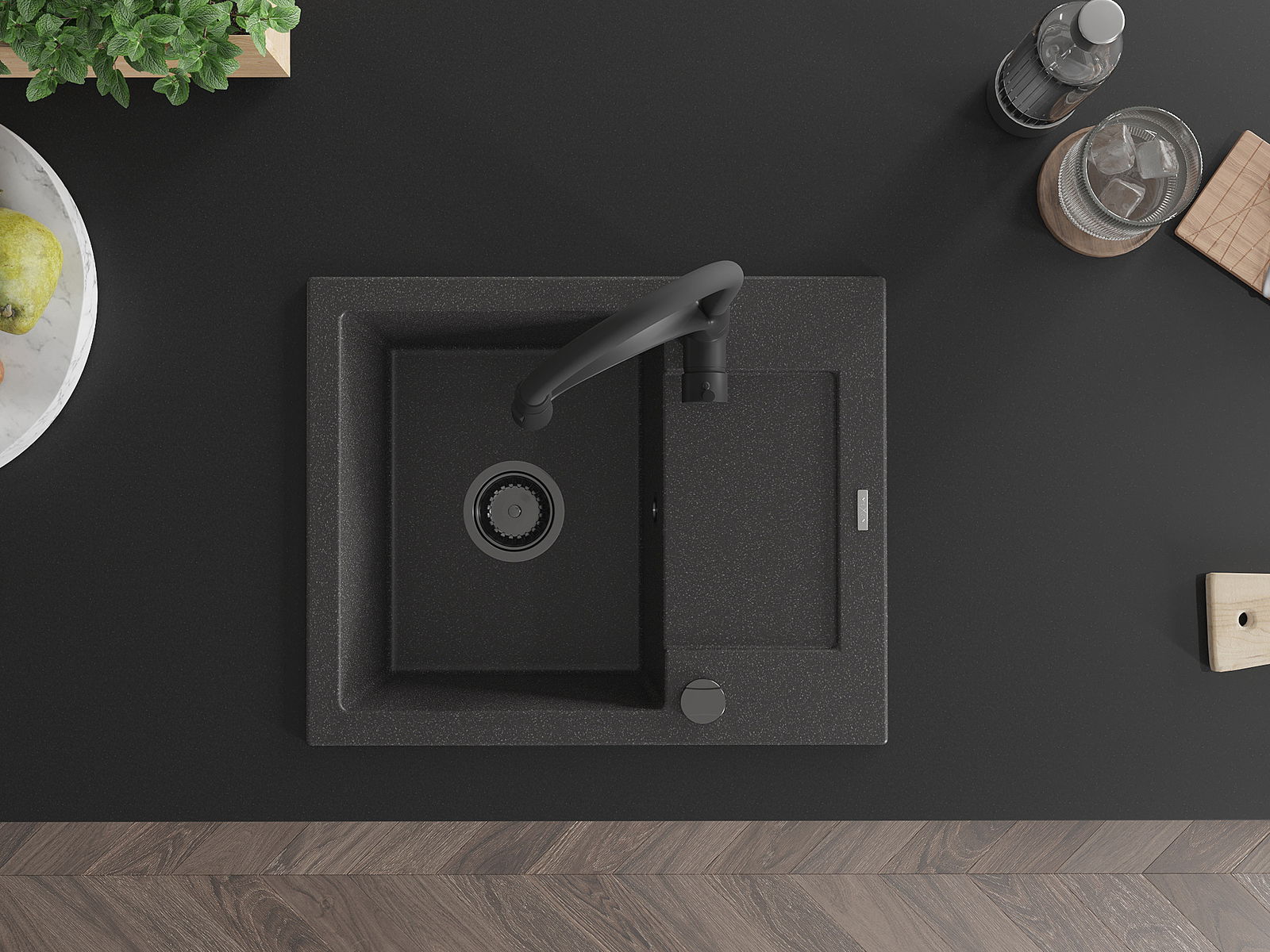 Povrch kuchynského drezu je odolný voči škvrnám a zafarbeniu, vďaka čomu sa ľahko udržiava a zachováva svoju farbu počas dlhého obdobia používania. Estetický a praktický doplnok pre každú kuchyňu.
