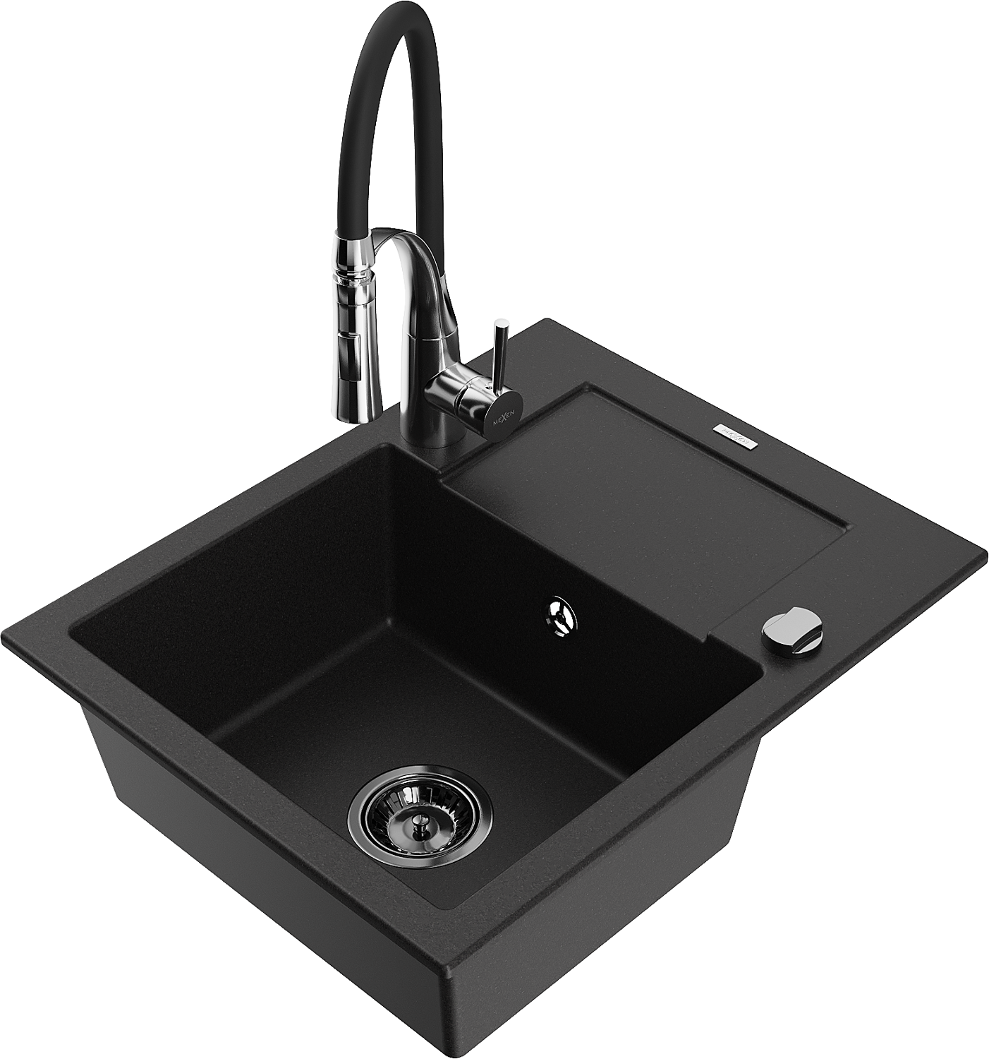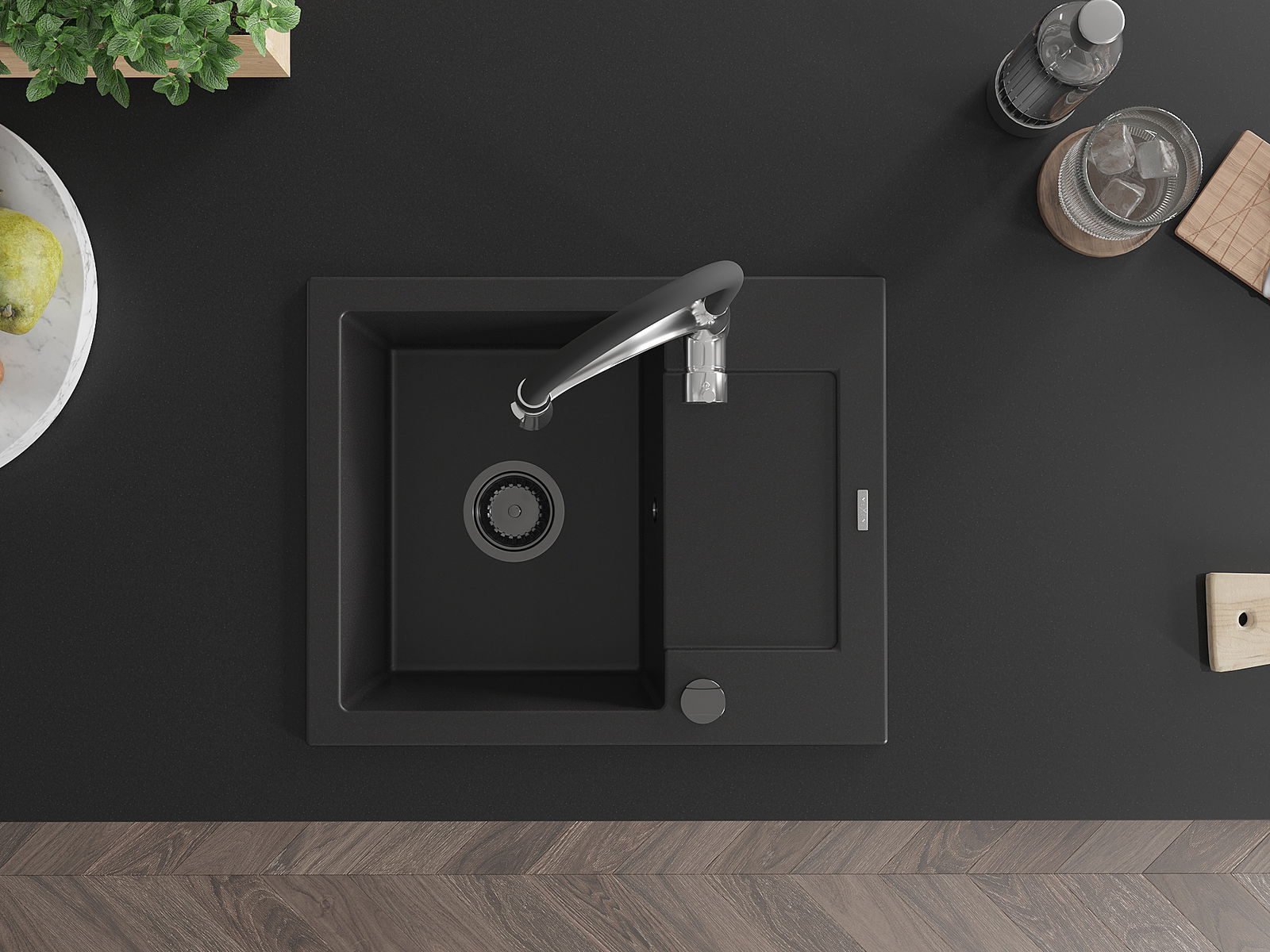 Mexen Enzo granitový kuchynský drez 1-komorový s odkvapkávačom a kuchynskou batériou Aster, čierny - 6506-77-73450-07-B