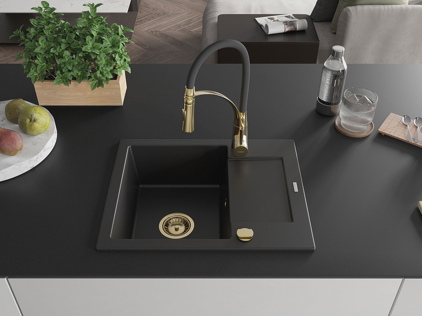 Mexen Enzo žulový drez s jednou komorou s odkvapkávacou plochou a kuchynskou batériou Aster, čierny - 6506-77-73450-57-G