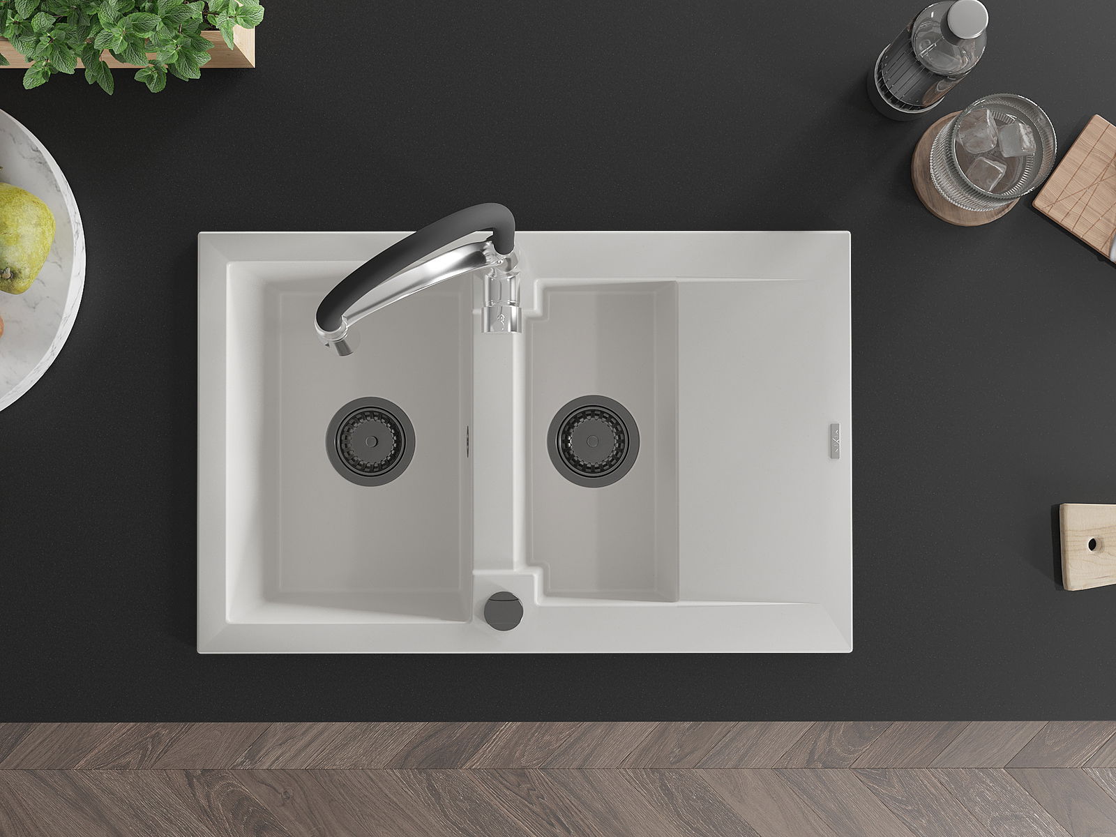 Mexen Gaspar žulový drez 1,5-komorový s odkvapkávacím priestorom a kuchynskou batériou Aster, biely - 6507-20-73450-07-B
