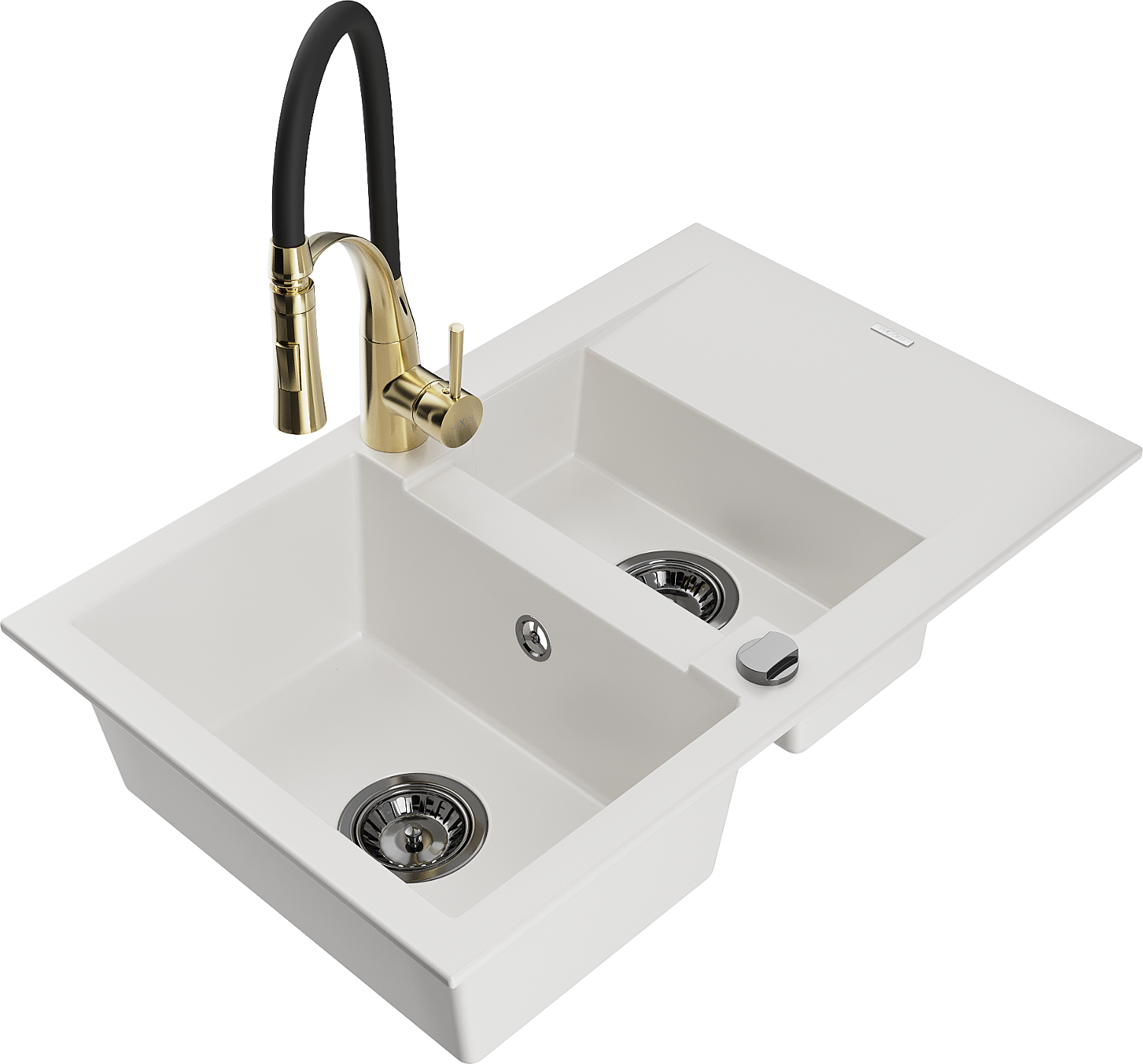 Mexen Gaspar granitový drez 1,5-komorový s odkvapkávačom a kuchynskou batériou Aster, biely - 6507-20-73450-57-B