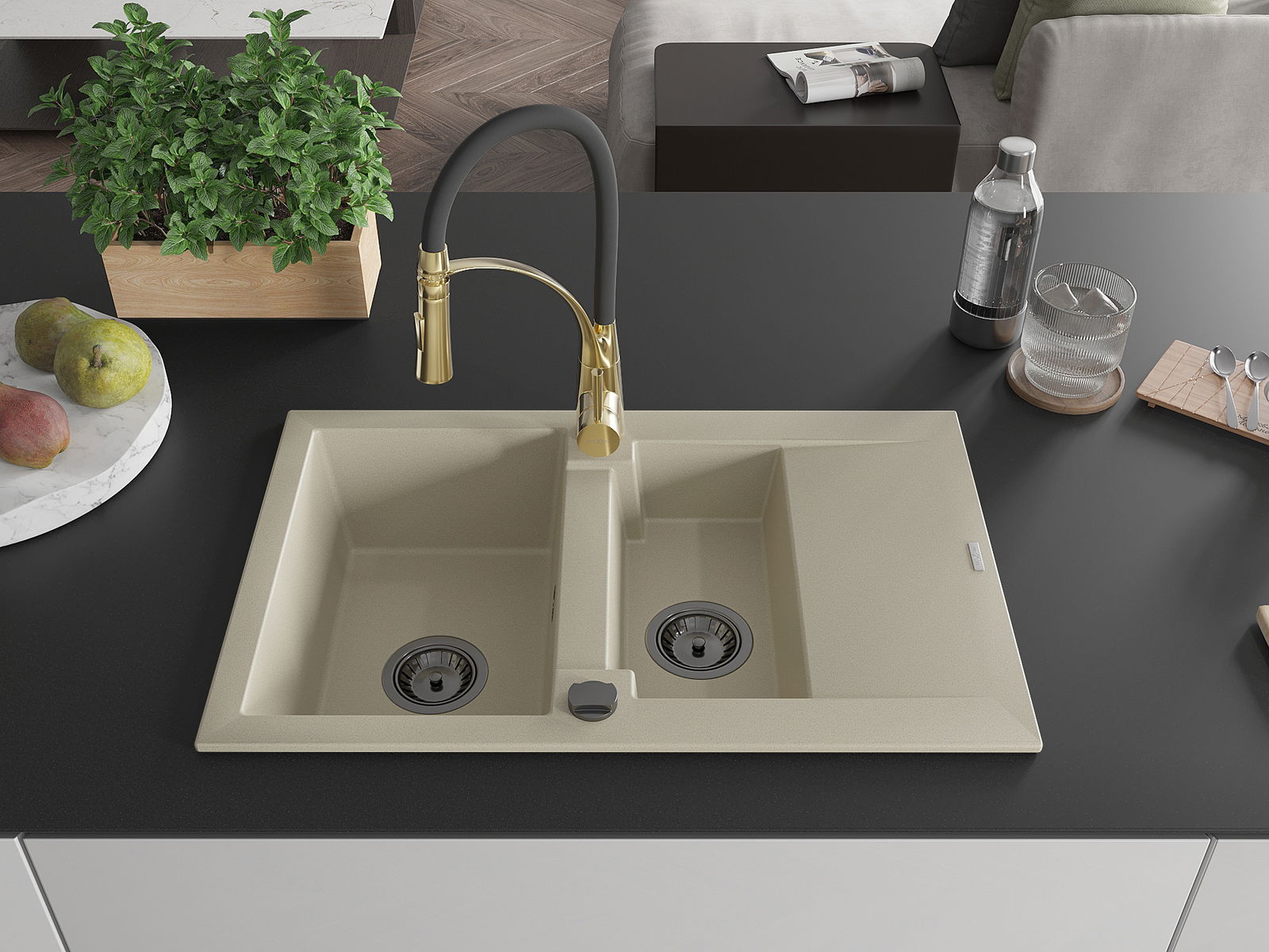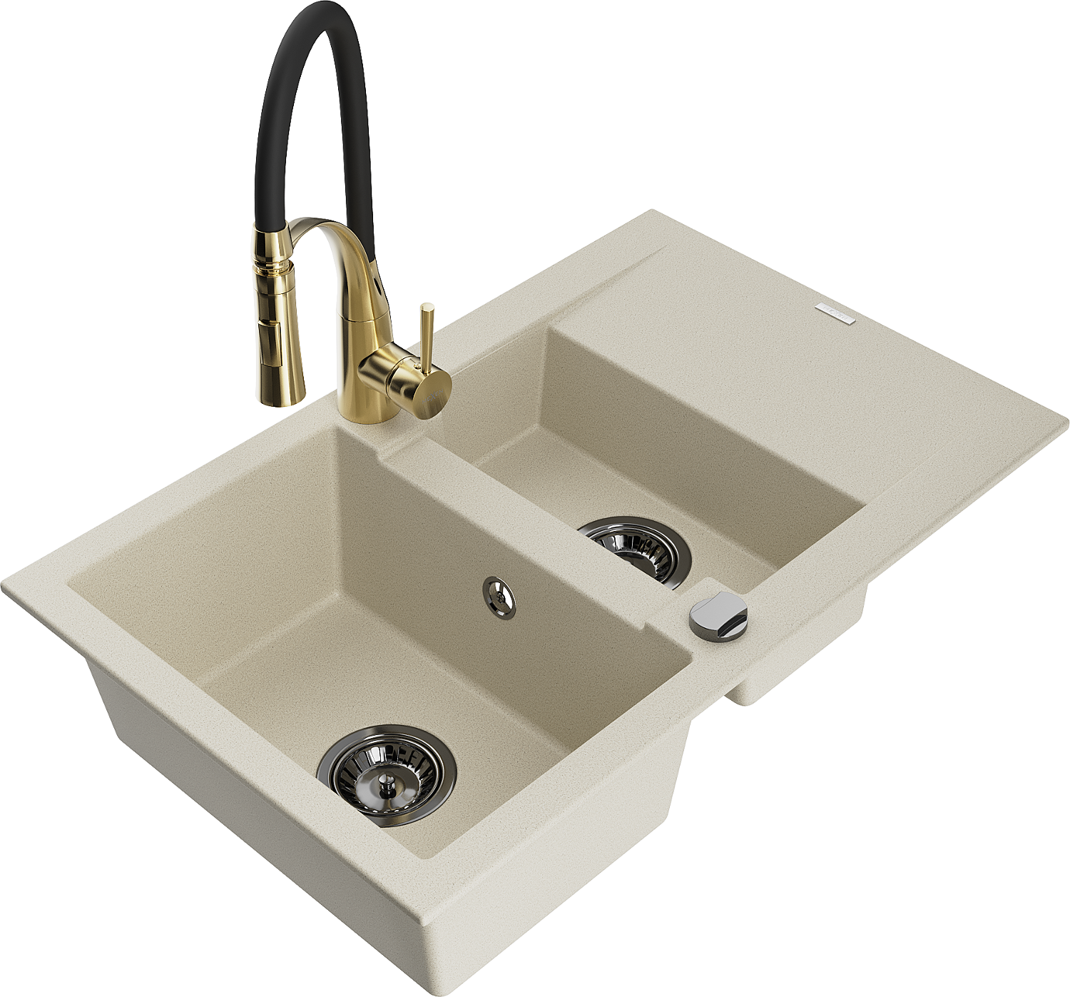 Mexen Gaspar granitový kuchynský drez 1,5-komorový s odkvapkávačom a kuchynskou batériou Aster, béžový - 6507-69-73450-57-B