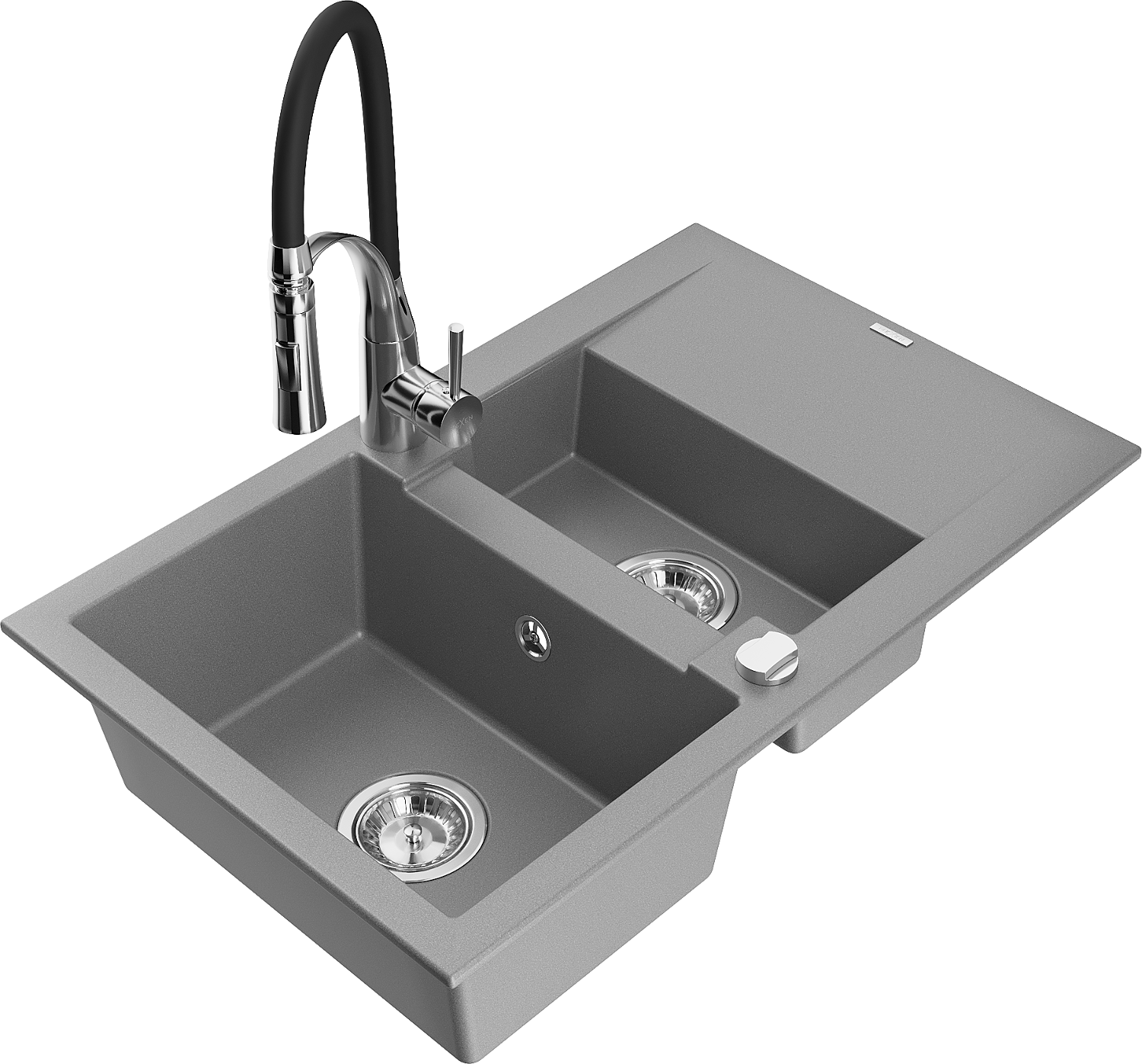 Mexen Gaspar granitový kuchynský drez 1,5-komorový s odkvapkávačom a kuchynskou batériou Aster, sivý - 6507-71-73450-07