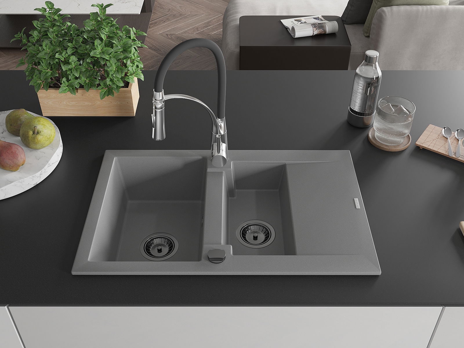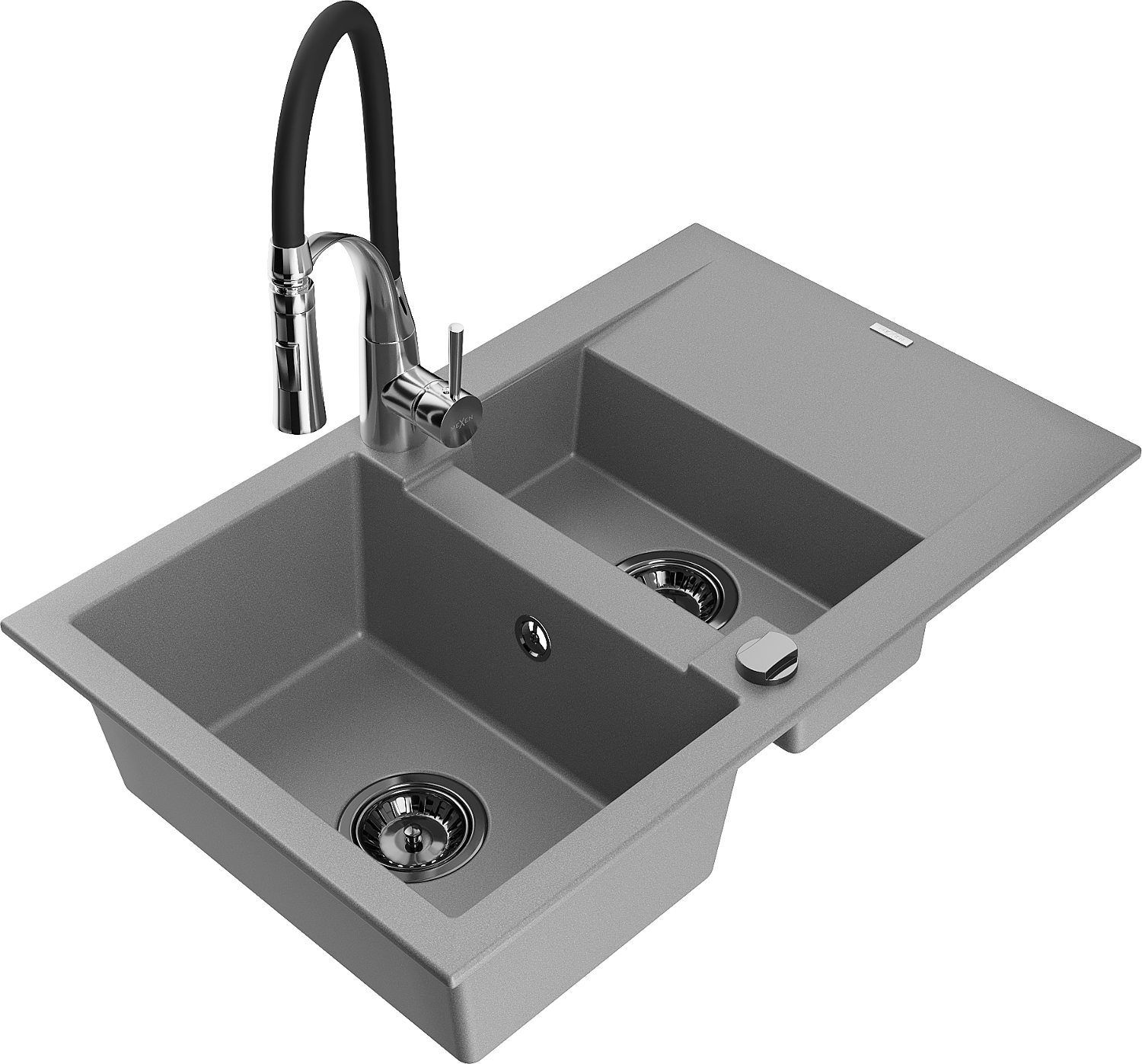 Mexen Gaspar granitový drez 1,5-komorový s odkvapkávačom a kuchynskou batériou Aster, sivý - 6507-71-73450-07-B