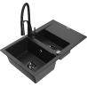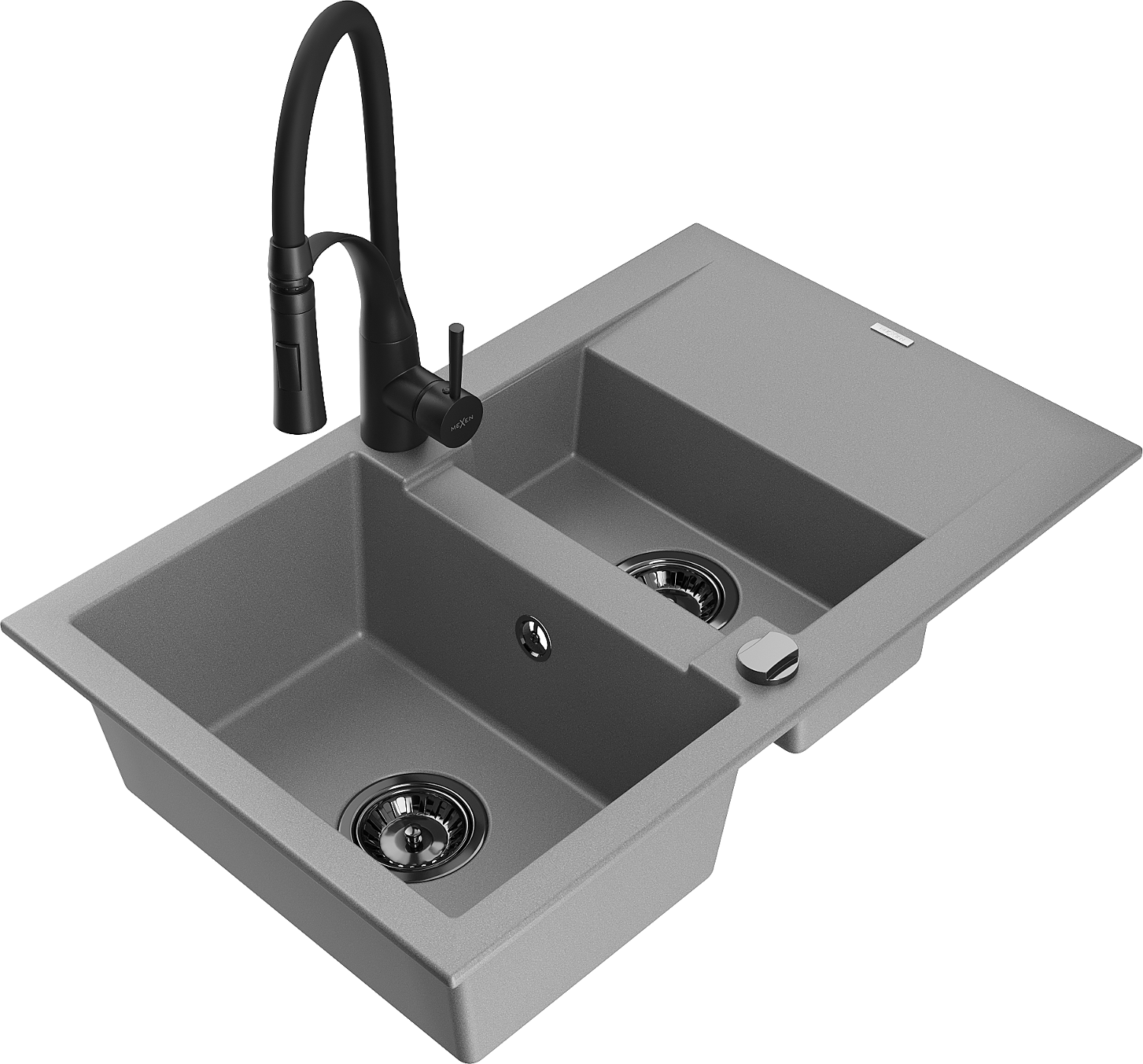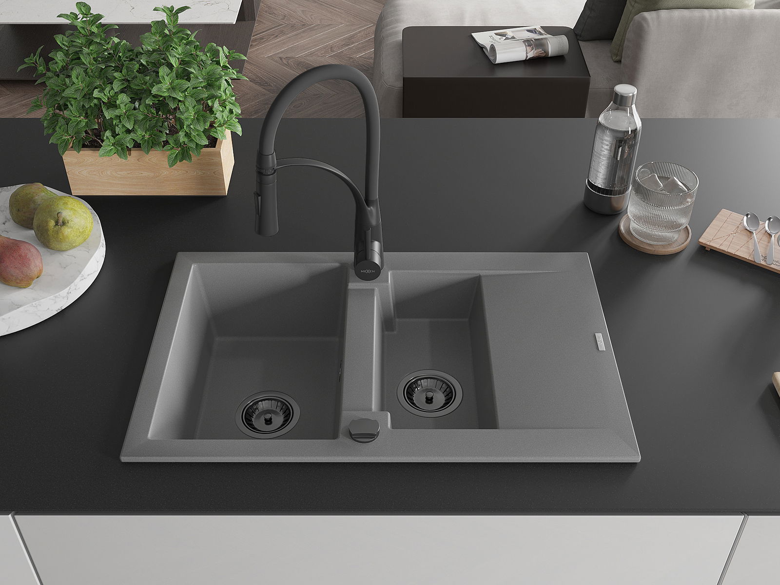 Mexen Gaspar žulový kuchynský drez 1,5-komorový s odkvapkávačom a kuchynskou batériou Aster, sivý - 6507-71-73450-70-B