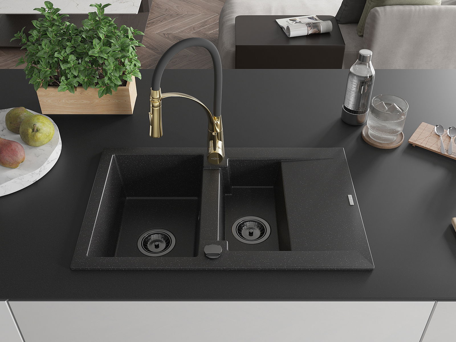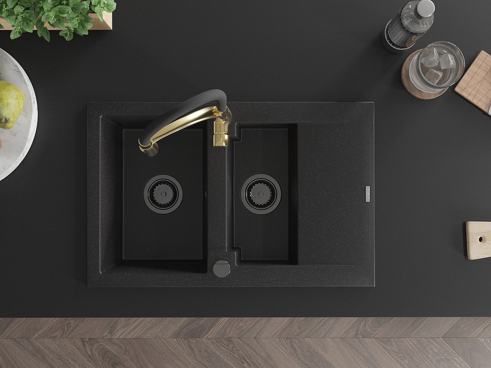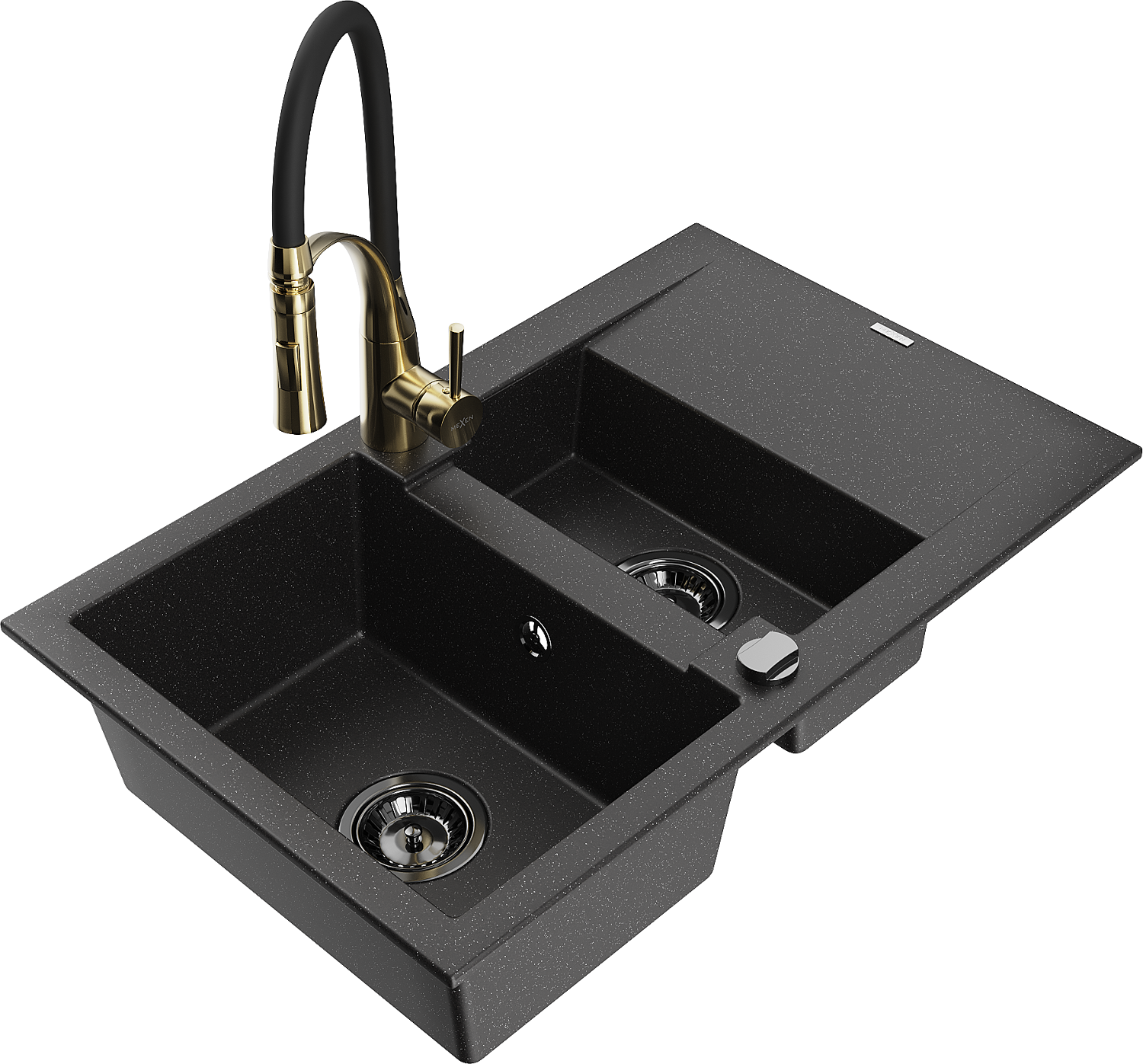 Mexen Gaspar Žulový kuchynský drez s 1,5 komorami, odkvapkávačom a kuchynskou batériou Aster, čierny/strieborný