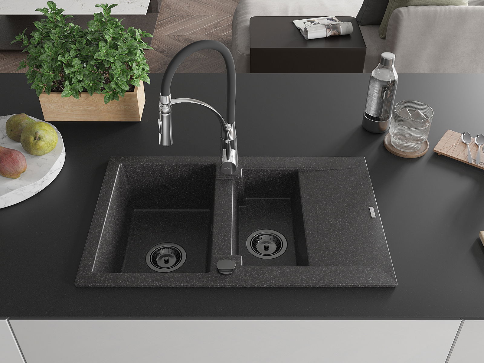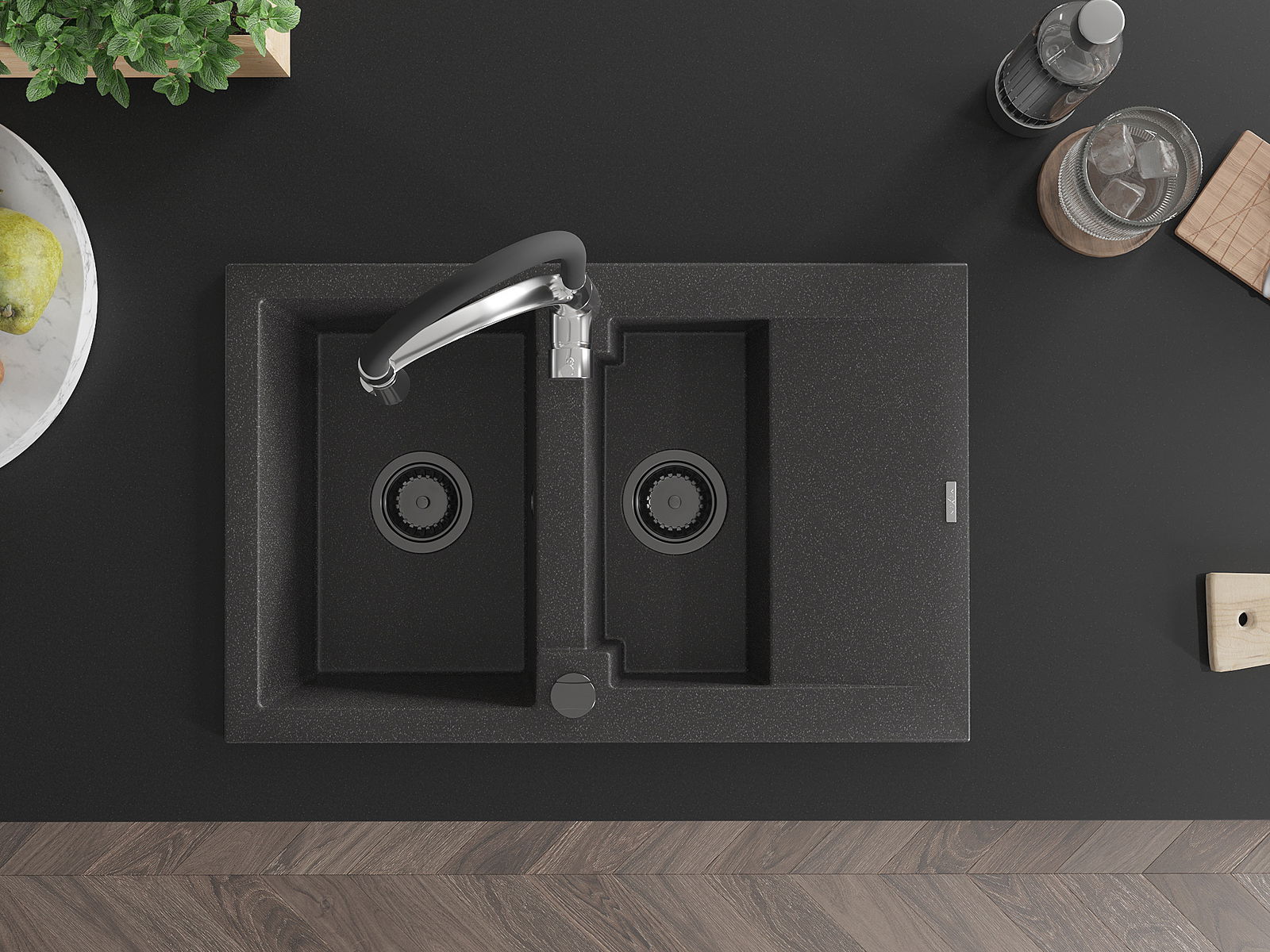 Mexen Gaspar 1,5-komorový granitový drez s odkvapkávačom a kuchynskou batériou Aster, čierny bodkovaný - 6507-76-73450-07-B