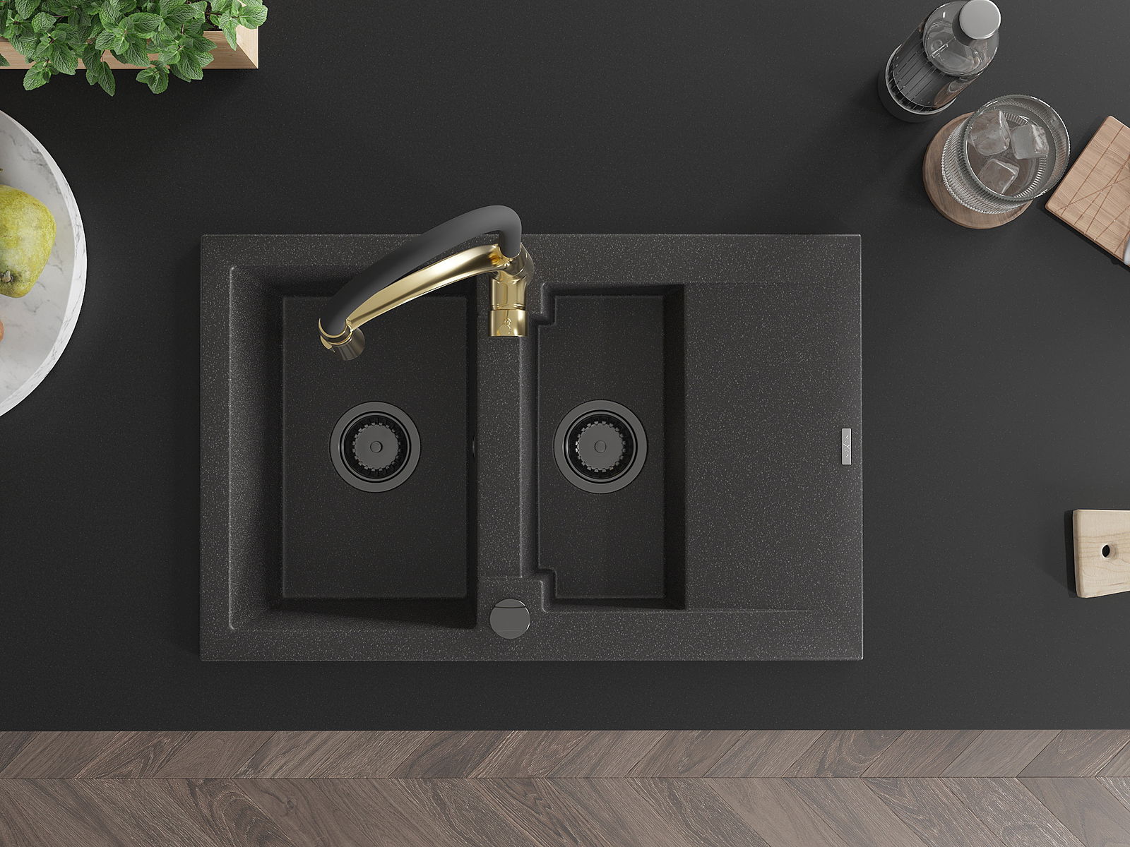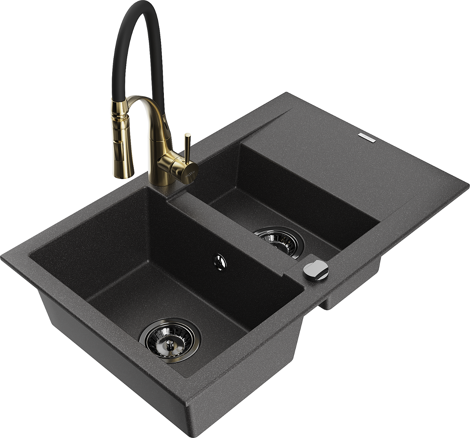 Mexen Gaspar granitový drez 1,5-komorový s odkvapkávačom a kuchynskou batériou Aster, čierny škvrnitý - 6507-76-73450-57-B