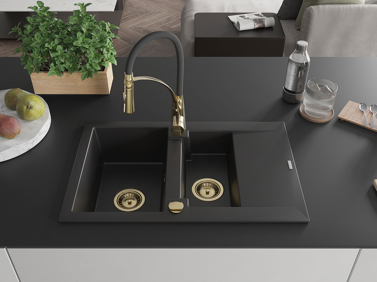 Mexen Gaspar žulový drez 1,5-komorový s odkvapkávačom a kuchynskou batériou Aster, čierny - 6507-77-73450-57-G