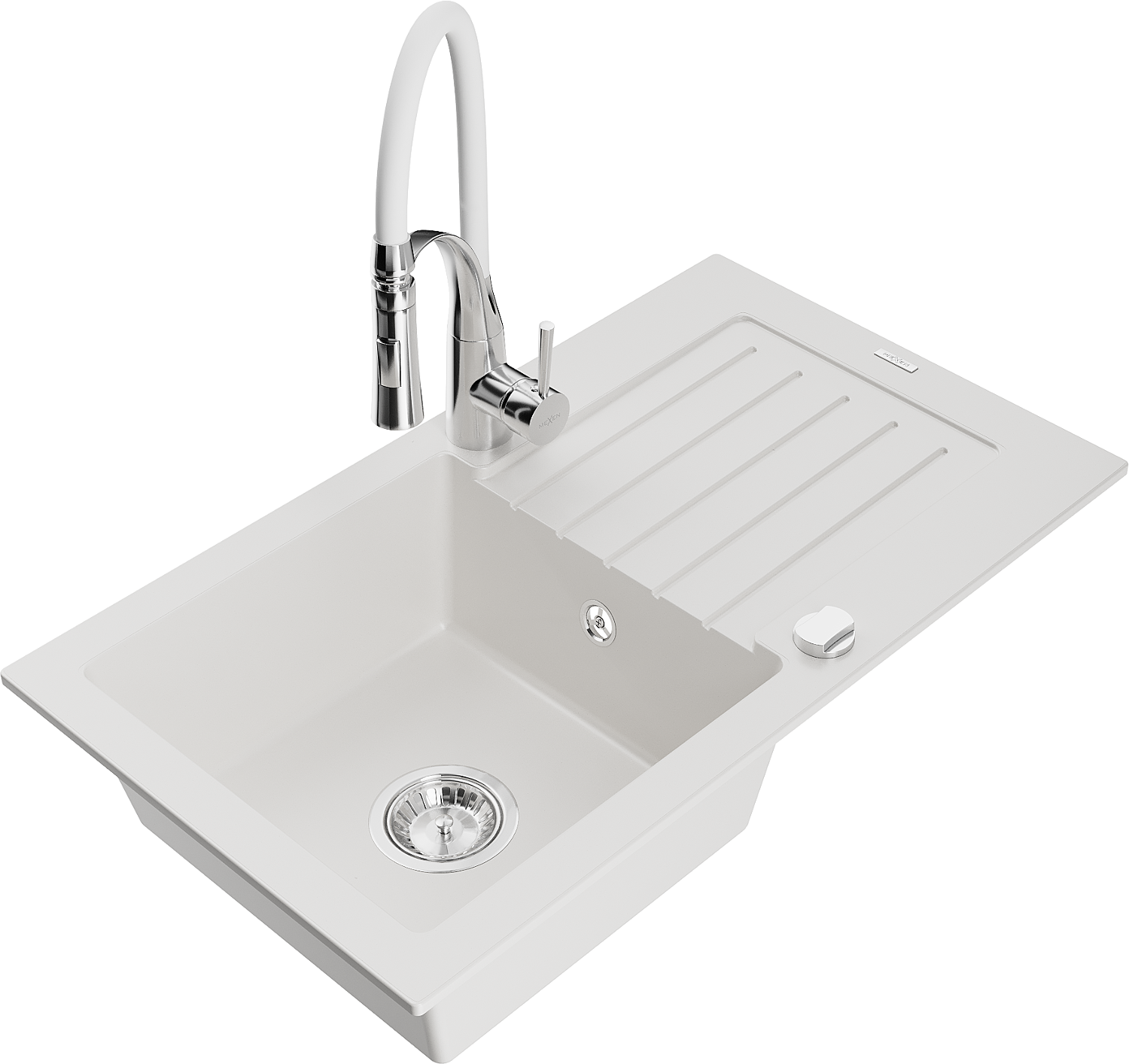 Mexen Pablo kuchynský granitový drez s 1 komorou a odkvapávačom a kuchynskou batériou Aster, biely - 6510-20-73450-02