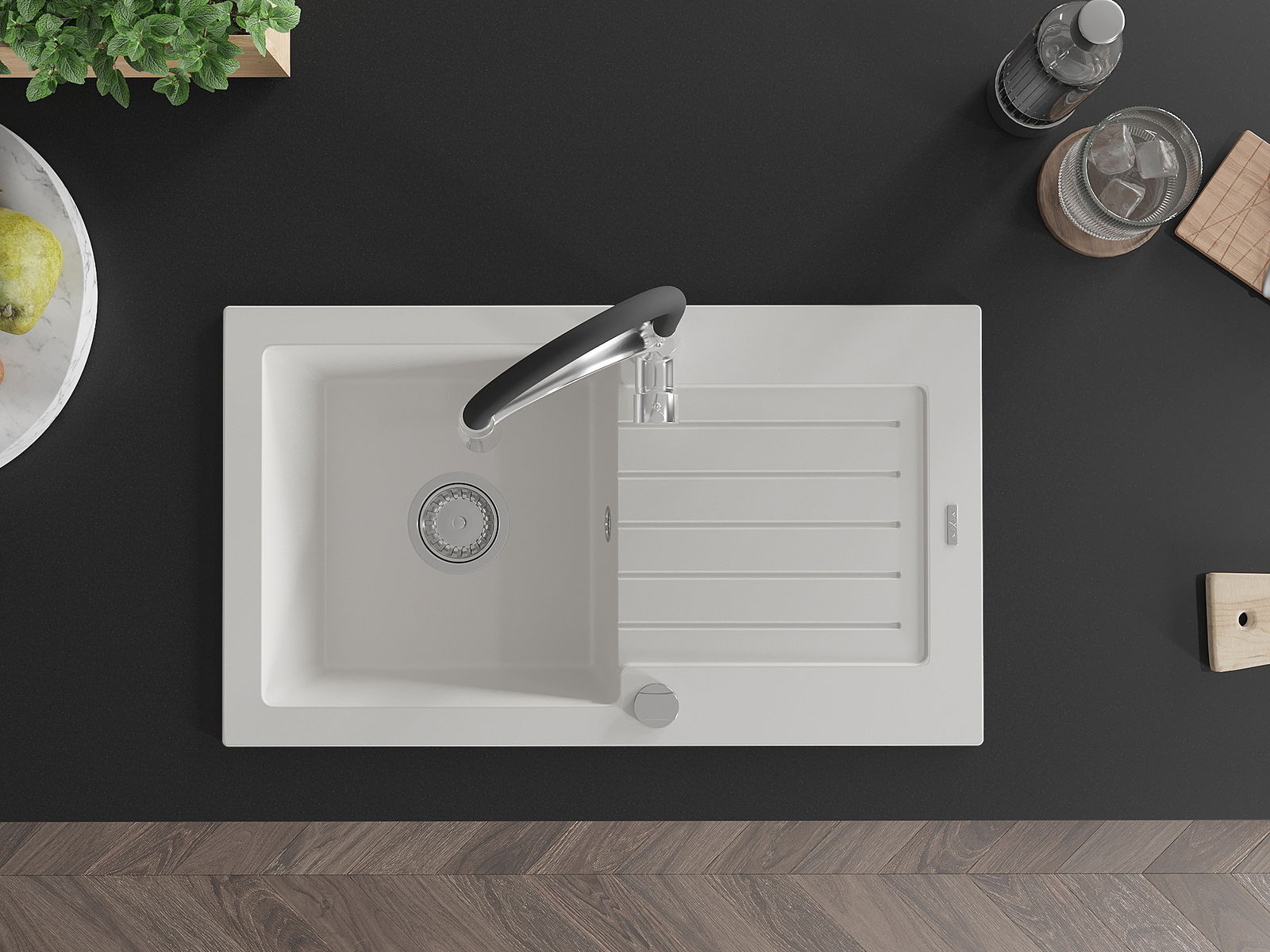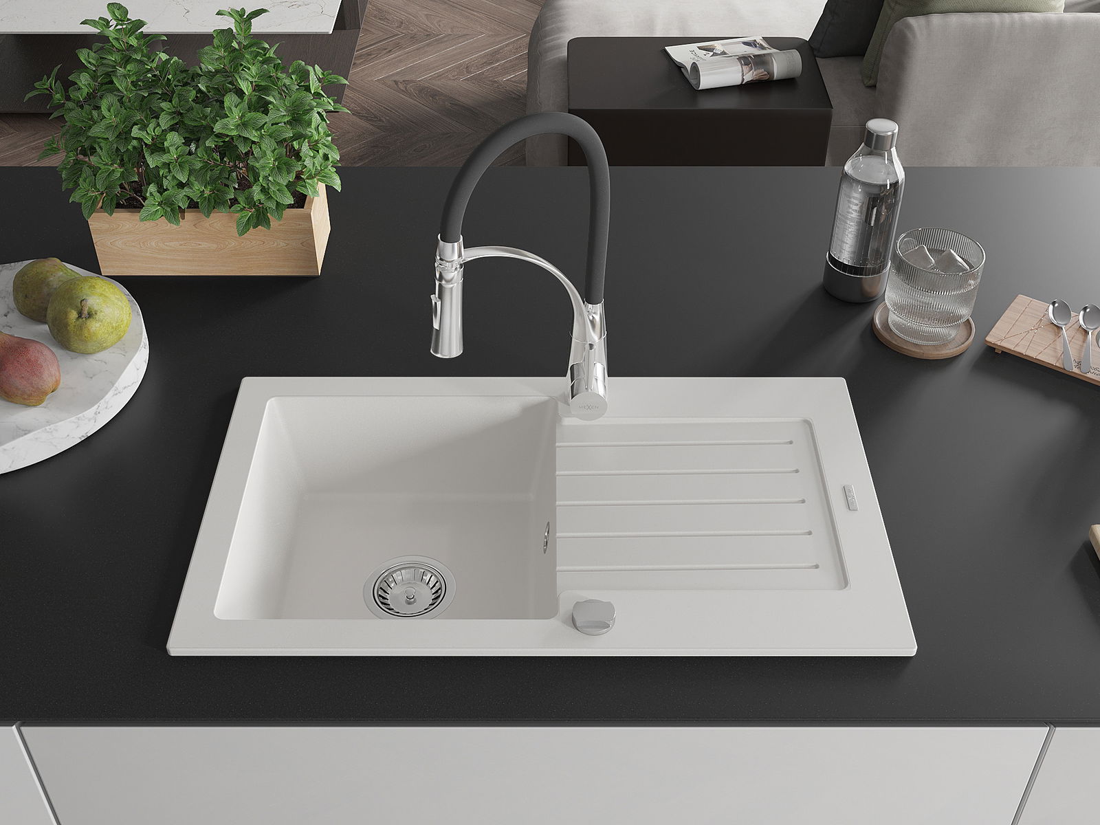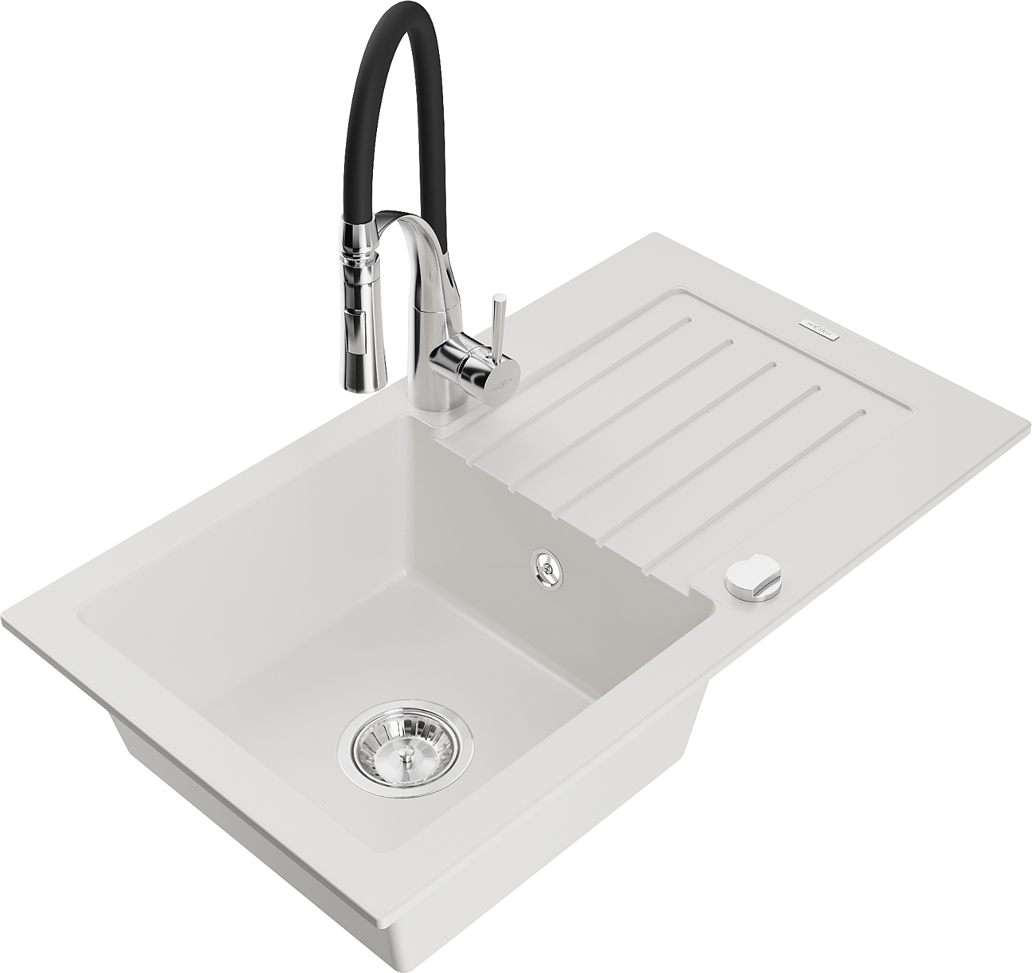 Mexen Pablo granitový drez s 1 komorou s odkvapkávačom a kuchynskou batériou Aster, biely - 6510-20-73450-07