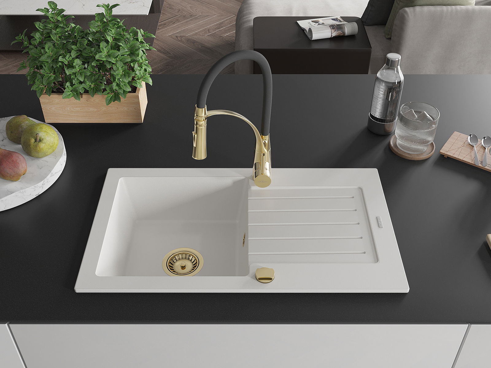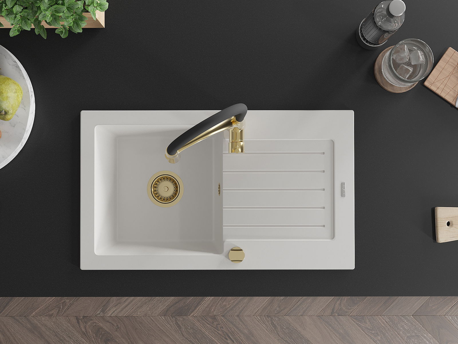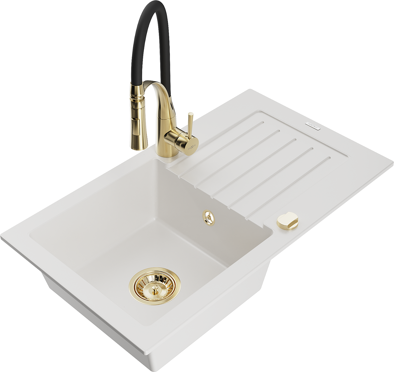 Mexen Pablo granitový drez 1-komorový s odkvapkávacom a kuchynskou batériou Aster, biely - 6510-20-73450-57-G