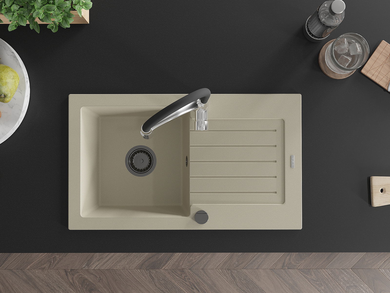 Povrch kuchynského drezu je odolný voči škvrnám a zafarbeniu, vďaka čomu sa ľahko udržiava a zachováva svoju farbu počas dlhého obdobia používania. Estetický a praktický doplnok pre každú kuchyňu.