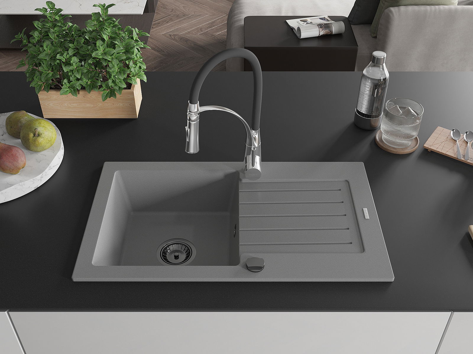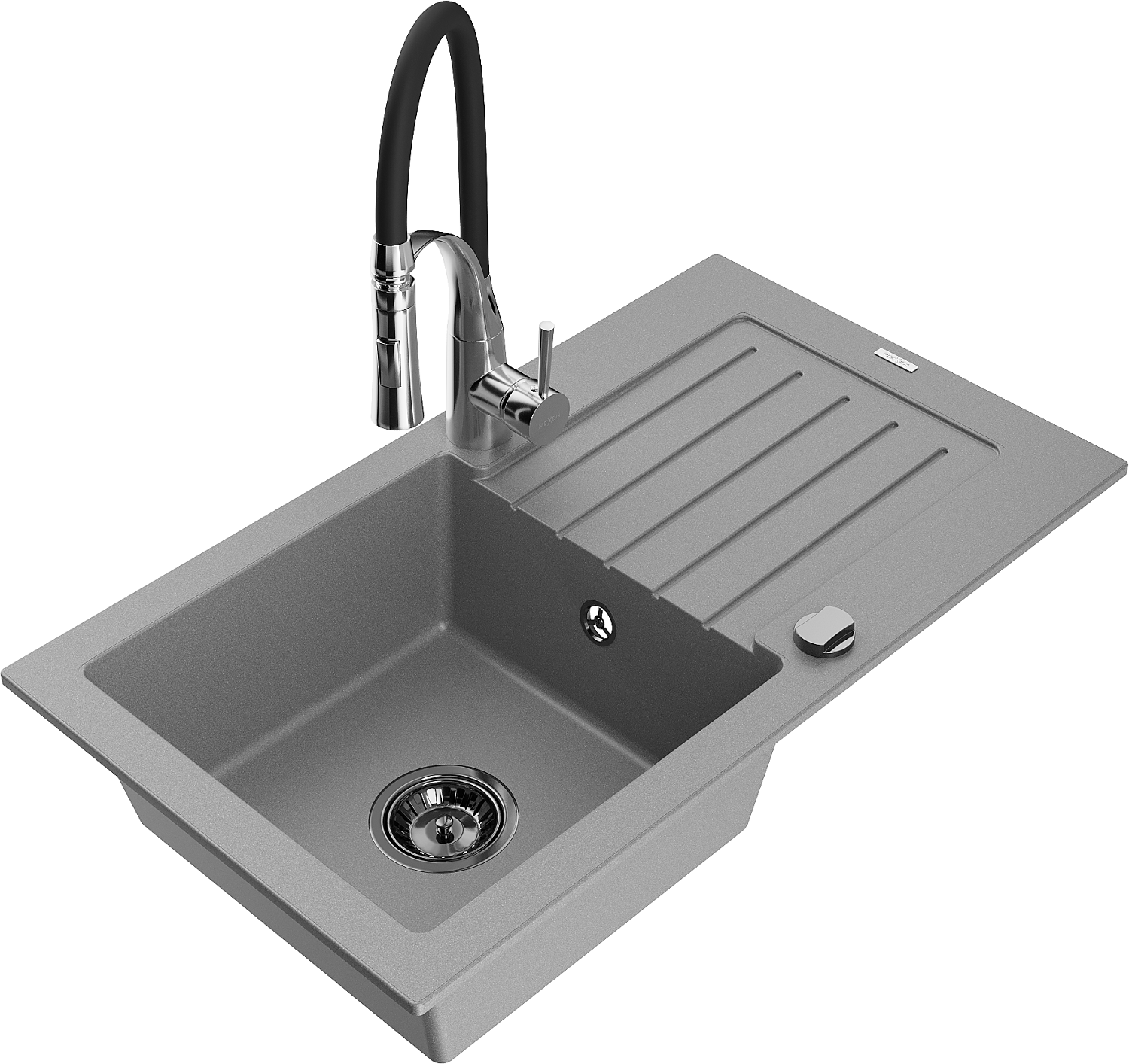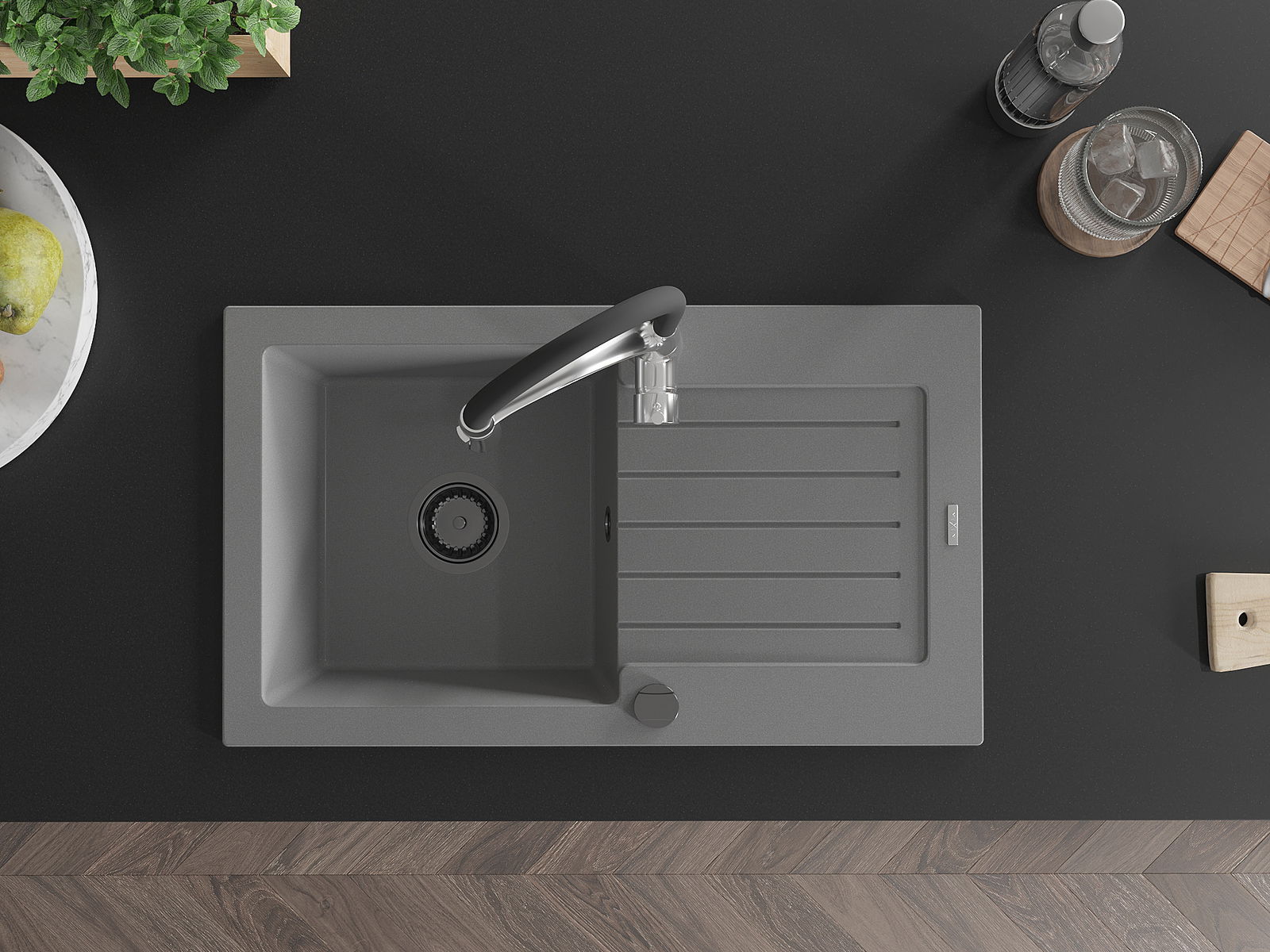 Mexen Pablo granitový kuchynský drez 1-komorový s odkvapkávačom a kuchynskou batériou Aster, šedý - 6510-71-73450-07-B