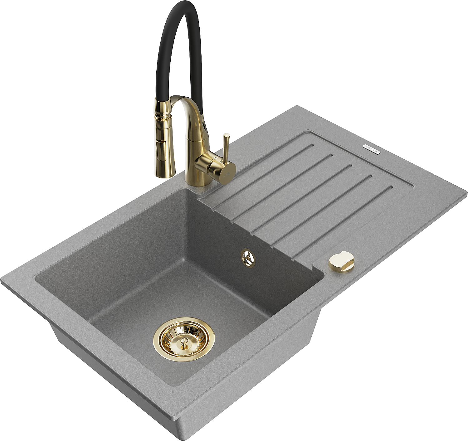 Mexen Pablo granitový drez s 1 komorou a odkvapkávačom a kuchynskou batériou Aster, sivý - 6510-71-73450-57-G