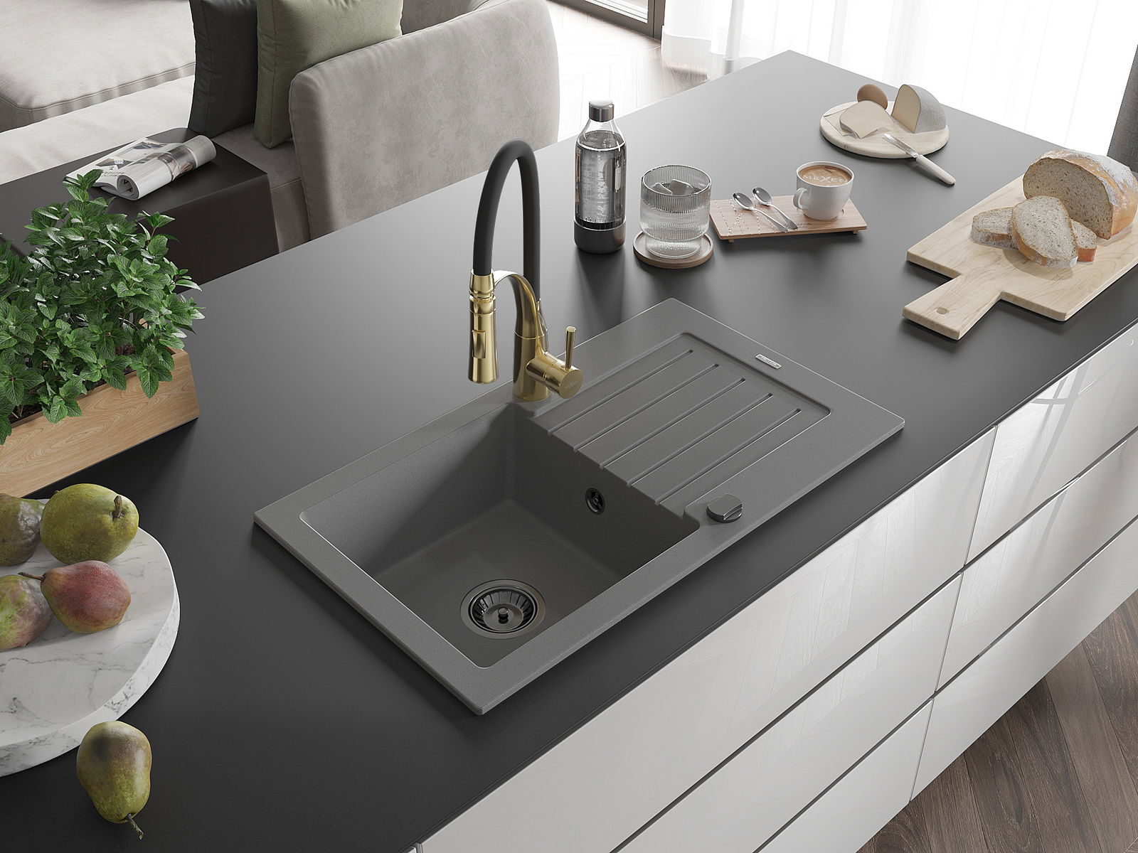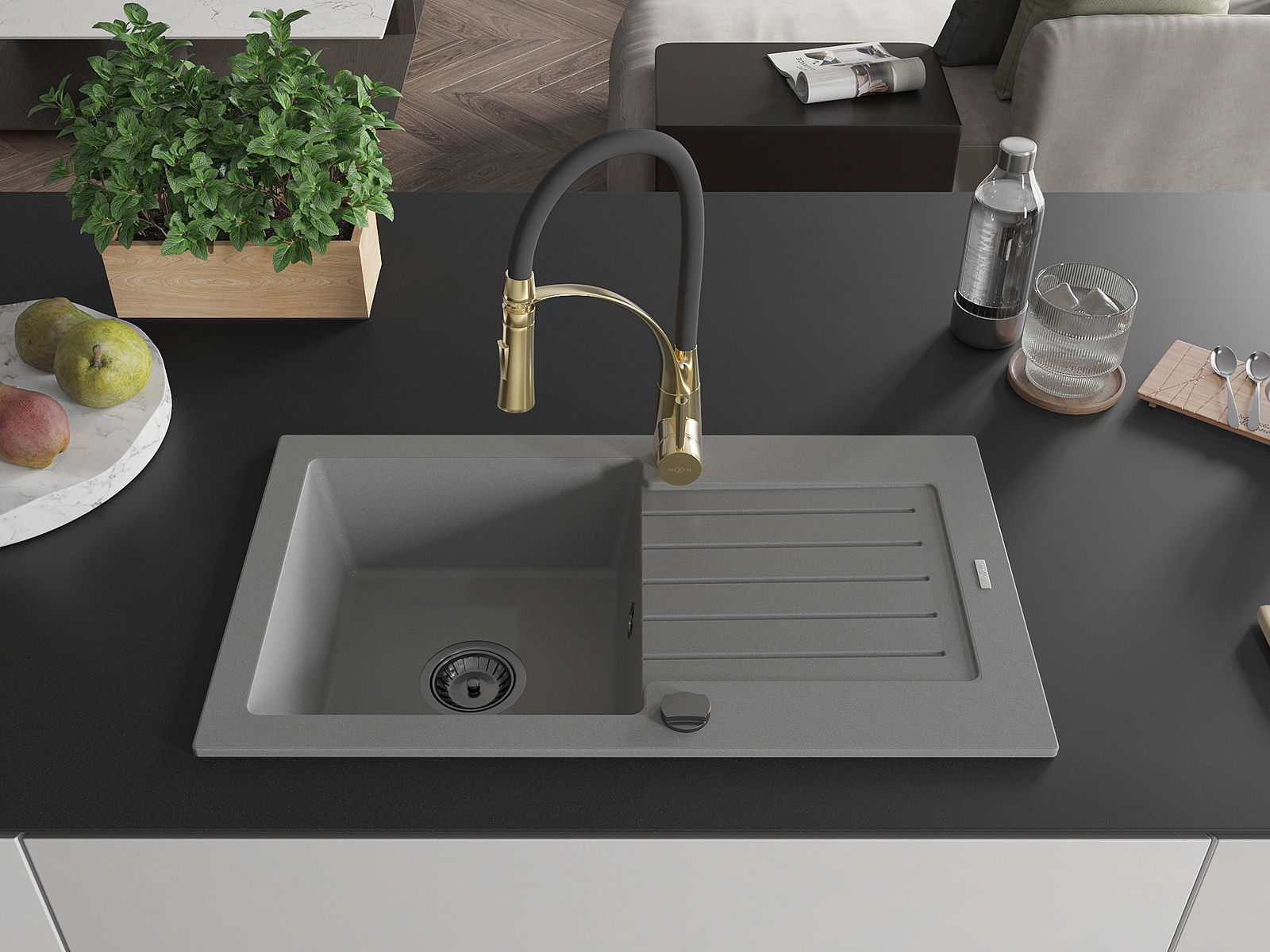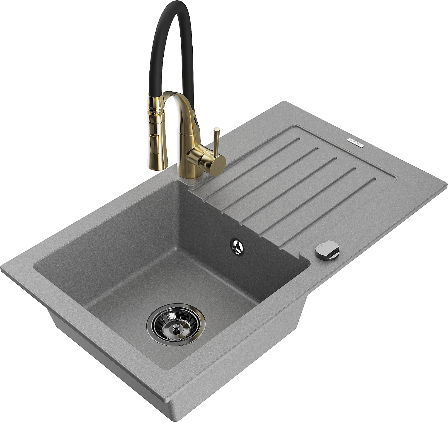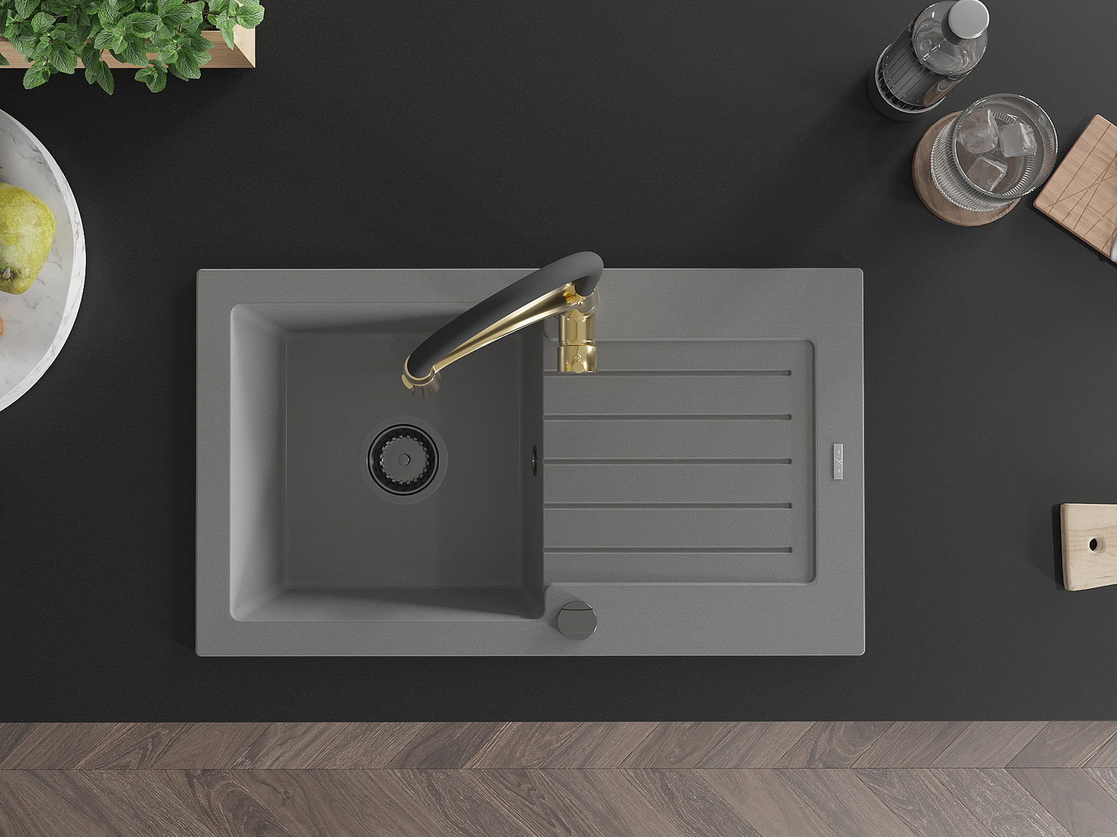 Mexen Pablo granitový drez 1-komorový s odkvapkávačom a kuchynskou batériou Aster, sivý - 6510-71-73450-57-B
