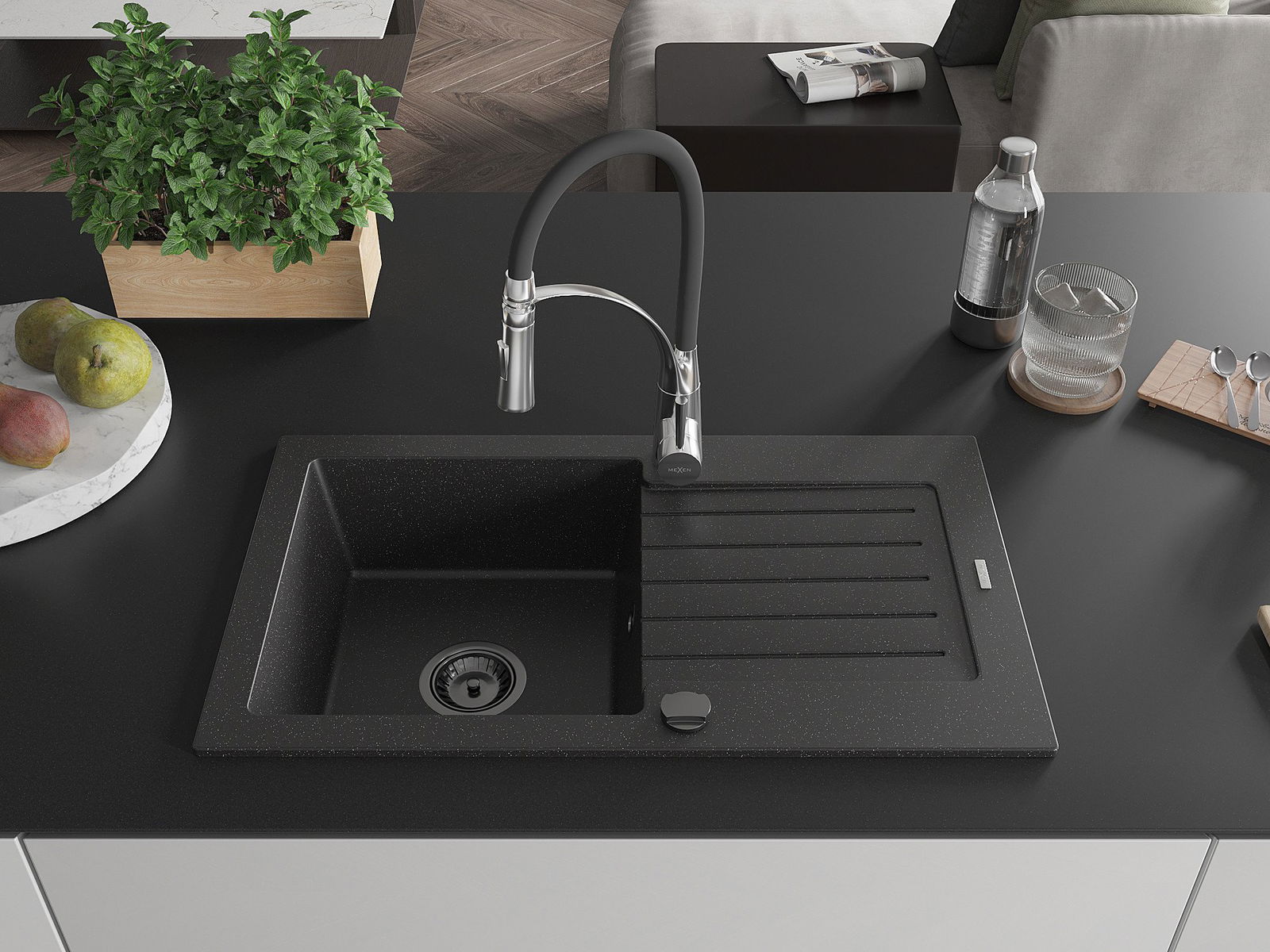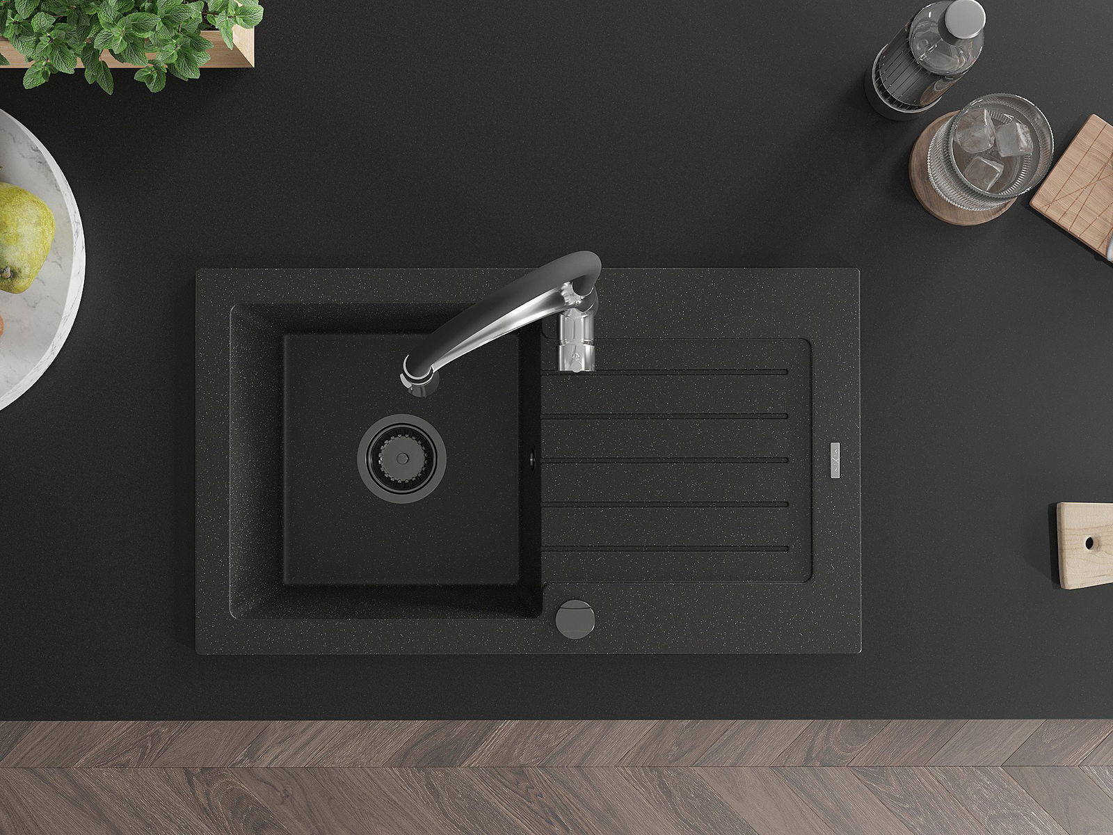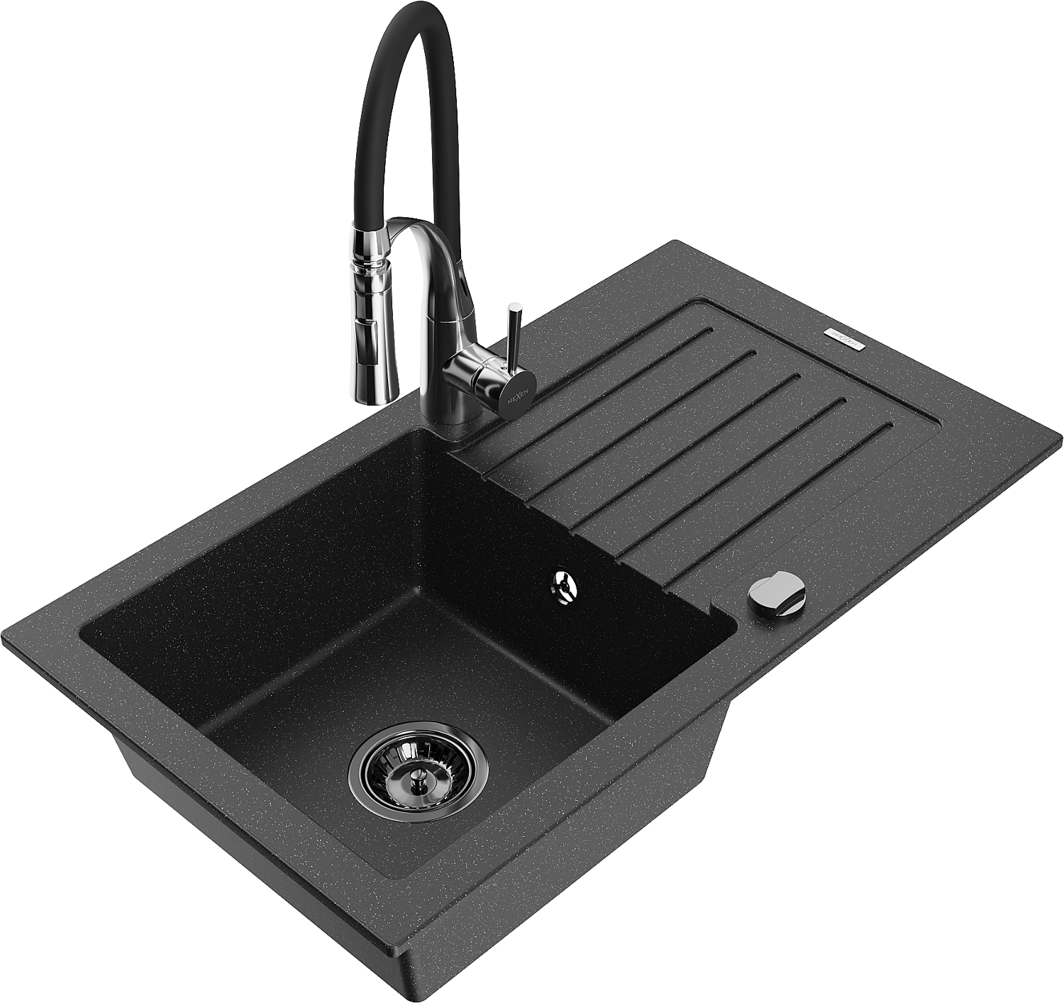 Mexen Pablo granitový drez s 1 komorou, odkvapkávačom a kuchynskou batériou Aster, čierny/strieborný metalik