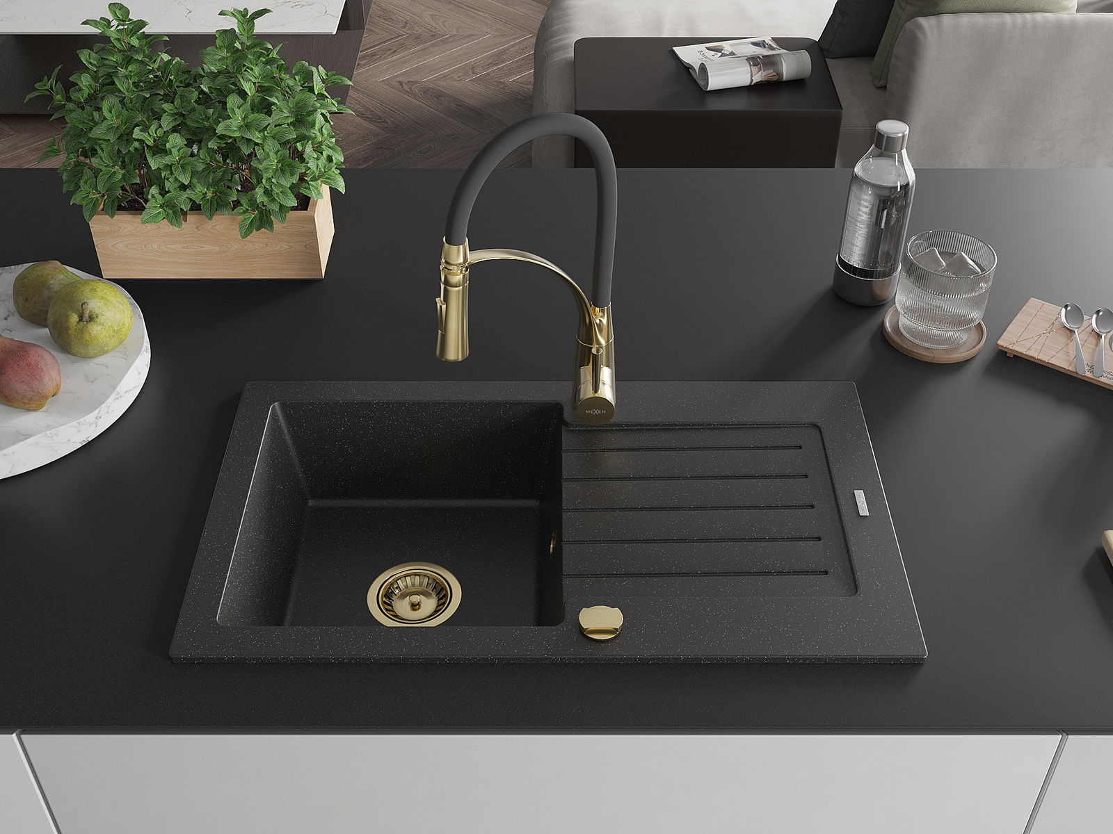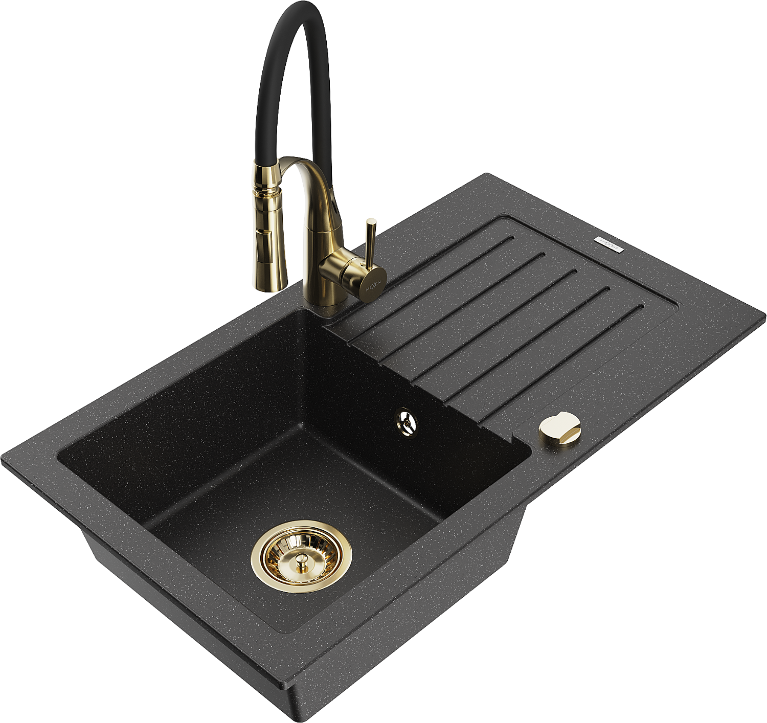 Mexen Pablo granitový kuchynský drez 1-komorový s odkvapkávačom a kuchynskou batériou Aster, čierna/strieborný metalik