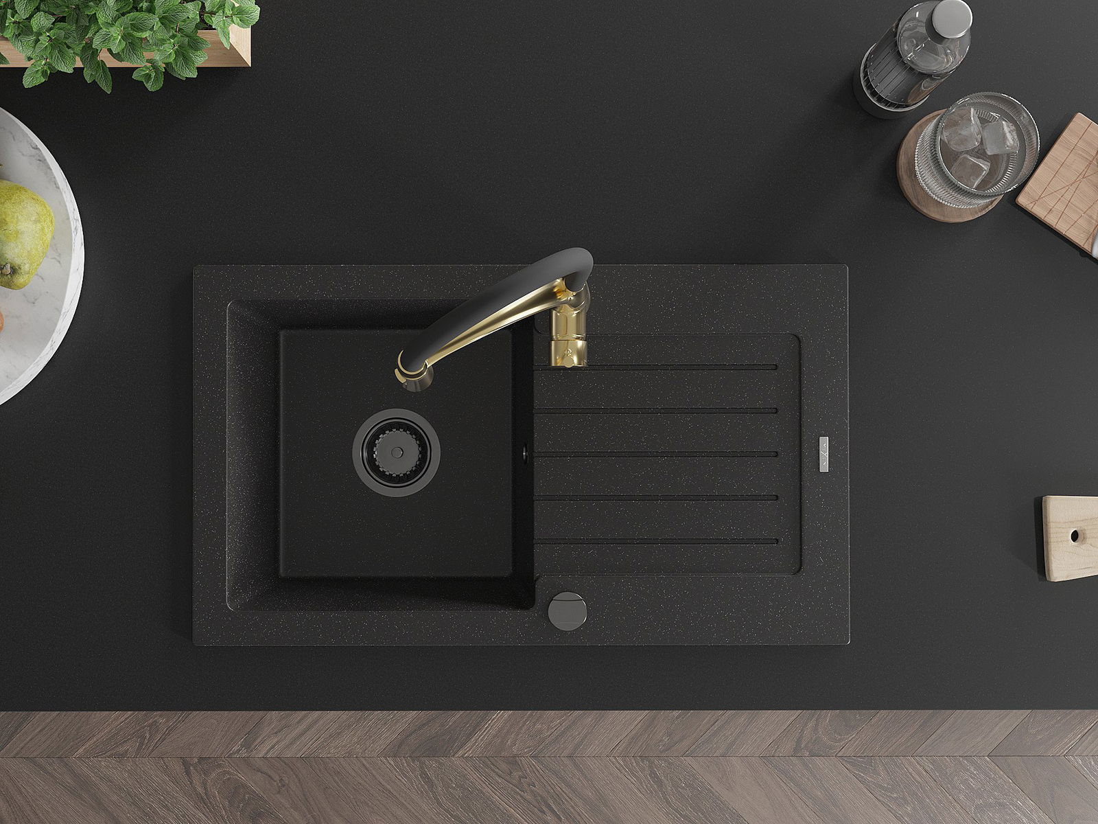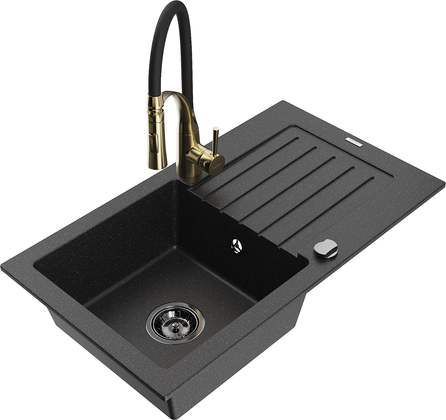 Mexen Pablo granitový drez 1-komorový s odkvapkávačom a kuchynskou batériou Aster, čierny/strieborný metalik