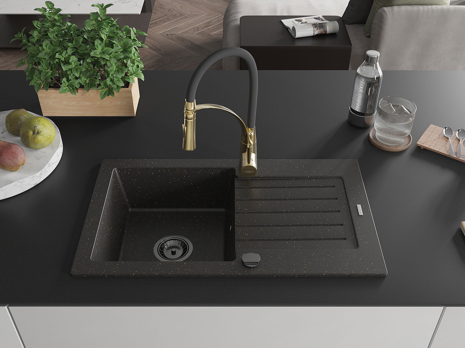 Mexen Pablo žulový drez s 1 komorou, odkvapkávačom a kuchynskou batériou Aster, čierny/zlatý metalický - 6510-75-73450-57-B