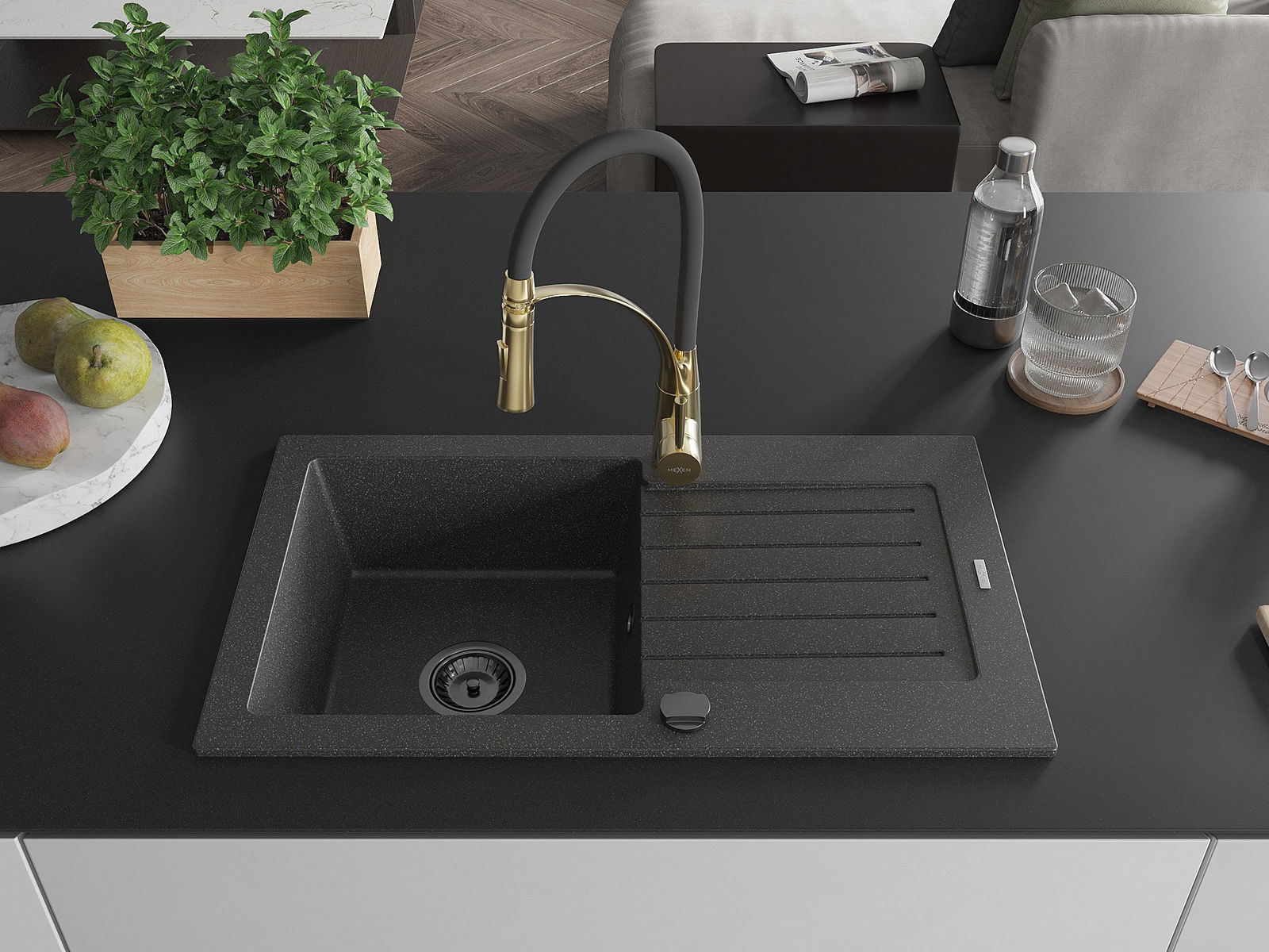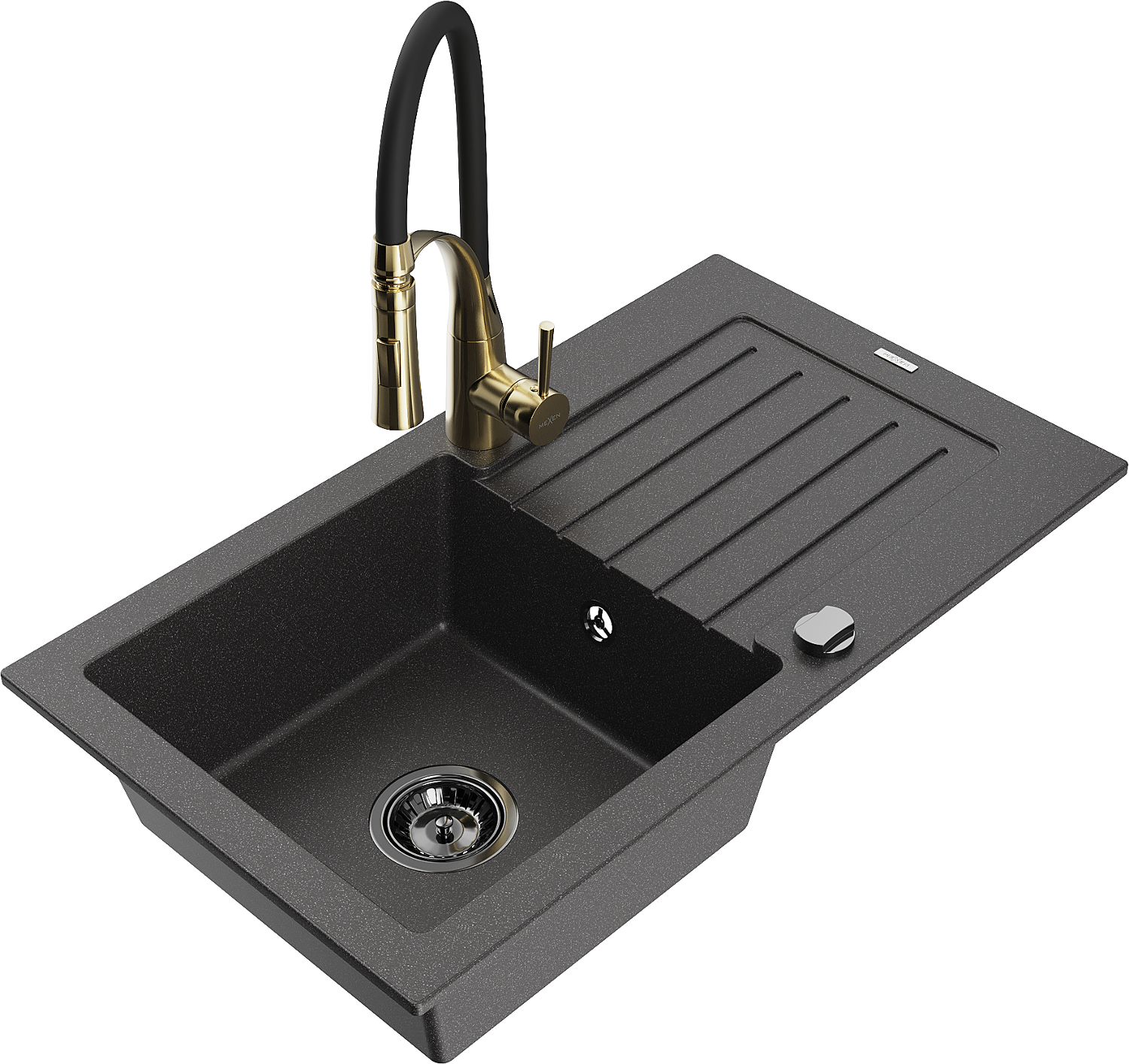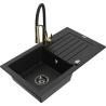 Mexen Pablo žulový drez s jednou komorou s odkvapkávačom a kuchynskou batériou Aster, čierny škvrnitý