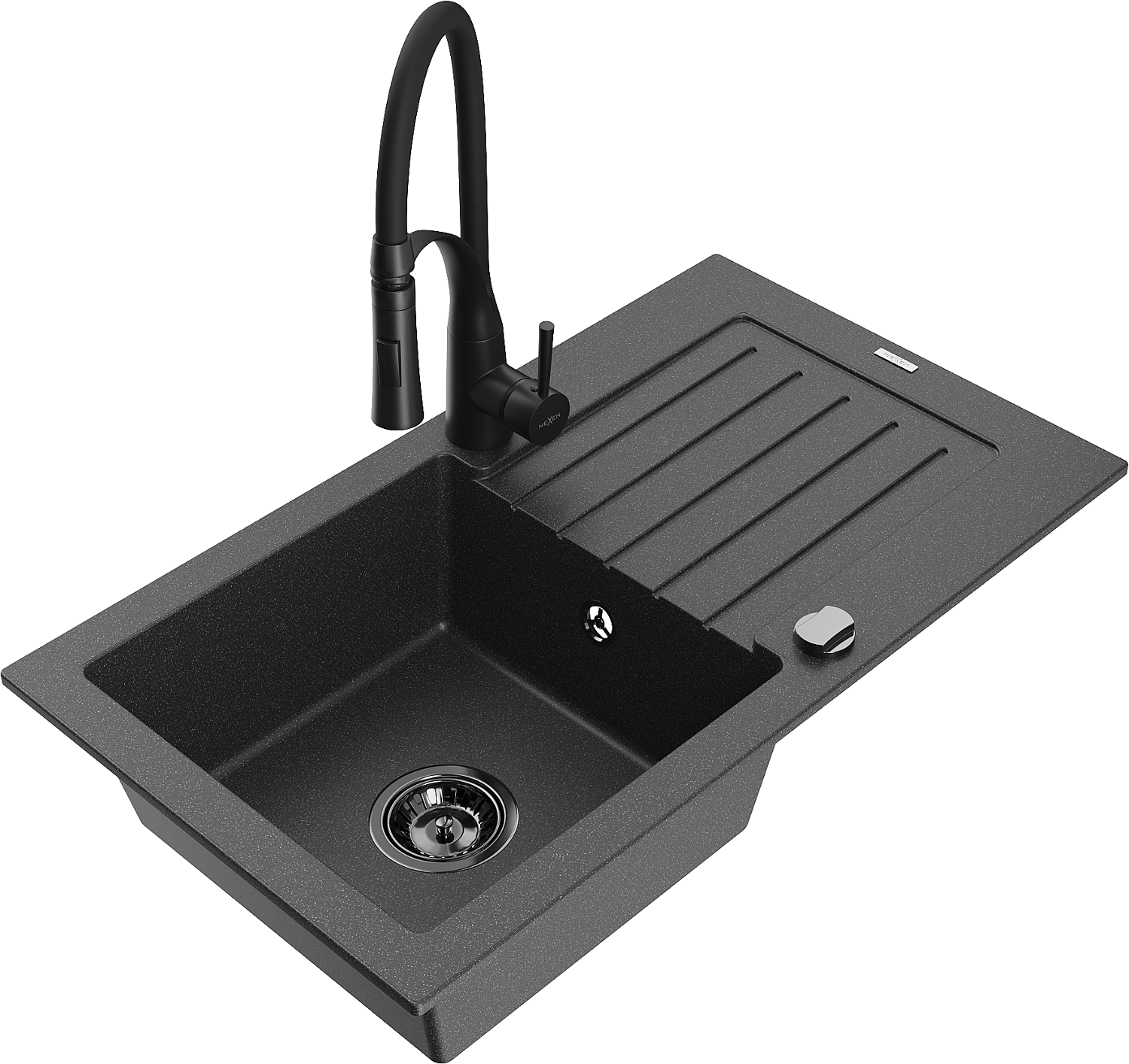Mexen Pablo granitový drez 1-komorový s odkvapkávacou plochou a kuchynskou batériou Aster, čierny škvrnitý - 6510-76-73450-70-B