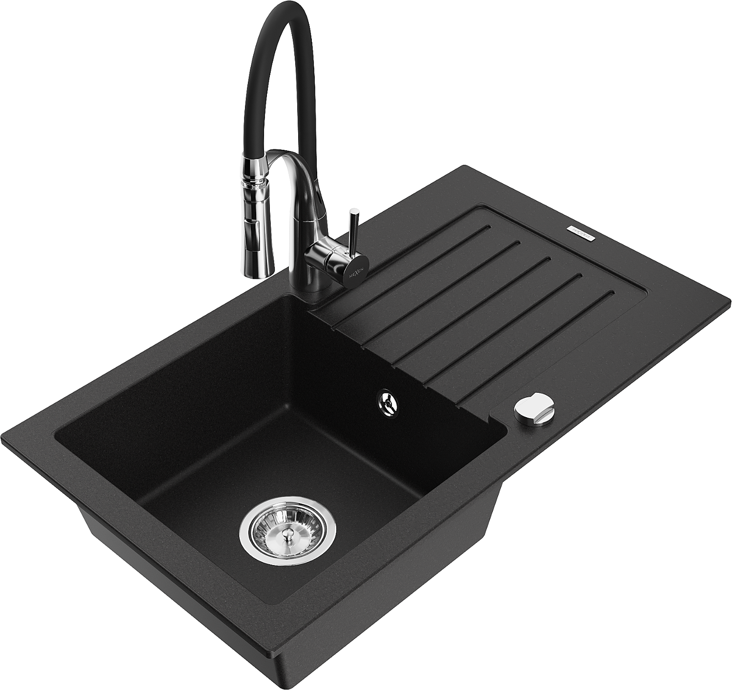 Mexen Pablo granitový drez s 1 komorou, odkvapkávačom a kuchynskou batériou Aster, čierny - 6510-77-73450-07